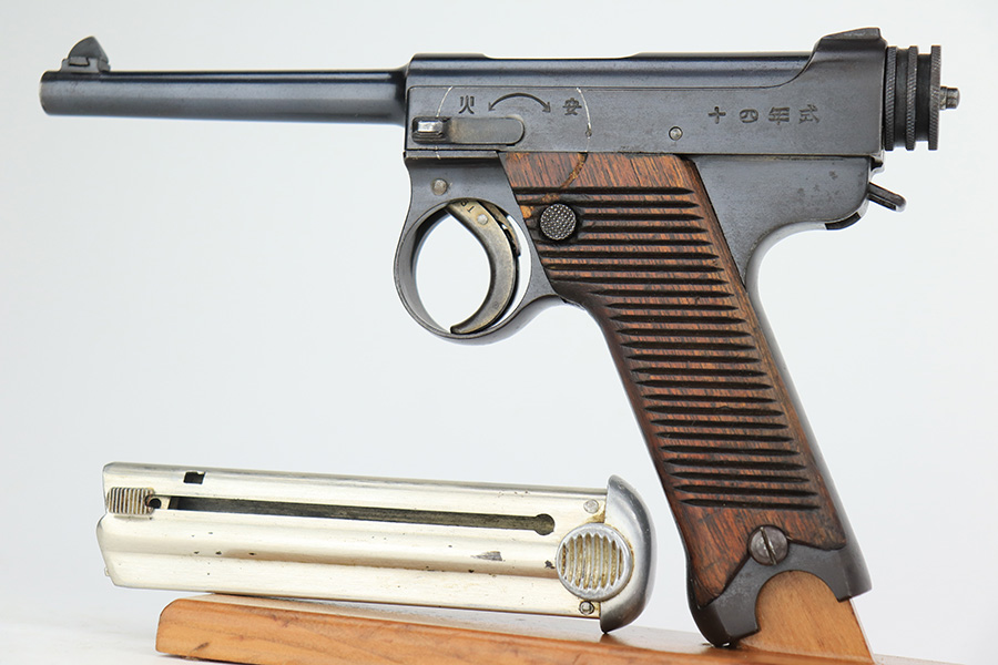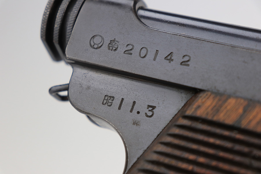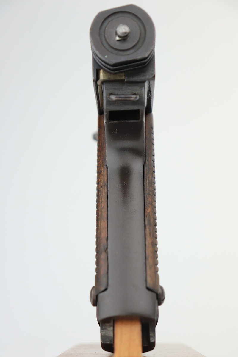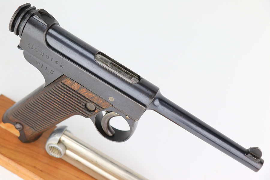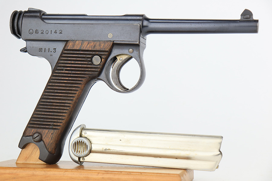 4/5/23 – This is an excellent example of a Nambu Type 14 issued to the Japanese military in 1936. The gun is mismatched but does come with one original matching numbered magazine. There is virtually no actual finish loss, but there is light brown patina throughout and some minor pitting on the grip straps. Fitted with very nice period-correct wood grips – no visible numbering. Minty bore.