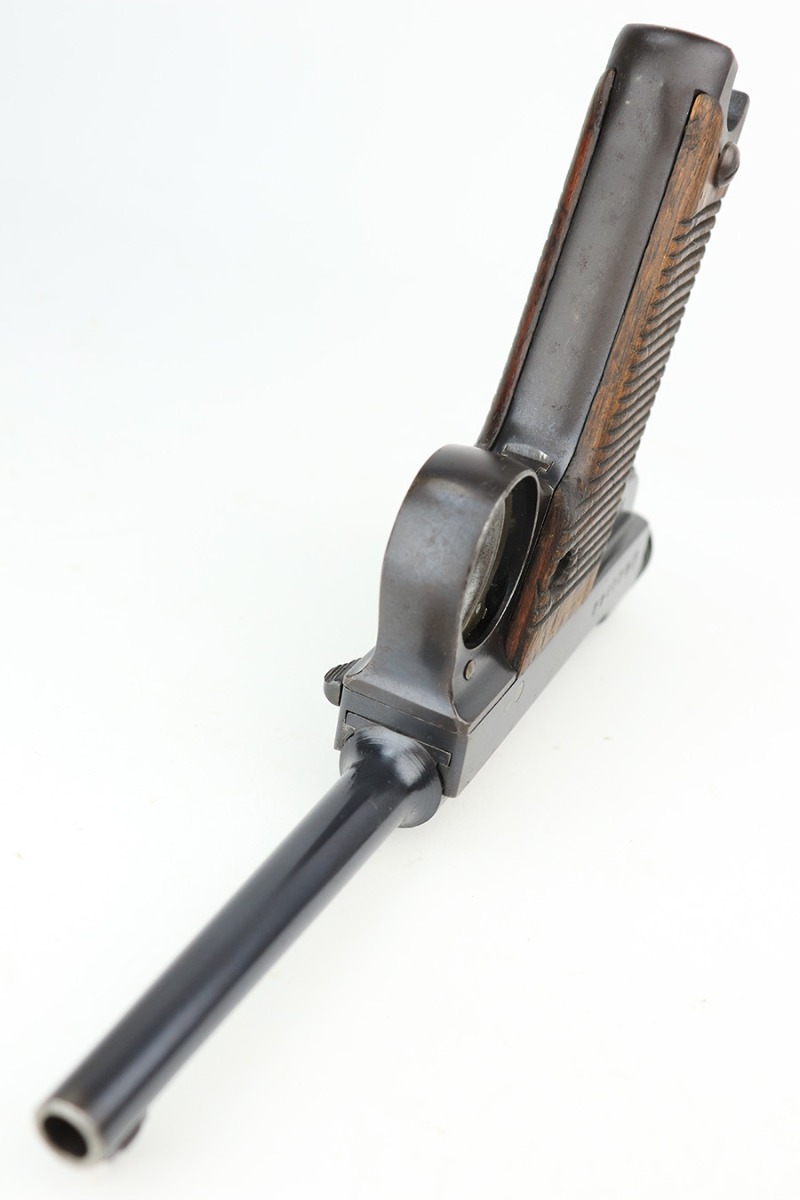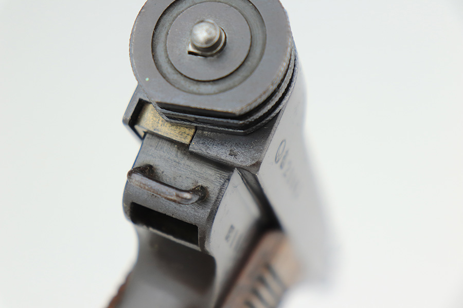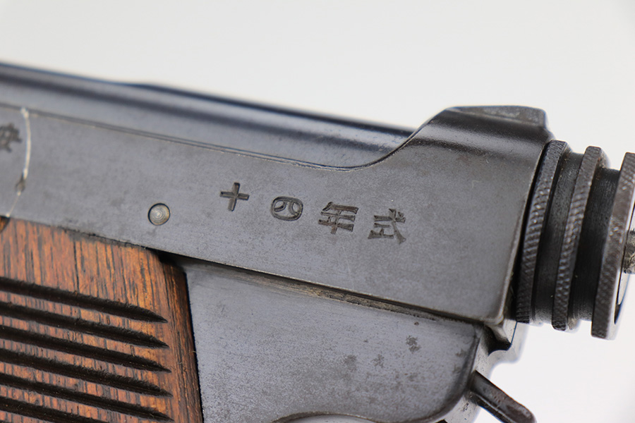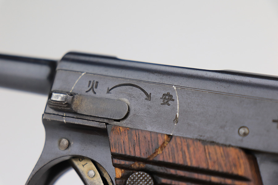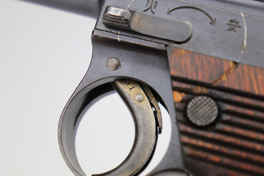 4/5/23 – This is an excellent example of a Nambu Type 14 issued to the Japanese military in 1936. The gun is mismatched but does come with one original matching numbered magazine. There is virtually no actual finish loss, but there is light brown patina throughout and some minor pitting on the grip straps. Fitted with very nice period-correct wood grips – no visible numbering. Minty bore.