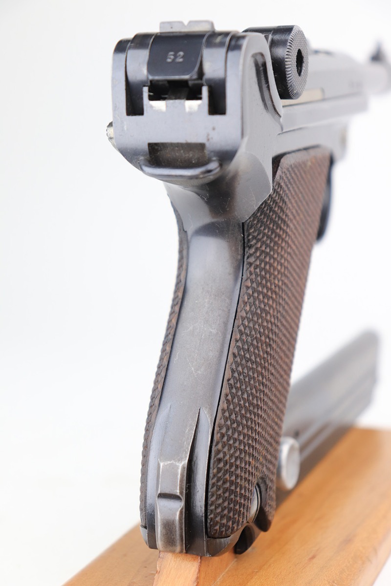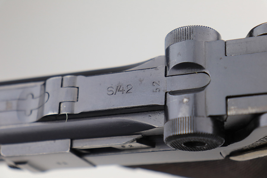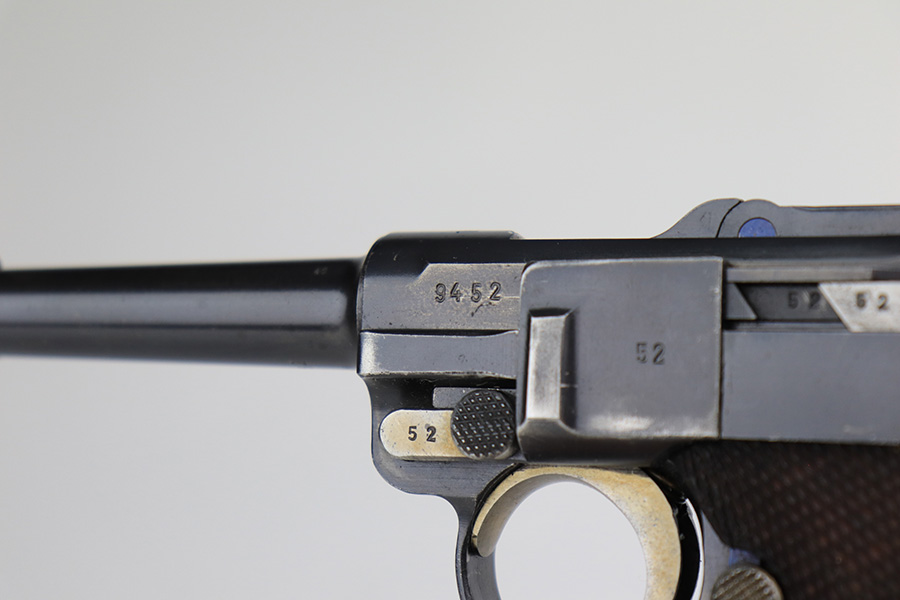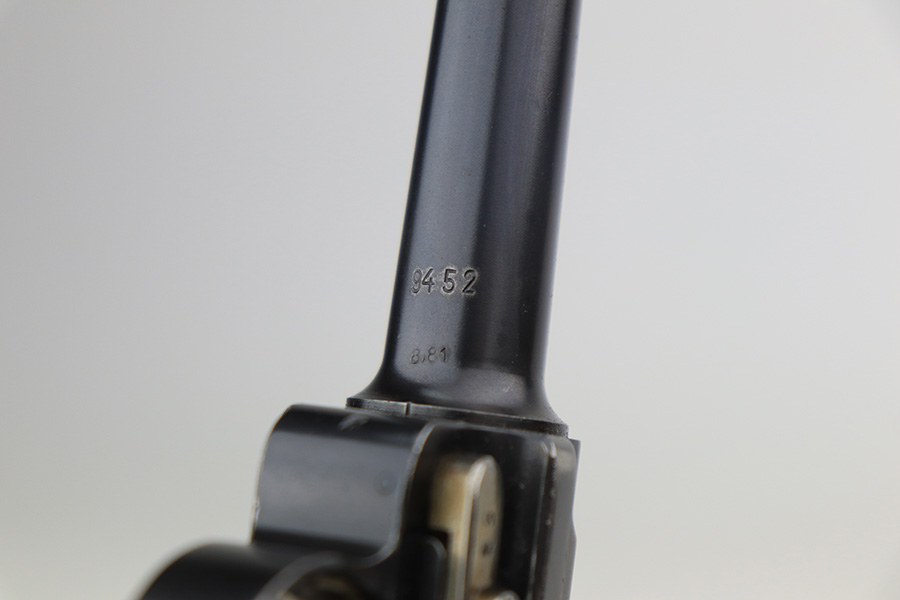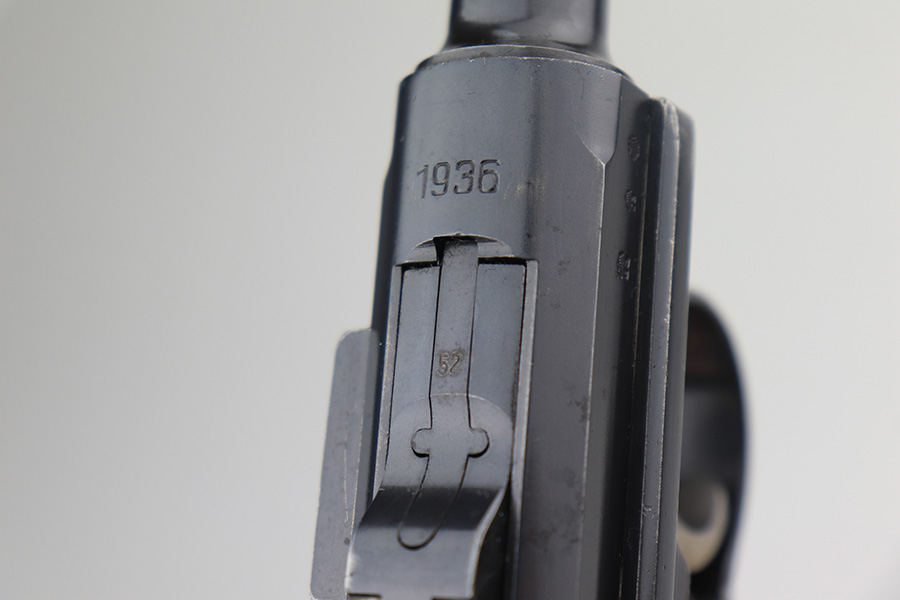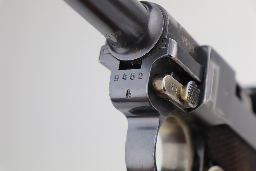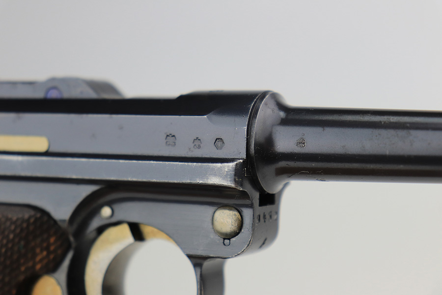 3/1/22 – This is a very nice example of a Mauser Luger issued to the Nazi military in 1936. The gun is all matching and has the proper “Eagle 63” Nazi military proofs on the right side of the slide. It has retained about 94% of its original bluing. There is muzzle wear and very minor wear on the side plate and side rails. One small area of spotty discoloration on the left side of the slide. There is very minor thinning on both grip straps and a few very light scratches along the barrel. Comes with excellent un-numbered grips and a period-correct “Eagle 63”-marked magazine that is numbered but not matching to the gun. The bore has good rifling, but there is very minor pin-pricking throughout.