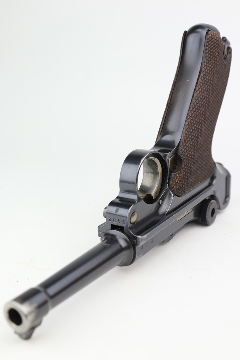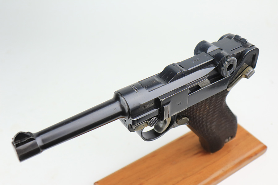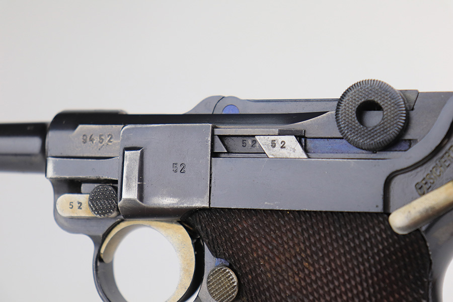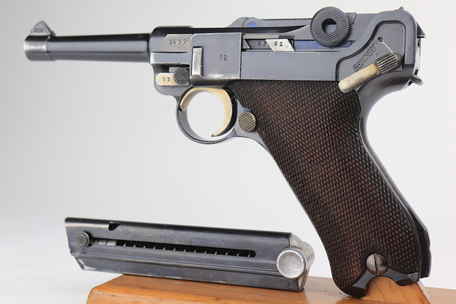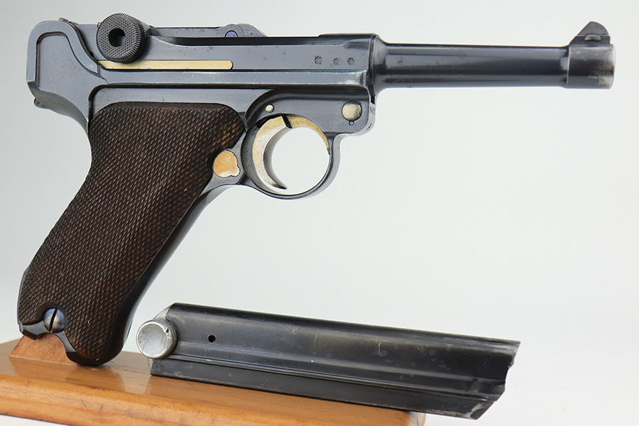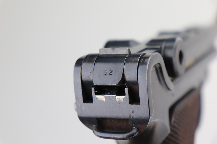 3/1/22 – This is a very nice example of a Mauser Luger issued to the Nazi military in 1936. The gun is all matching and has the proper “Eagle 63” Nazi military proofs on the right side of the slide. It has retained about 94% of its original bluing. There is muzzle wear and very minor wear on the side plate and side rails. One small area of spotty discoloration on the left side of the slide. There is very minor thinning on both grip straps and a few very light scratches along the barrel. Comes with excellent un-numbered grips and a period-correct “Eagle 63”-marked magazine that is numbered but not matching to the gun. The bore has good rifling, but there is very minor pin-pricking throughout.