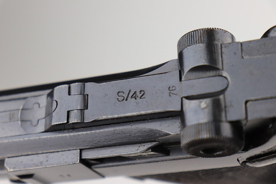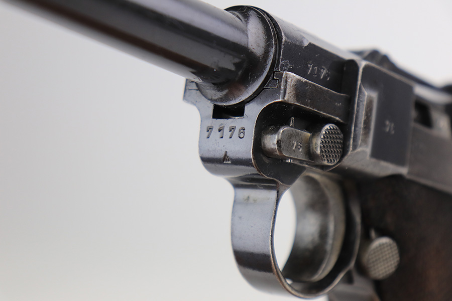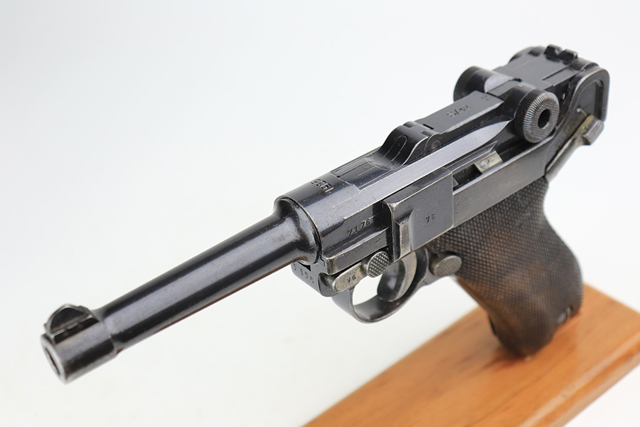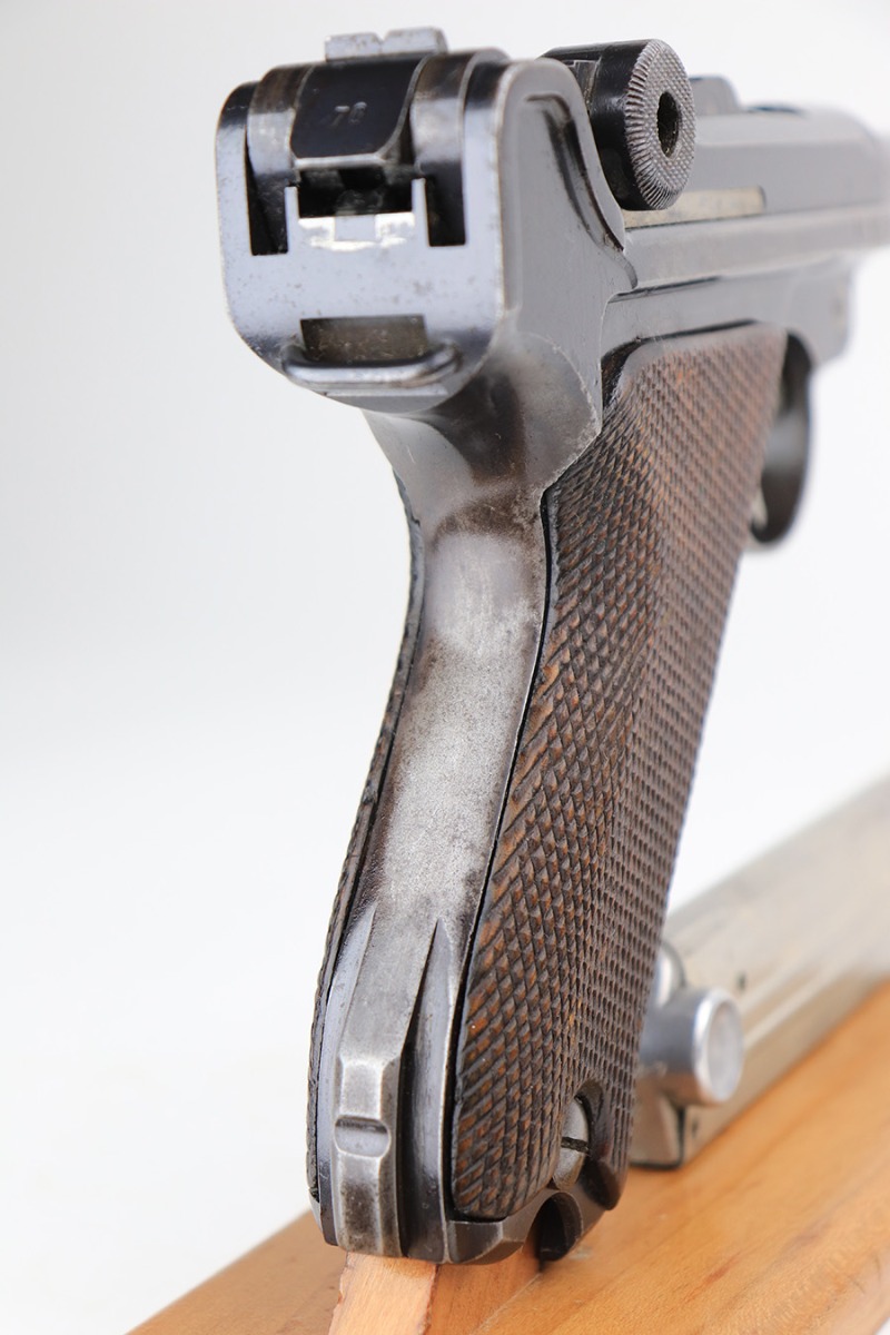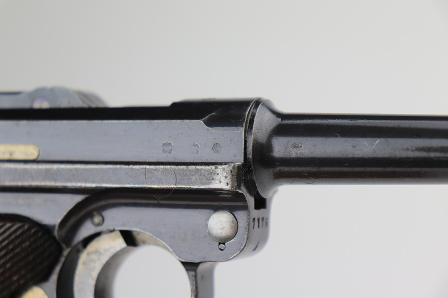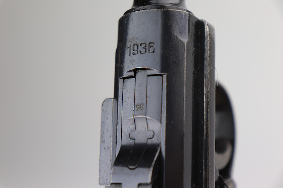 3/16/22 – This is a nice example of a Mauser Luger issued to the Nazi military in 1936. The gun is all matching and has the proper “Eagle 63” Nazi military acceptance proofs on the right side of the slide. It has retained roughly 80% of its original finish. The majority of the finish loss is on the grip straps, where there is also some spotty oxidation and brown patina. There are also areas of wear on the side plate, side rails, and around the muzzle. Some very minor scratchy wear on the left side of the frame. Comes with slightly worn un-numbered wood grips (small chip in the left panel) and a mismatched but period-correct magazine that is “Eagle 63”-proofed. The bore has decent rifling, but there is minor pin-pricking throughout and some tiny pits here and there. Note: the magazine release is a little stiff.