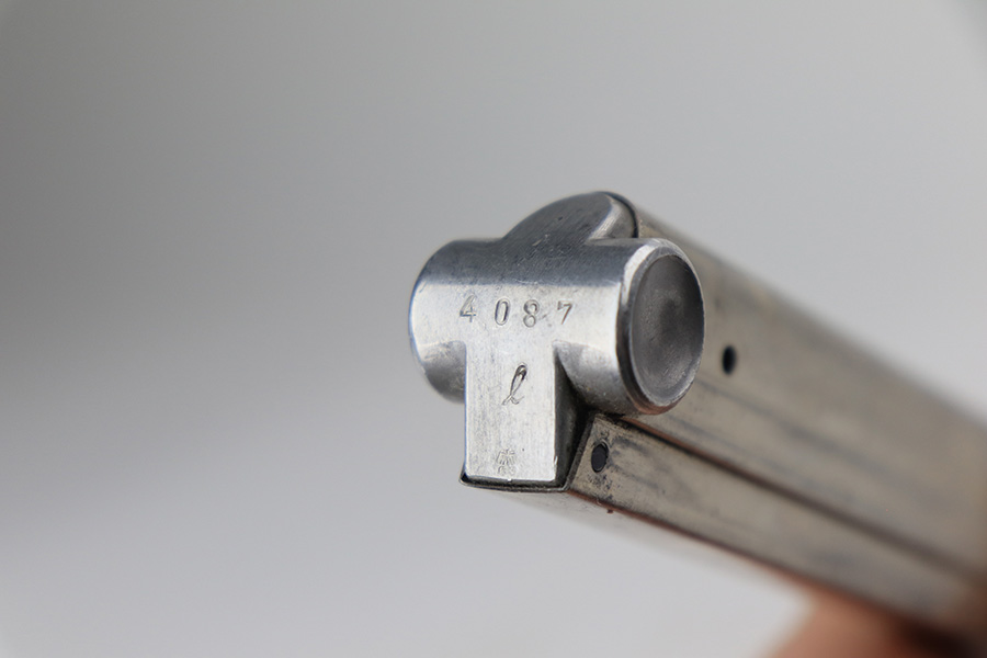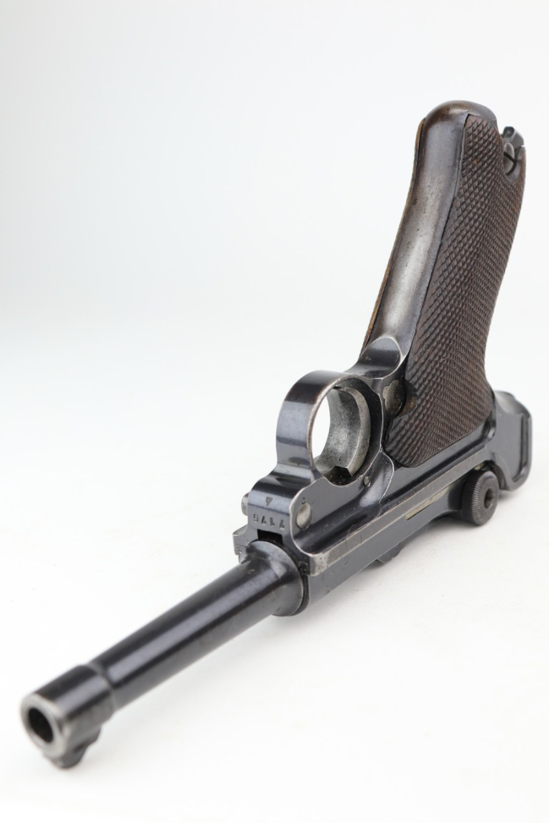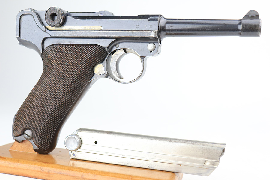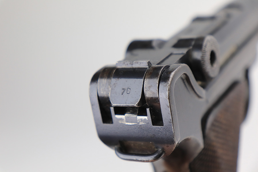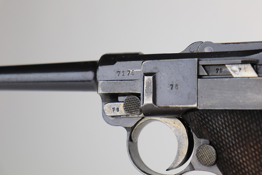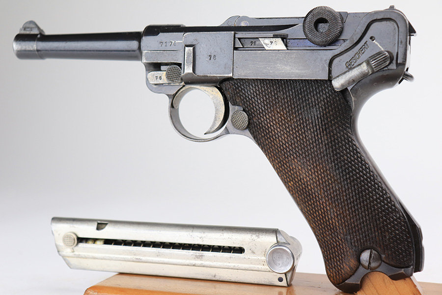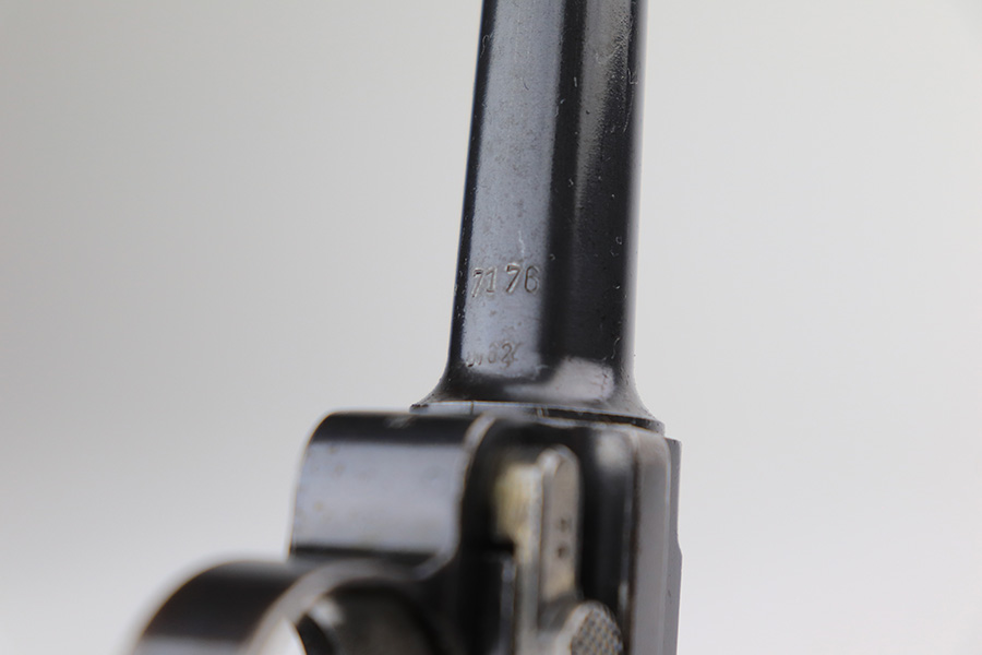 3/16/22 – This is a nice example of a Mauser Luger issued to the Nazi military in 1936. The gun is all matching and has the proper “Eagle 63” Nazi military acceptance proofs on the right side of the slide. It has retained roughly 80% of its original finish. The majority of the finish loss is on the grip straps, where there is also some spotty oxidation and brown patina. There are also areas of wear on the side plate, side rails, and around the muzzle. Some very minor scratchy wear on the left side of the frame. Comes with slightly worn un-numbered wood grips (small chip in the left panel) and a mismatched but period-correct magazine that is “Eagle 63”-proofed. The bore has decent rifling, but there is minor pin-pricking throughout and some tiny pits here and there. Note: the magazine release is a little stiff.