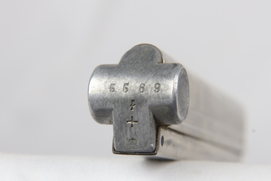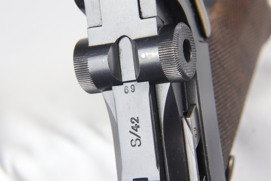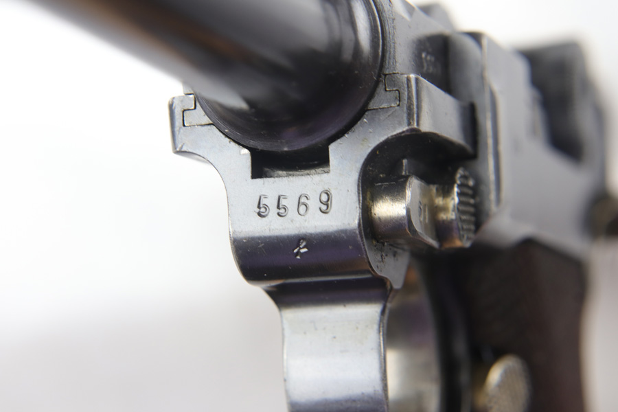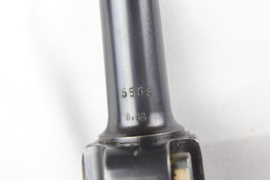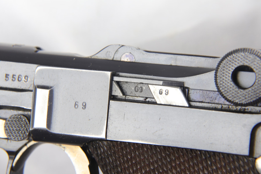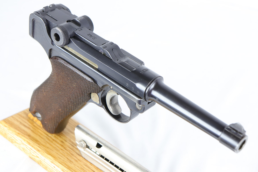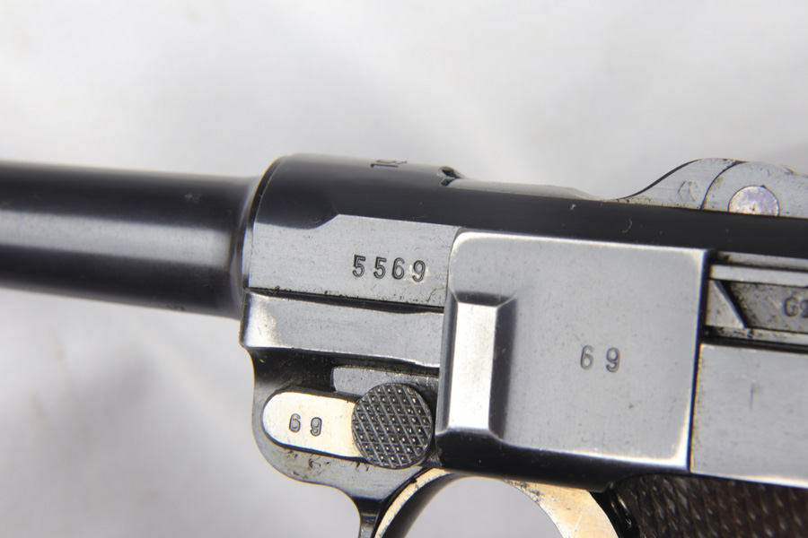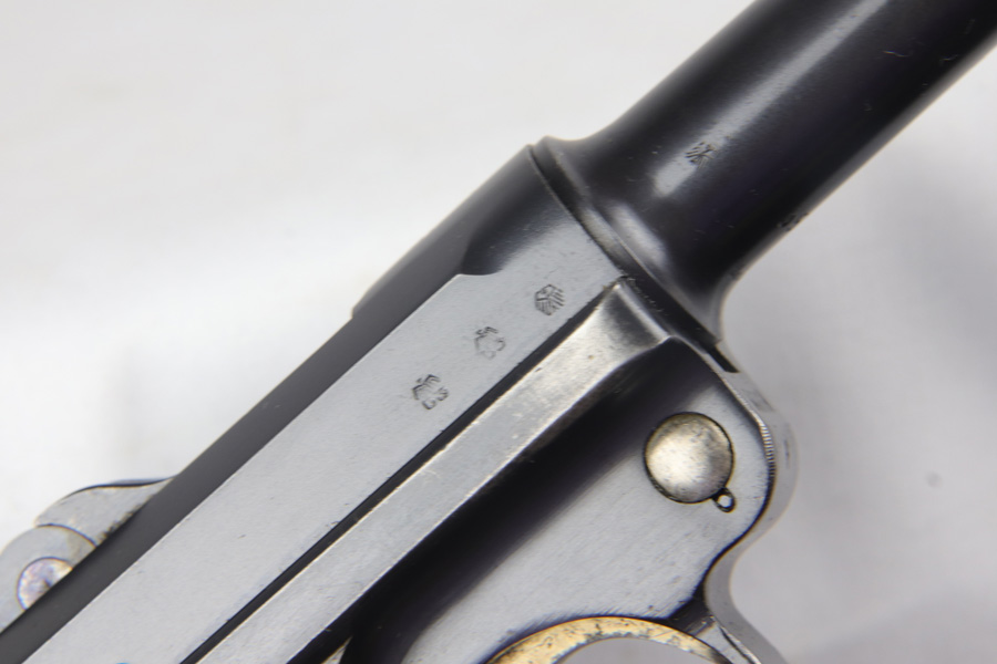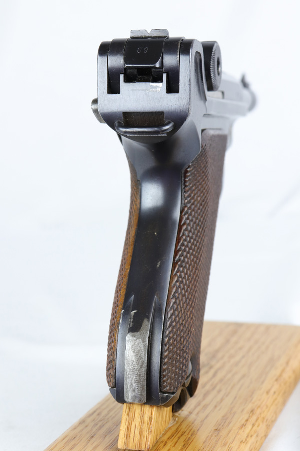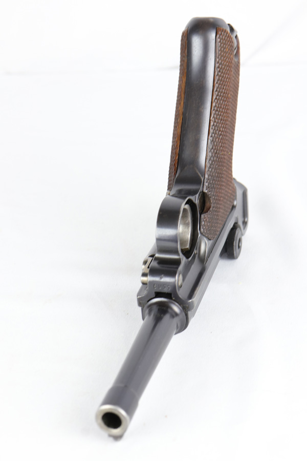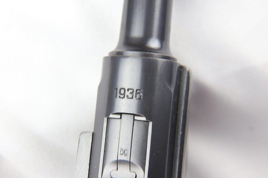 12/11/18 – This is a very nice Mauser Luger from early in the Nazi era. Made in 1936, the pistol is all matching and original, including the magazine. It has small parts with very nice original straw, and properly unnumbered grips. The original blue rates at 94-95% with high point wear on rails, side plate and muzzle. Straps show minor patina. For some reason, the stock lug has been partially shaved down. Bore shows minor use but is in very good condition.