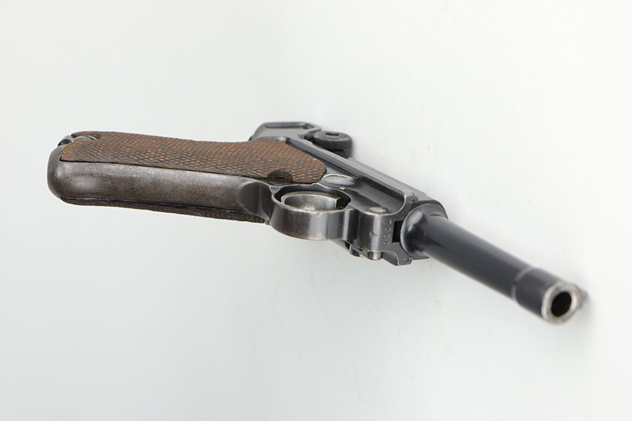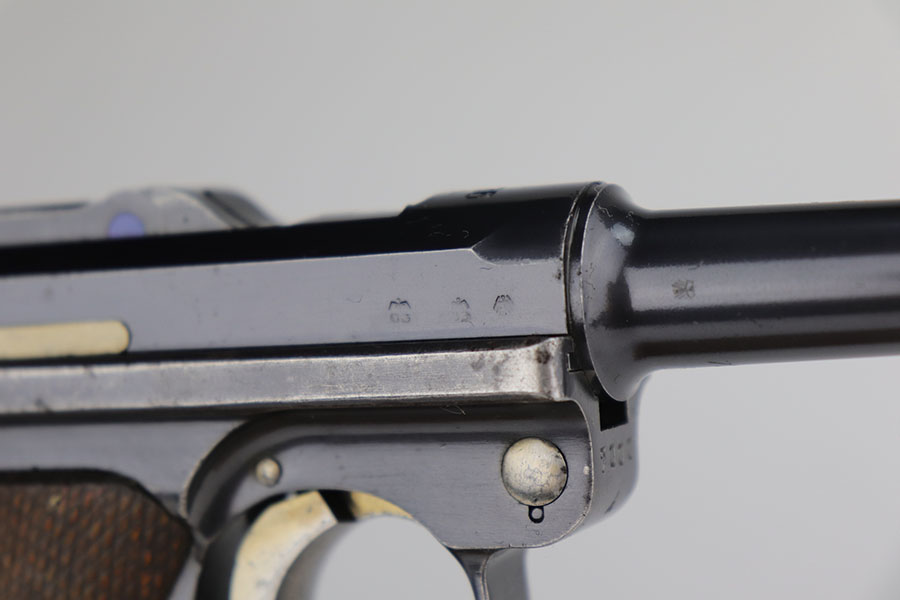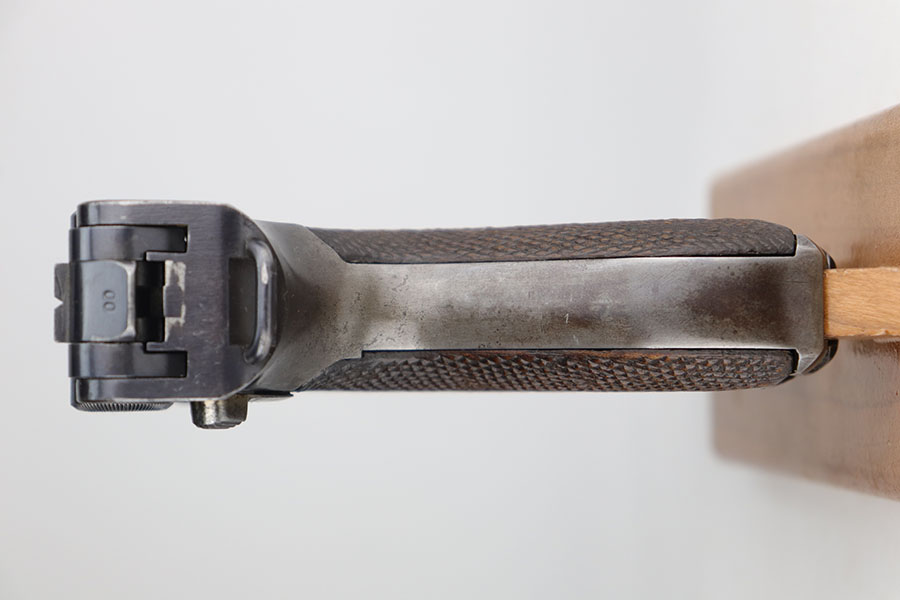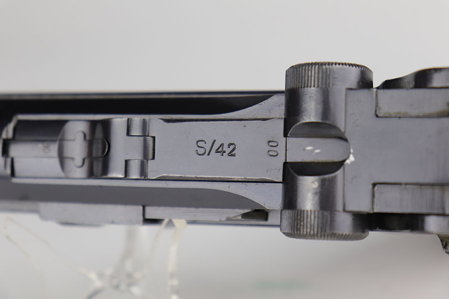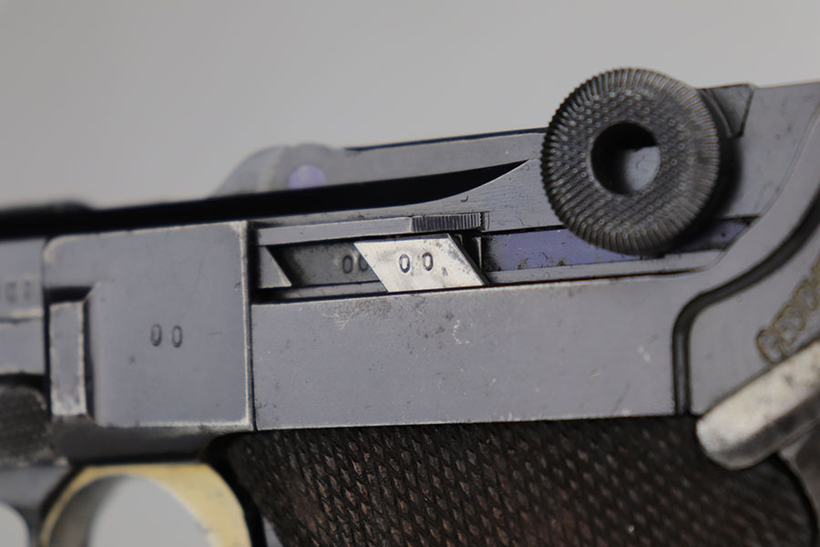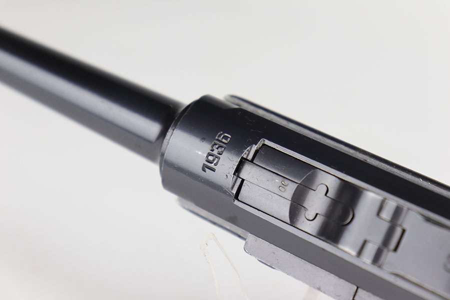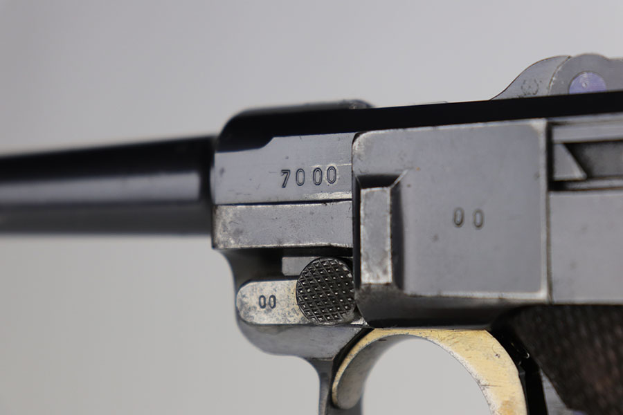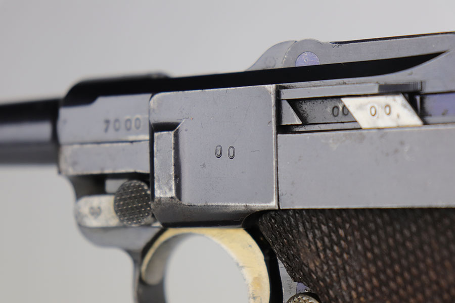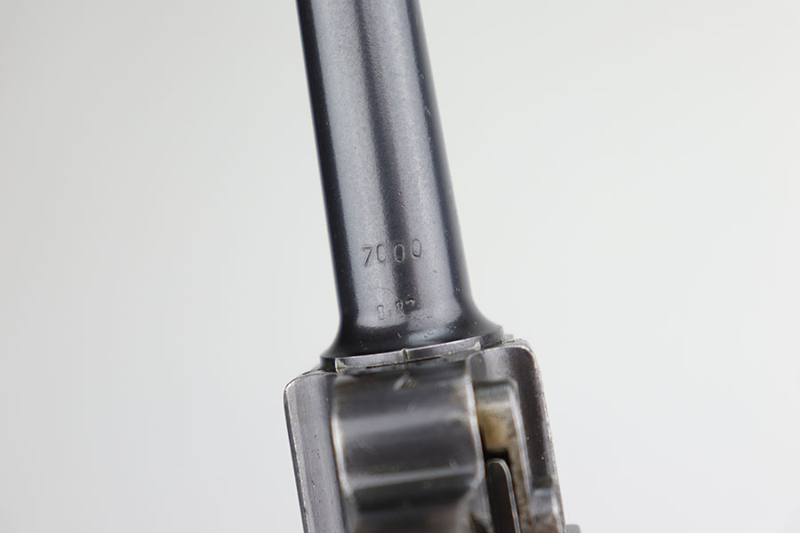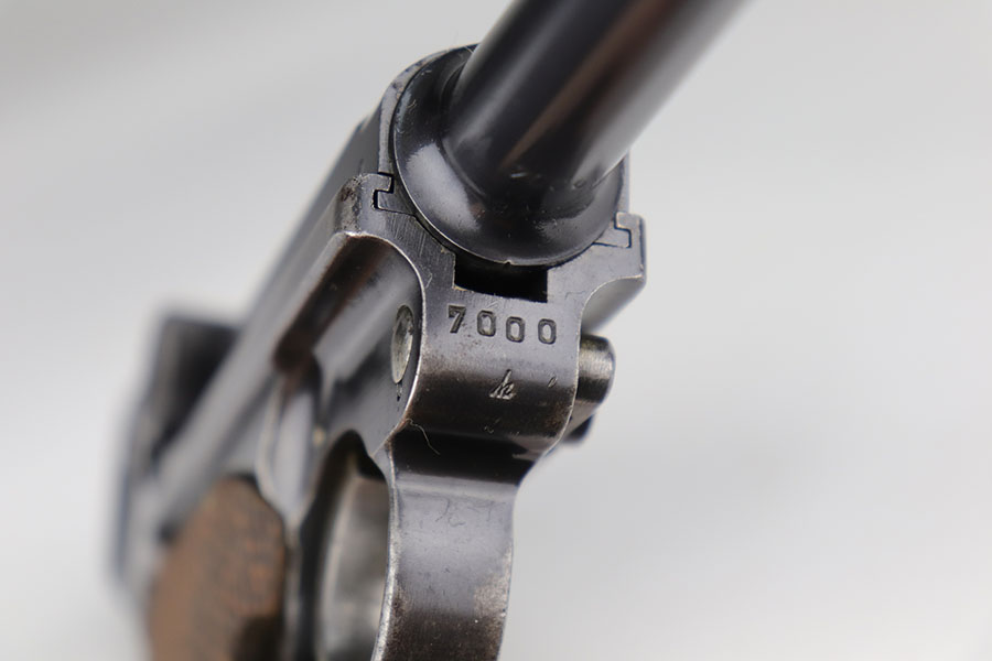 11/11/20 – This is an all matching and original Nazi Mauser Luger from 1936 with cool serial number (7000). It has all matching parts, including the original magazine. Small parts have the cool looking double zero on them. The grips appear original to the gun but are not numbered. There is obvious age and handling wear throughout on this gun, with the grip straps showing the most pronounced finish loss. The bore shows some frost and minor freckling throughout. The grips have clear signs of handling wear but no cracks or chips.