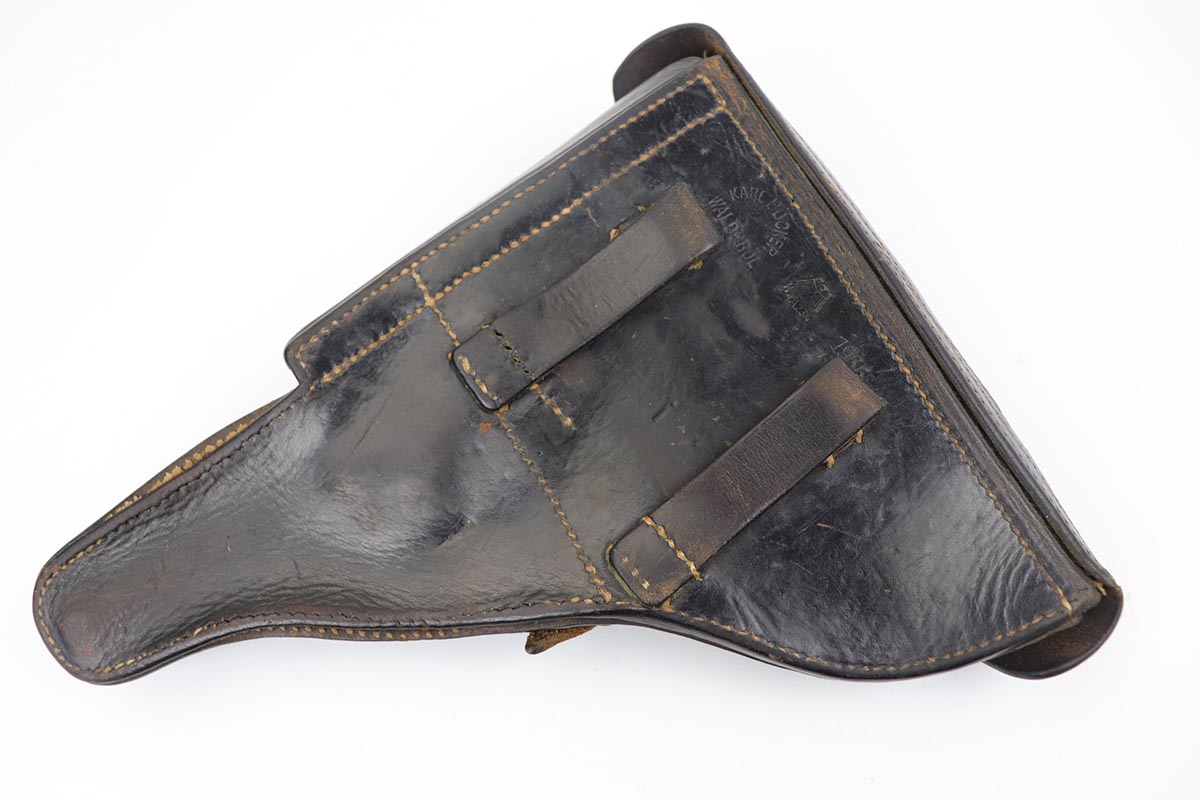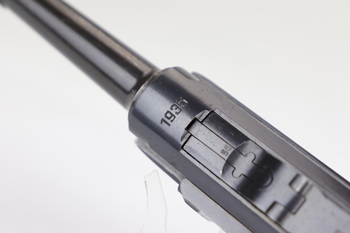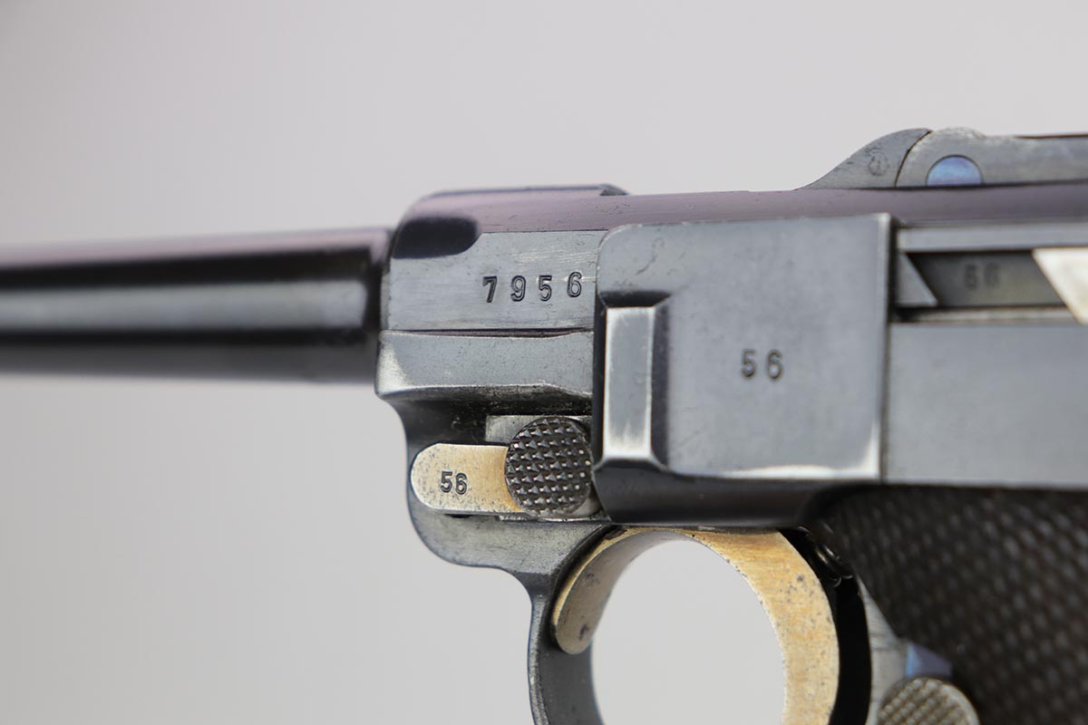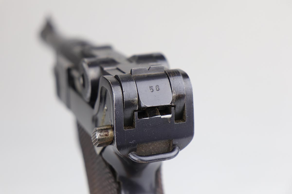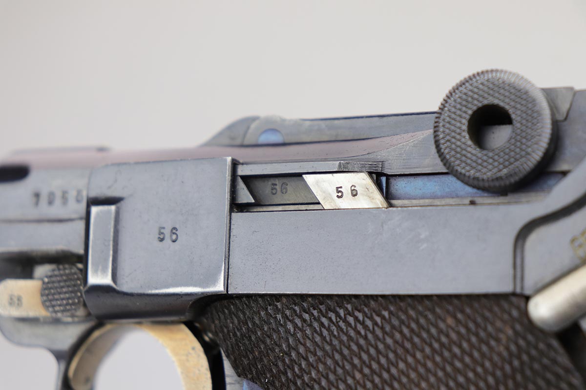 3/2/20 – This is an all matching and original Mauser Luger rig from 1936. The pistol has a beautiful profile view with standard holster wear on the high points, and a spot of finish loss on the bottom of the front strap. There is also some oxidation/patina on the front of the trigger guard, and right side of receiver/barrel. Small parts still retain about 90% of the original straw, with most of the wear on the right side of the trigger and takedown lever. The grips are unmarked, which can be correct for a 1936 Luger, and fit perfectly. The left panel does have the common chip under the safety, though. Both magazines are period original but mismatched. The tool has a single SS rune on it, and is otherwise unmarked. The holster is in decent shape but does have stitching missing in one of the belt loops. It’s 1936 dated with sharp waffenamt.