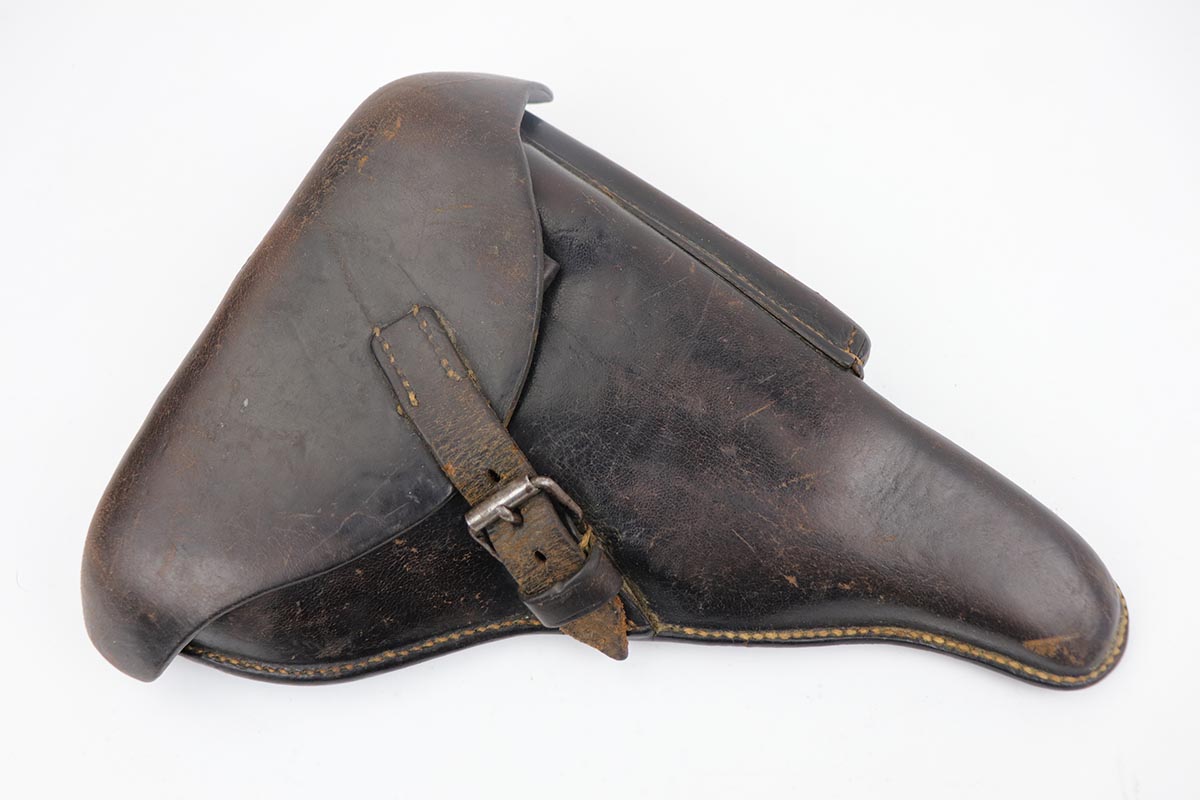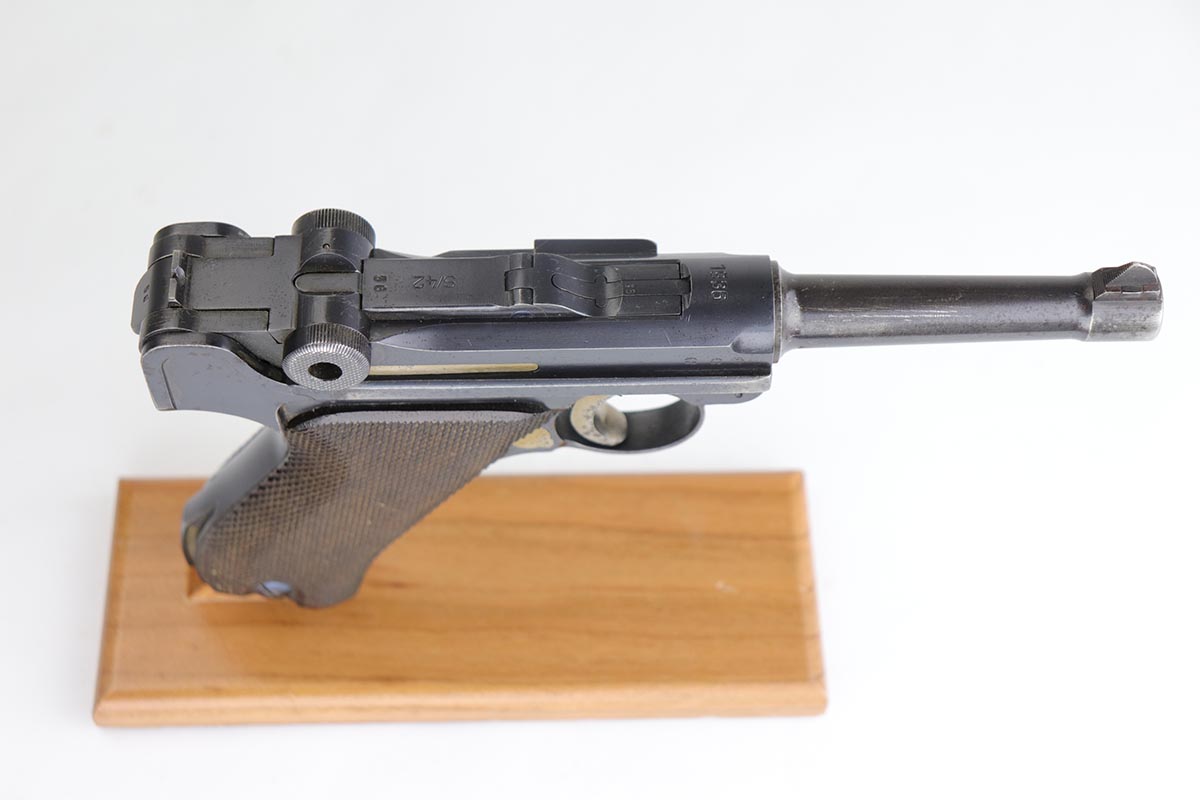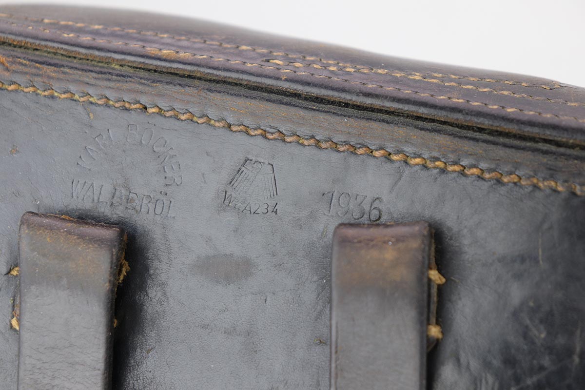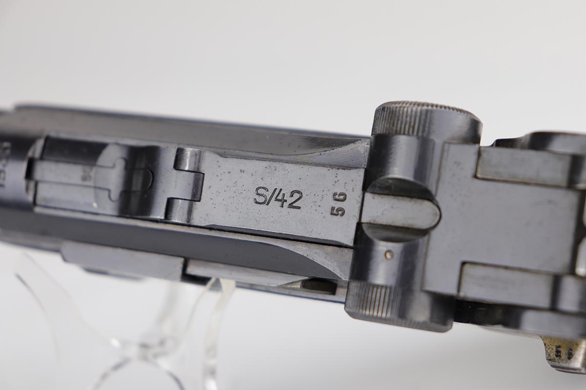 3/2/20 – This is an all matching and original Mauser Luger rig from 1936. The pistol has a beautiful profile view with standard holster wear on the high points, and a spot of finish loss on the bottom of the front strap. There is also some oxidation/patina on the front of the trigger guard, and right side of receiver/barrel. Small parts still retain about 90% of the original straw, with most of the wear on the right side of the trigger and takedown lever. The grips are unmarked, which can be correct for a 1936 Luger, and fit perfectly. The left panel does have the common chip under the safety, though. Both magazines are period original but mismatched. The tool has a single SS rune on it, and is otherwise unmarked. The holster is in decent shape but does have stitching missing in one of the belt loops. It’s 1936 dated with sharp waffenamt.
