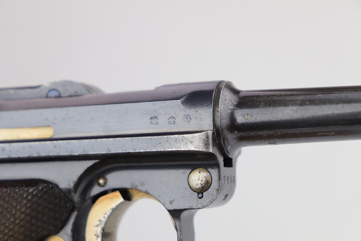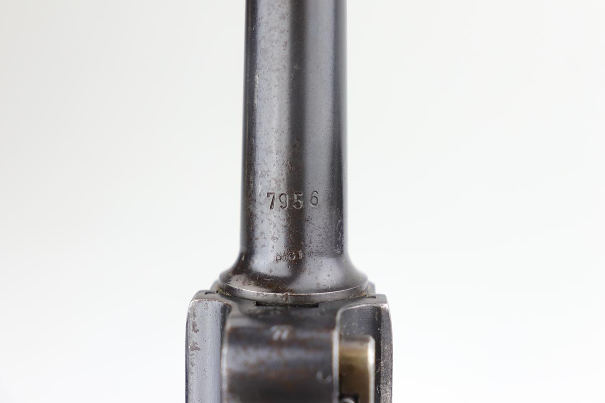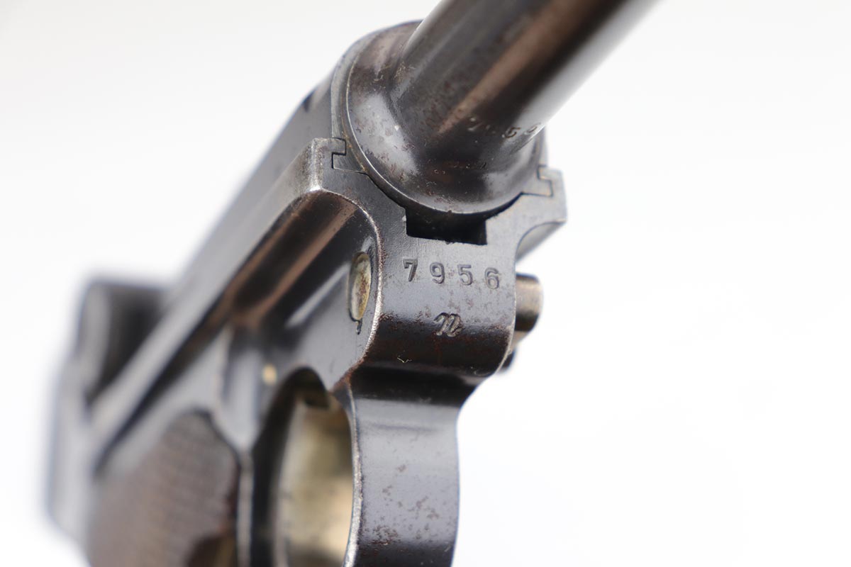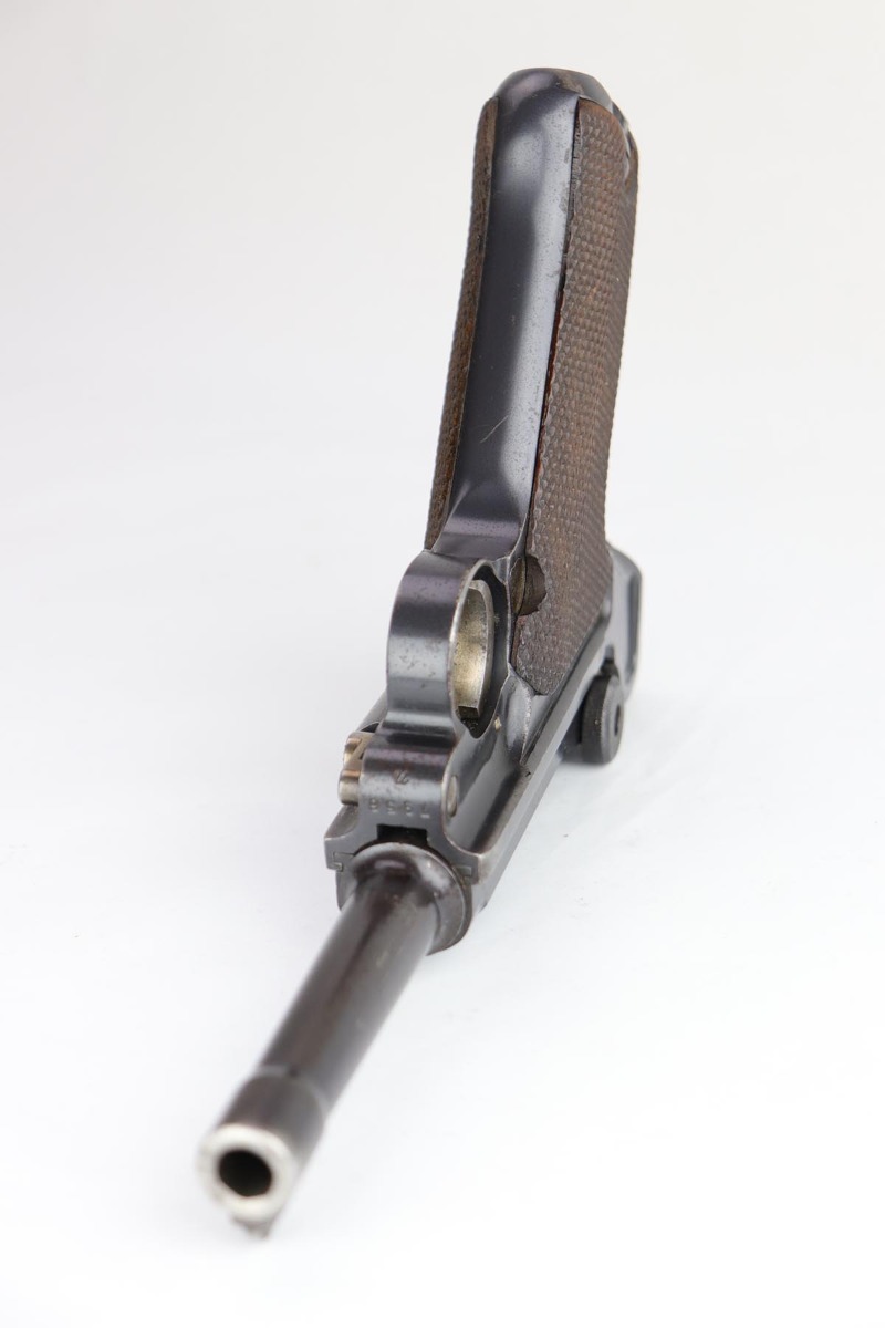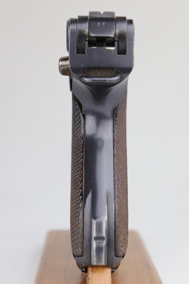 3/2/20 – This is an all matching and original Mauser Luger rig from 1936. The pistol has a beautiful profile view with standard holster wear on the high points, and a spot of finish loss on the bottom of the front strap. There is also some oxidation/patina on the front of the trigger guard, and right side of receiver/barrel. Small parts still retain about 90% of the original straw, with most of the wear on the right side of the trigger and takedown lever. The grips are unmarked, which can be correct for a 1936 Luger, and fit perfectly. The left panel does have the common chip under the safety, though. Both magazines are period original but mismatched. The tool has a single SS rune on it, and is otherwise unmarked. The holster is in decent shape but does have stitching missing in one of the belt loops. It’s 1936 dated with sharp waffenamt.