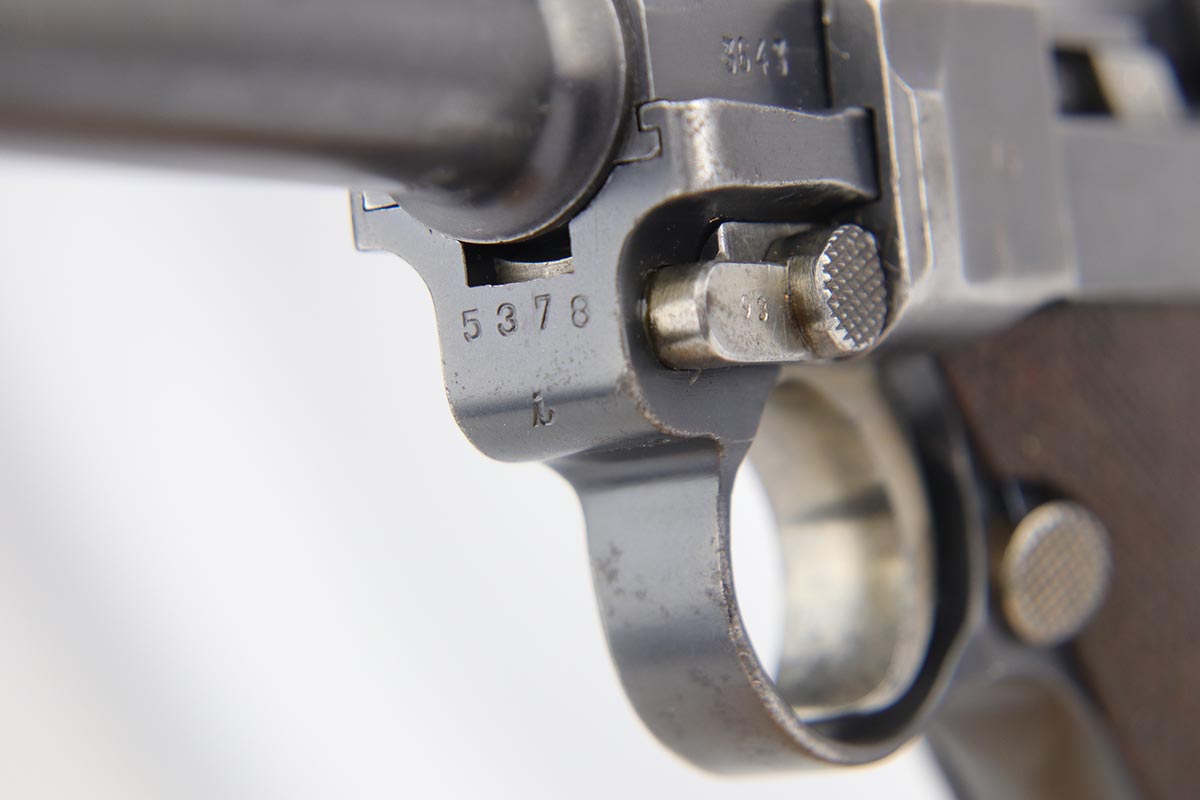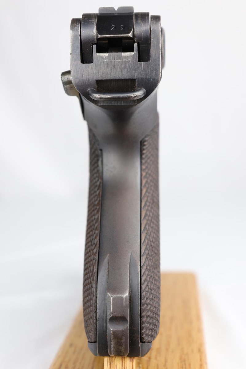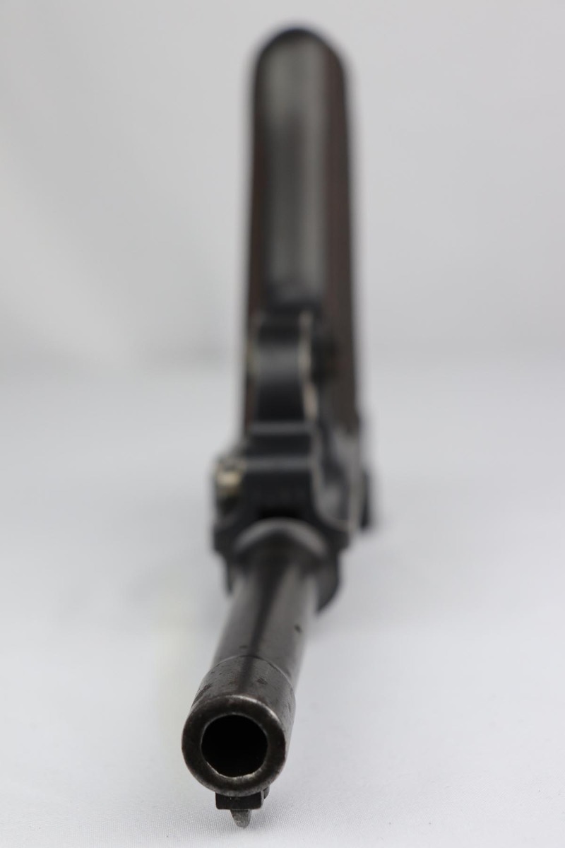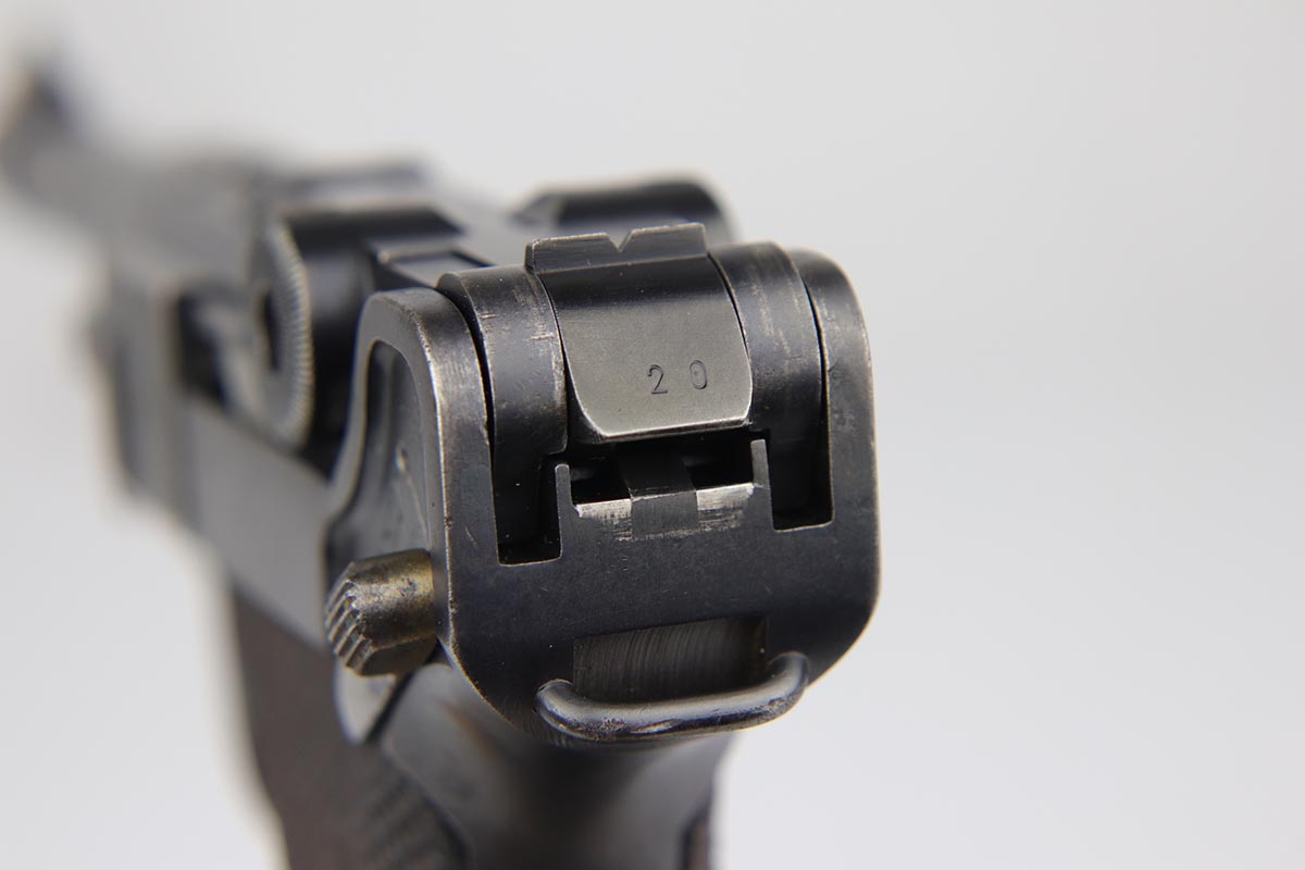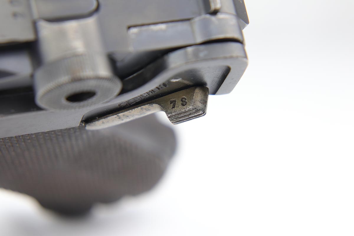 11/15/18 – This is a Nazi Mauser Luger from the World War II era with all original finish but mismatched small parts from the time period. Chamber is 1936 dated and small parts still show some straw. Finish rates at 80-85% with edge rub wear and browning of the straps. There is minor surface freckling along rails, with one small but deeply pitted area on barrel that does not affect the bore. Excellent grips. Bore is shiny with strong rifling, but frost in the grooves.