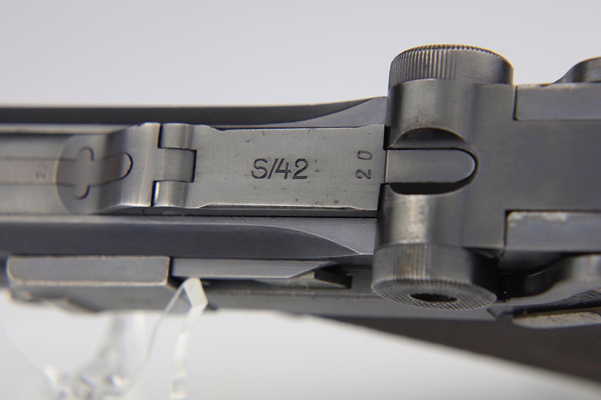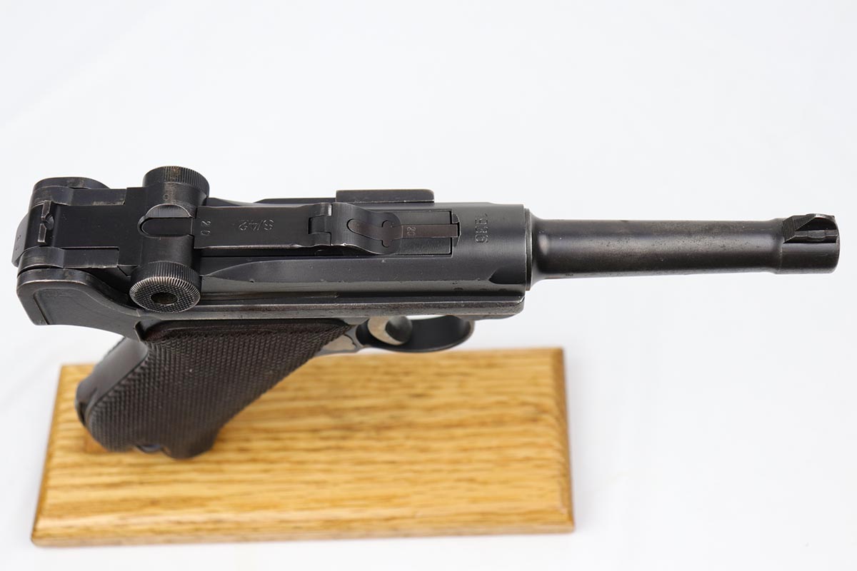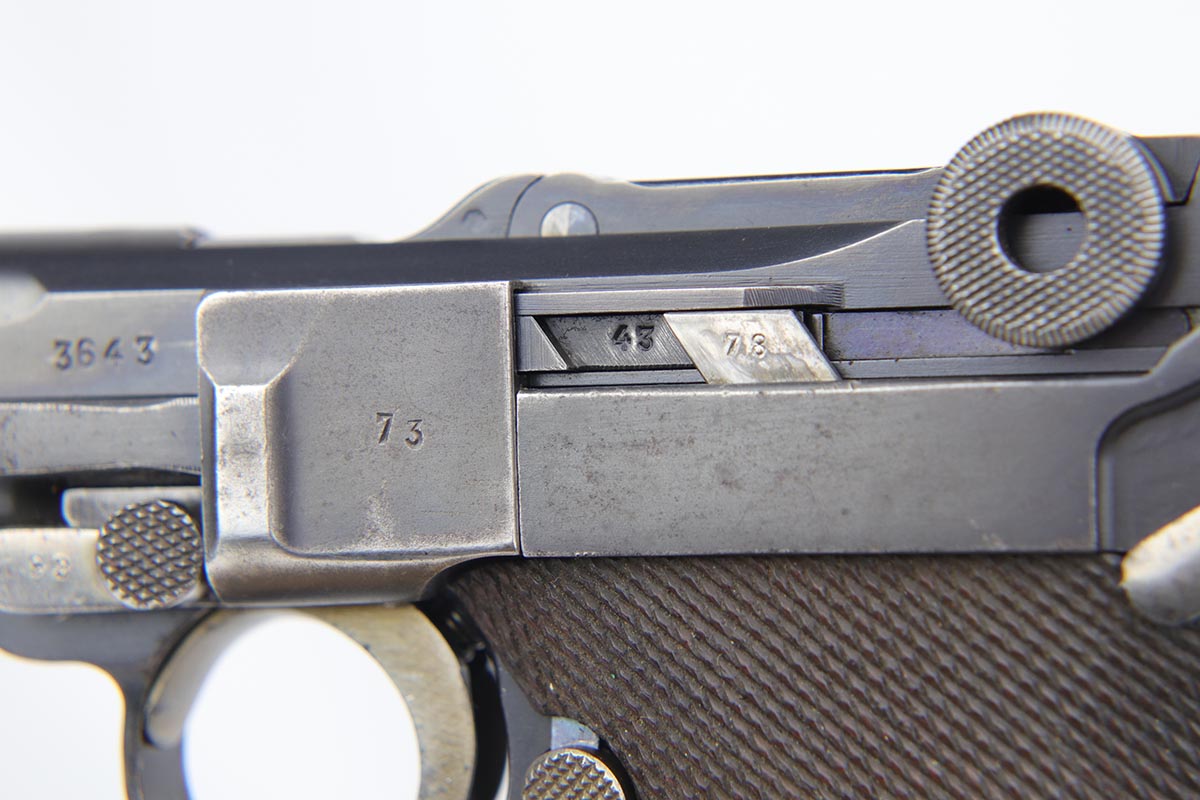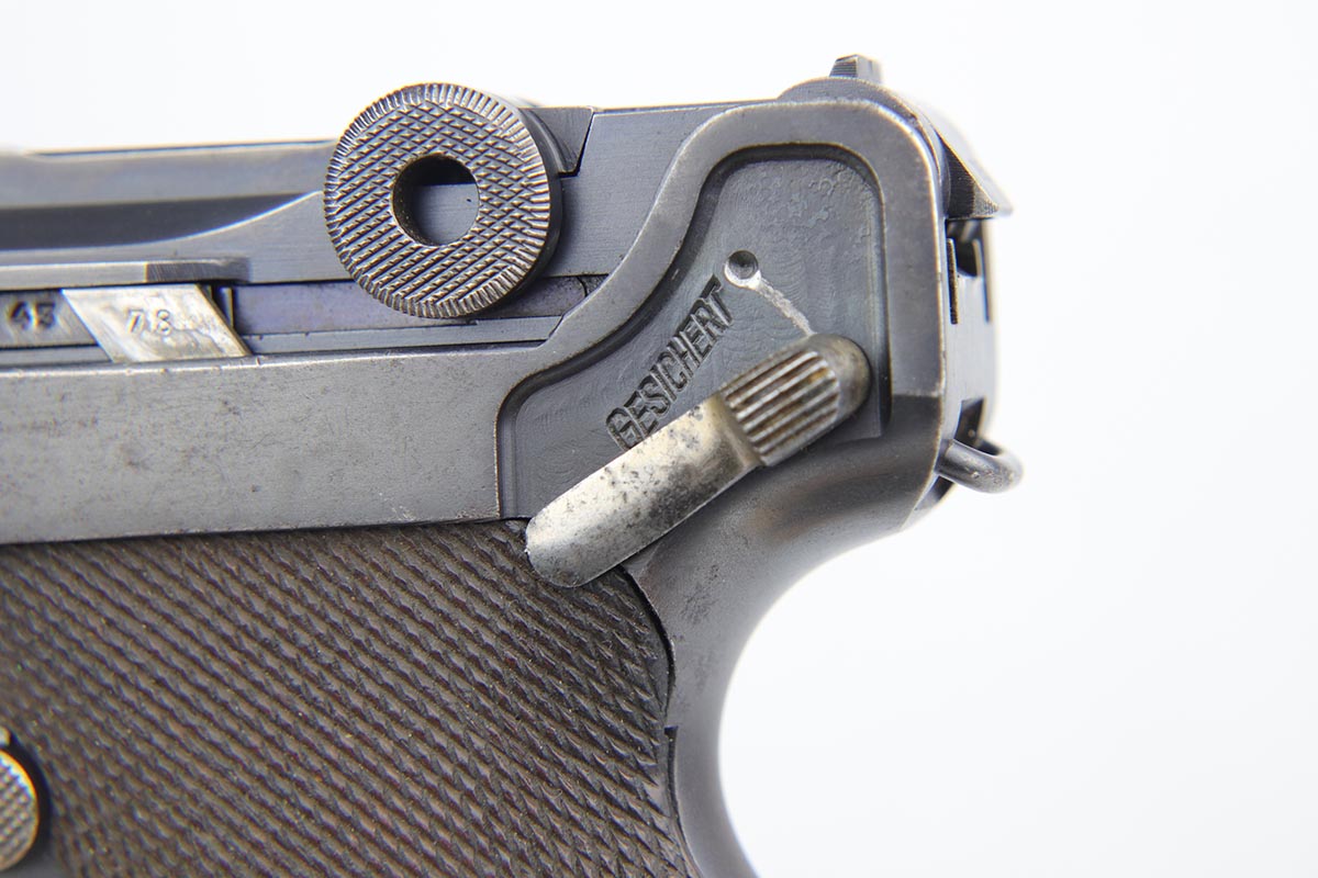 11/15/18 – This is a Nazi Mauser Luger from the World War II era with all original finish but mismatched small parts from the time period. Chamber is 1936 dated and small parts still show some straw. Finish rates at 80-85% with edge rub wear and browning of the straps. There is minor surface freckling along rails, with one small but deeply pitted area on barrel that does not affect the bore. Excellent grips. Bore is shiny with strong rifling, but frost in the grooves.