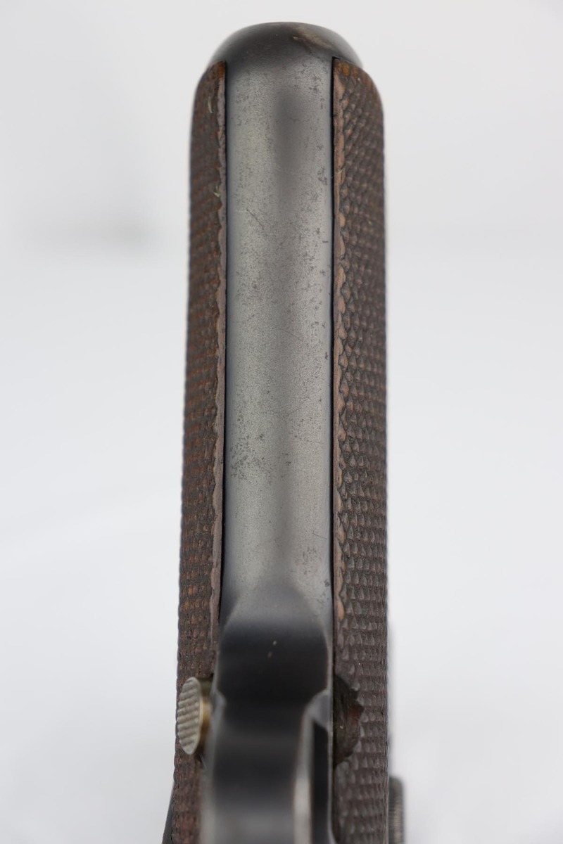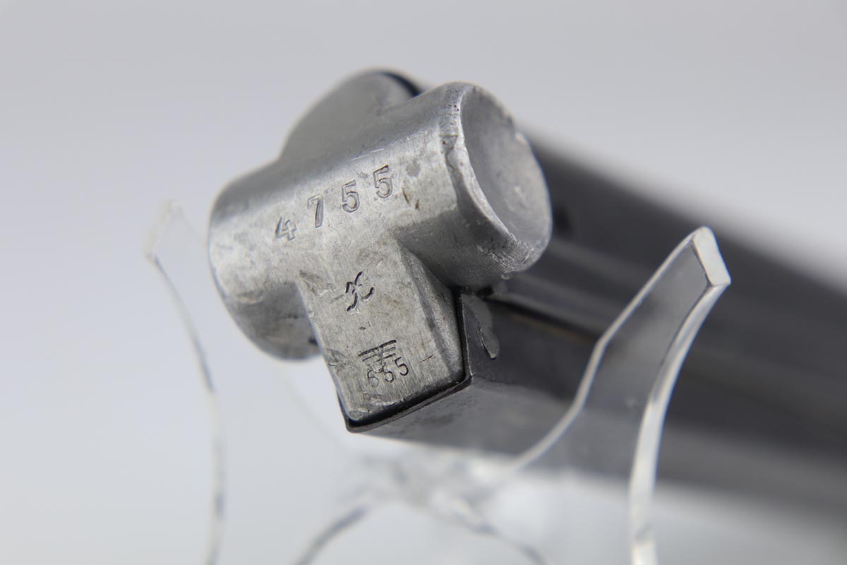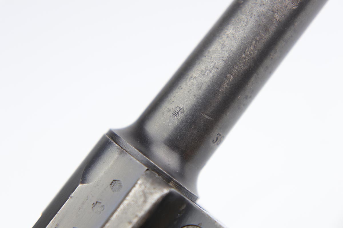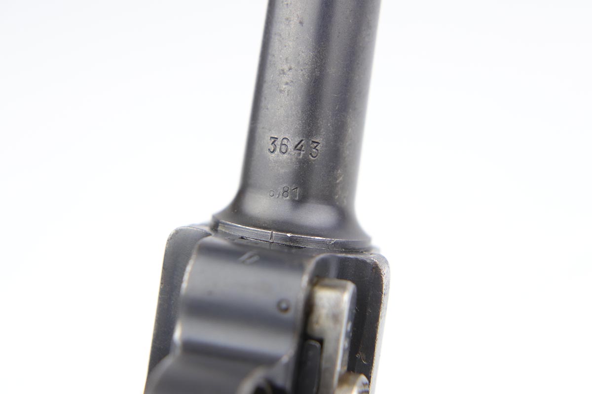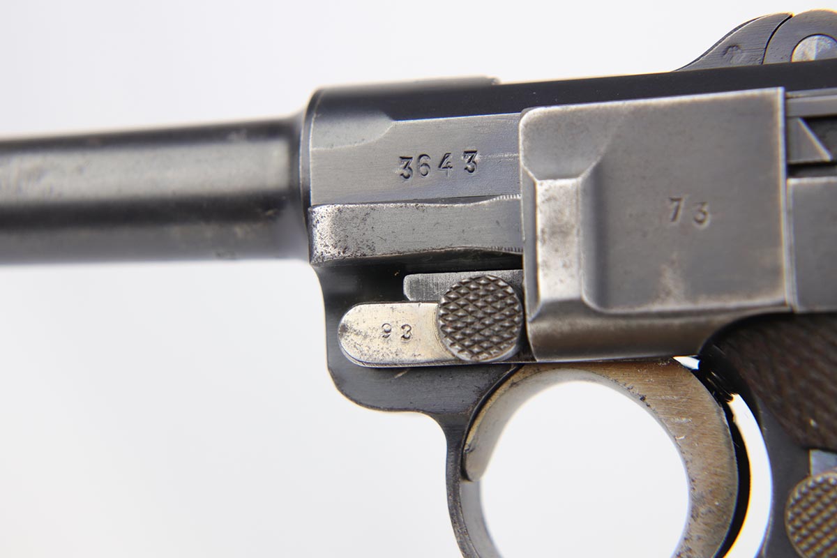 11/15/18 – This is a Nazi Mauser Luger from the World War II era with all original finish but mismatched small parts from the time period. Chamber is 1936 dated and small parts still show some straw. Finish rates at 80-85% with edge rub wear and browning of the straps. There is minor surface freckling along rails, with one small but deeply pitted area on barrel that does not affect the bore. Excellent grips. Bore is shiny with strong rifling, but frost in the grooves.