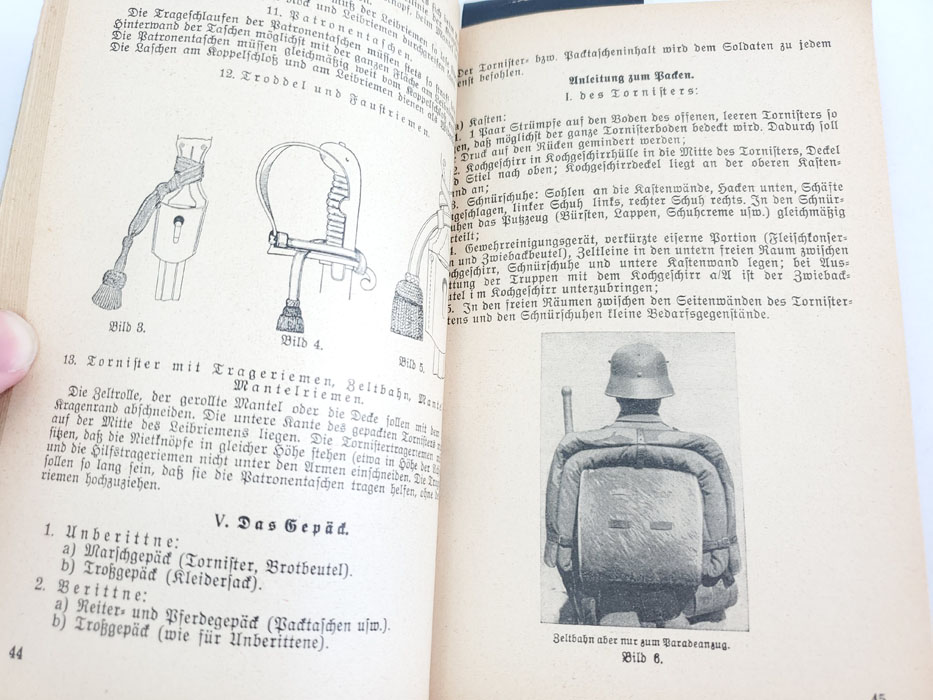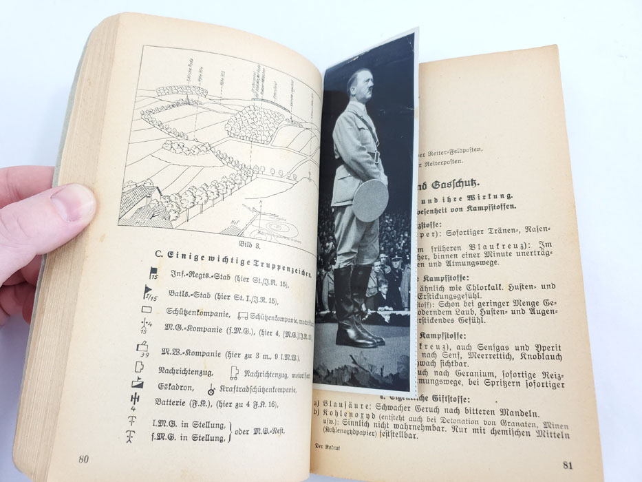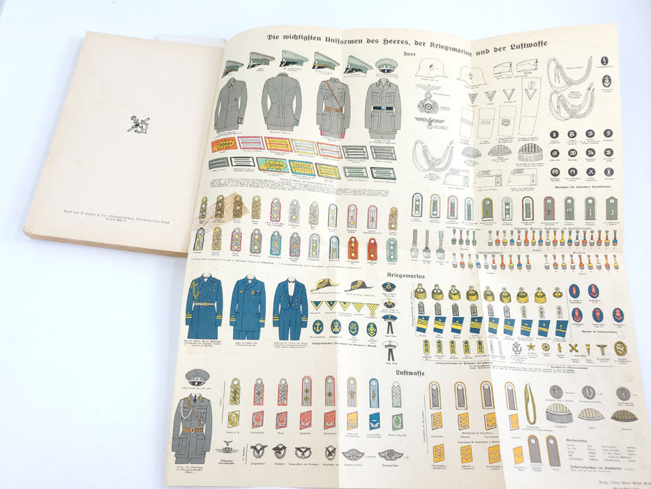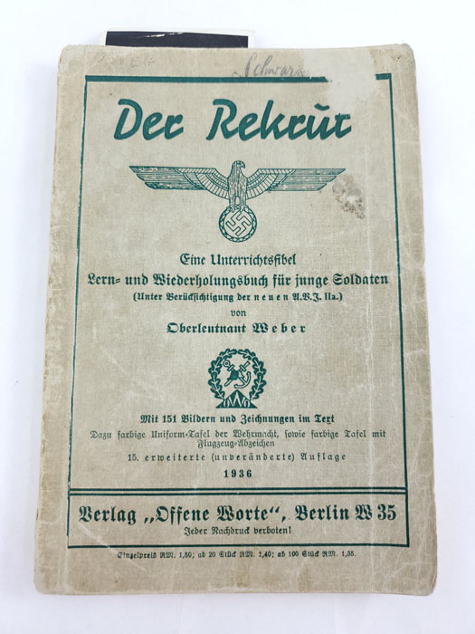 5/13/20 – This is an original recruitment book from 1936 nazi Germany. The book explains instructions for “young soldiers” or new nazi recruits during WW2. This was one of the many books a soldier would be given, or buy to study different techniques and skills required of a soldier. Everything from packing a backpack to operating a firearm and what uniforms to wear. In the back of the books is a color fold-out that shows uniforms and insignias. 191 pages all in tact with some light yellowing and aging, but no excessive wear. Comes with a Hitler bookmark!