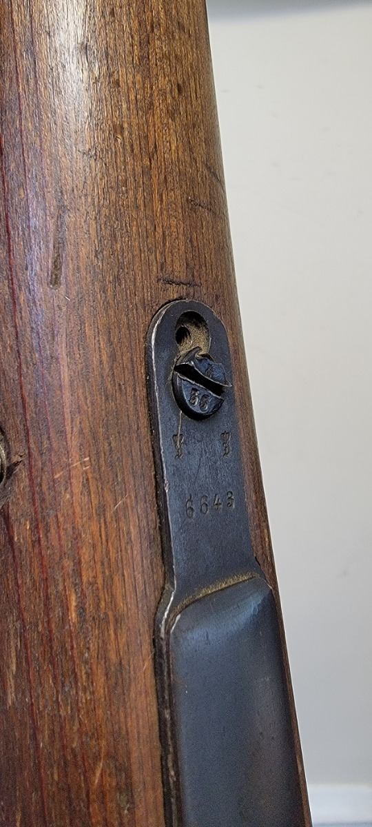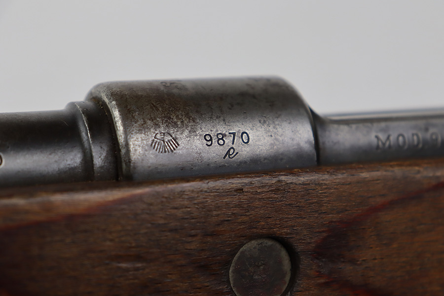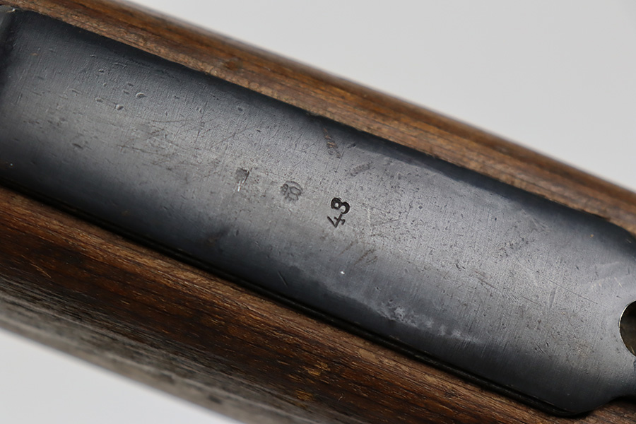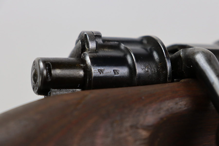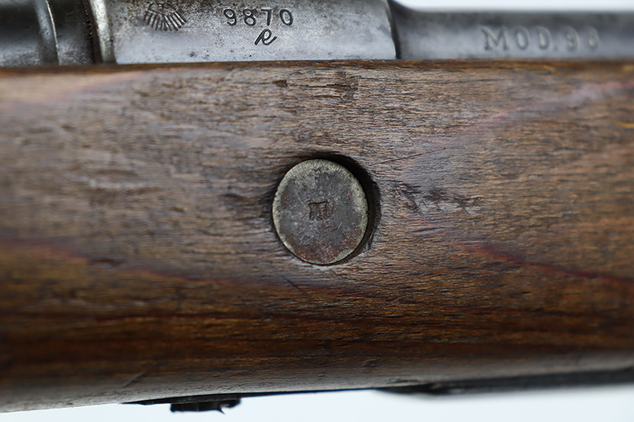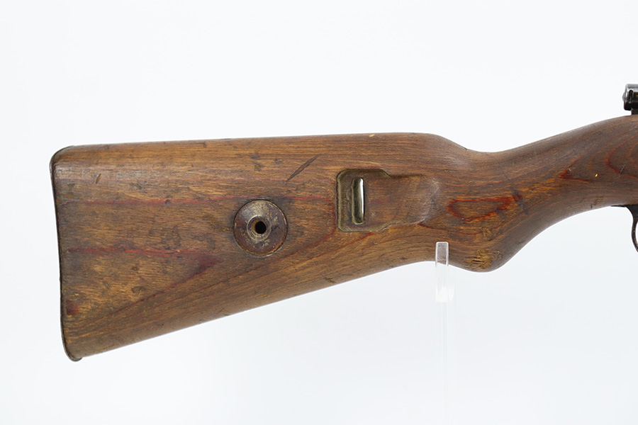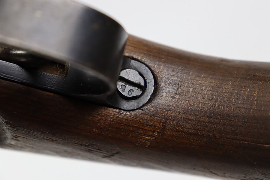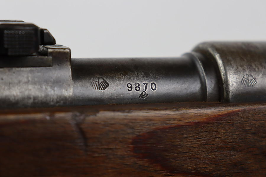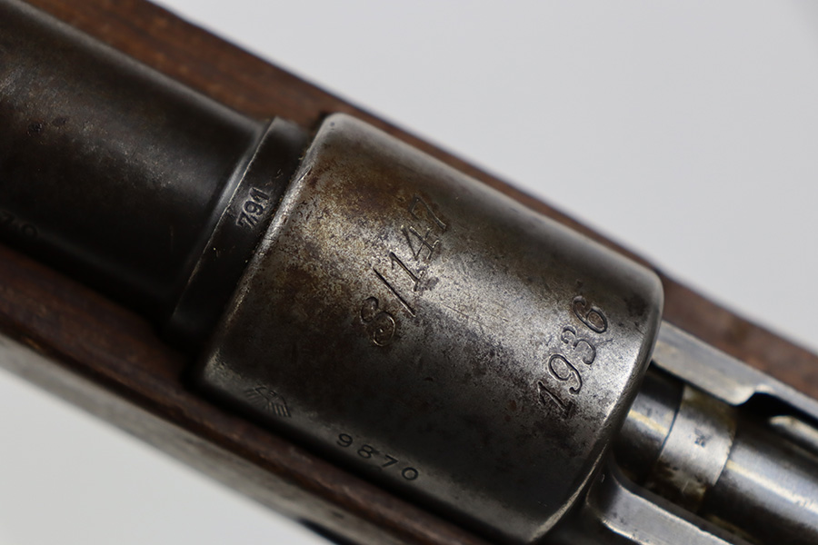 8/30/23 – This is a 1936 production Sauer K98 rifle with a matching barrel. The rest of the parts are mis-matching and generally put together from both WW1 and WW2 era parts. The rifle shows surface patina and honest wear throughout, but there is no rust or pitting. No import stamps as well. The metal finish rates around 65%. The wood stock has handling wear and a few typical scratches, dings, and dents. There’s a small chip in the wood near the wrist area, and some wear at the base of the buttstock, but this shouldn’t affect functionality. The right side of the buttstock still shows the original waffen military proof stamps. The bolt assembly is matching to itself, and is functional with smooth operation. The bore shows signs of use wear and mild corrosion throughout, but should still function as there’s strong rifling throughout. We rate the bore 7/10 overall.