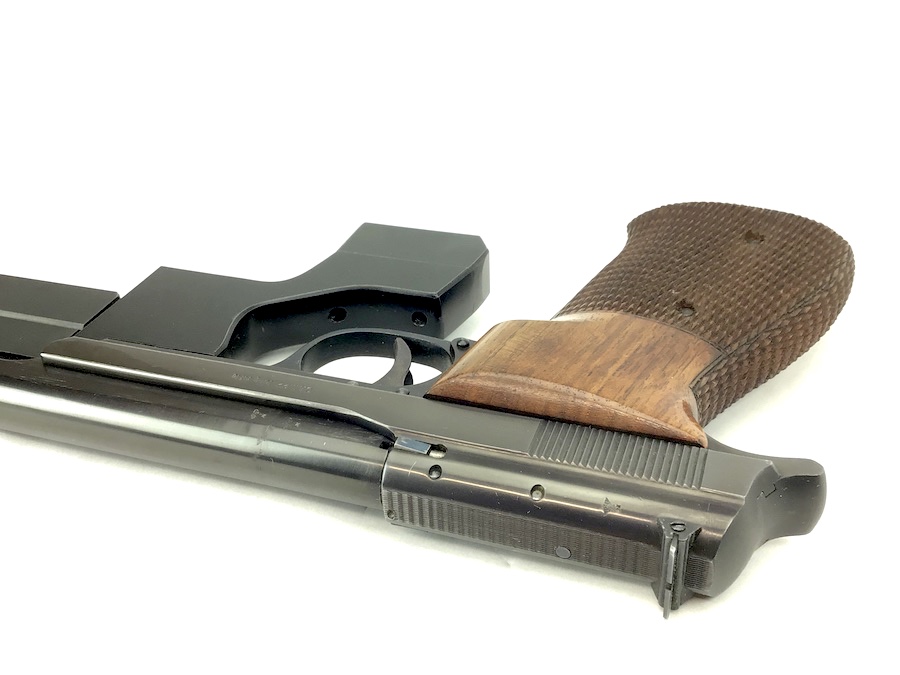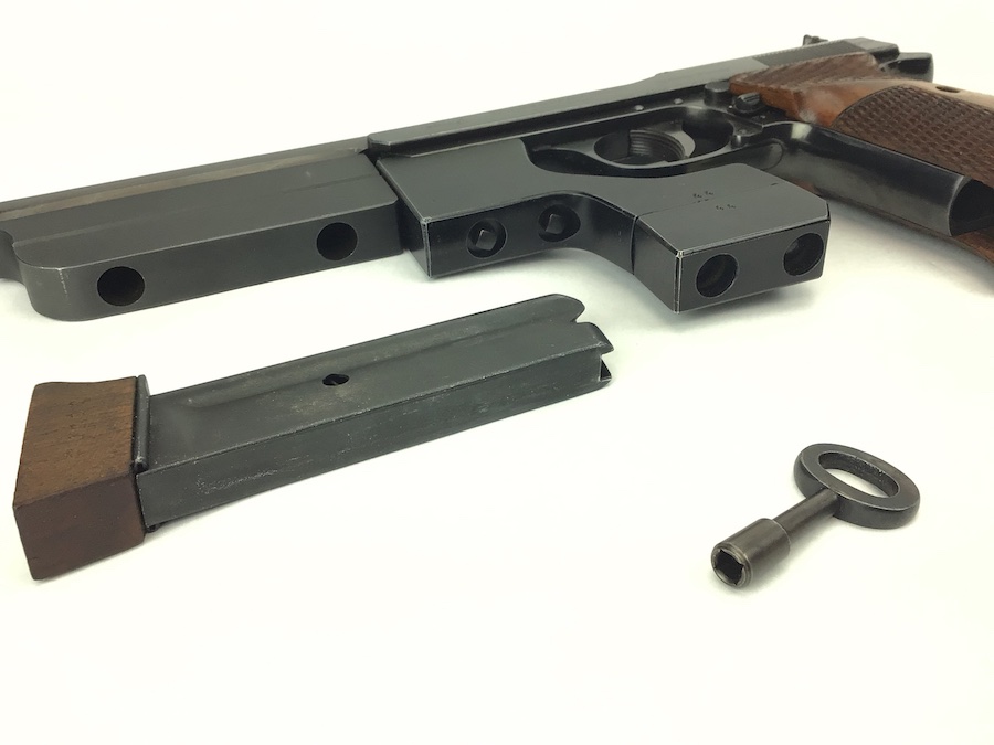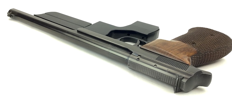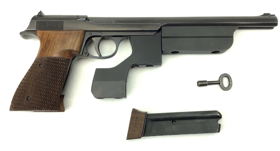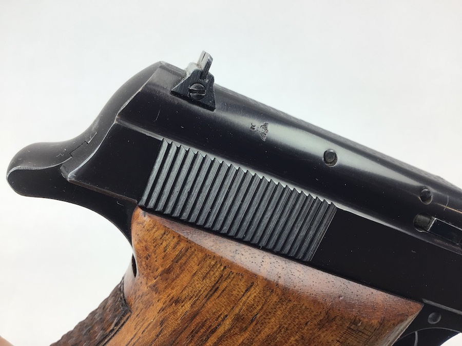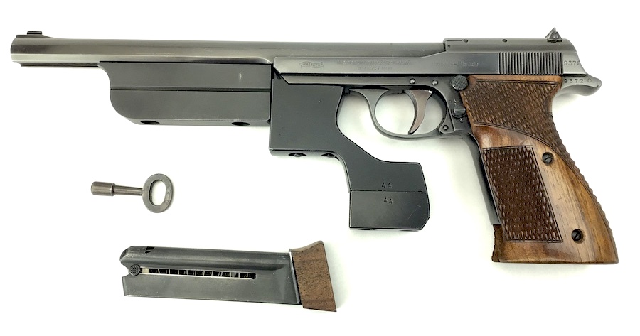 2/9/21 – Original and excellent condition 1936 Walther Olympia Fünfkampf (Pentathlon). This model has the weights and a weight key for easy removal. The original design was developed for use by the German Olympic team who used it during the 1936 Berlin Olympics. This is the “Fünfkampf” version, or “Pentathlon” of the Olympia pistol. It is chambered for the .22 Long Rifle and has a 9-1/2″ barrel. The rear sight is adjustable for windage. This example has retained about 98% of its original bluing. There is only minor wear along the barrel and the high edges. The original grips are excellent. The gun is all matching, except for the magazine. It has “Crown N” proofs. It was made in the Zella-Mehlis factory. The bore is minty.