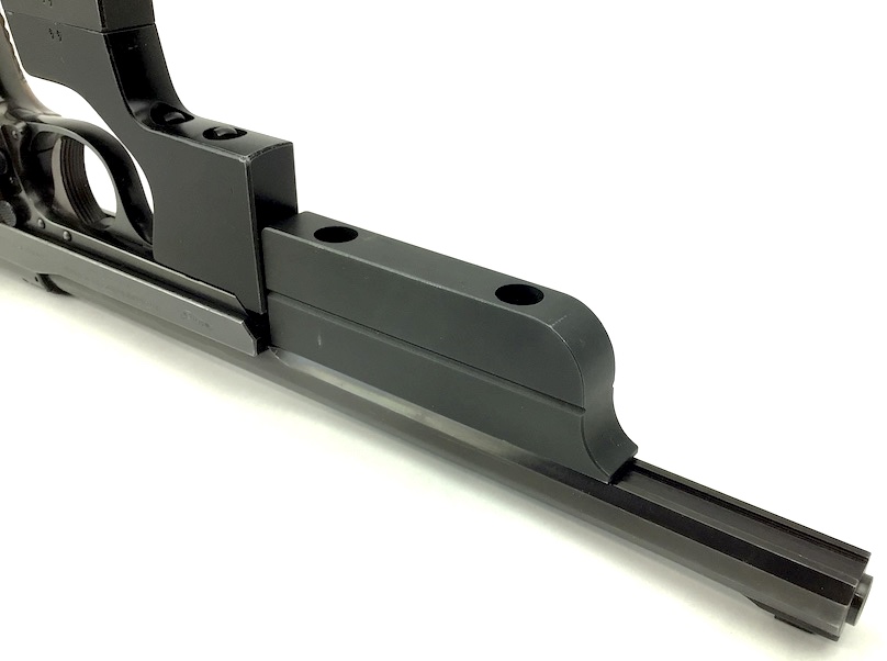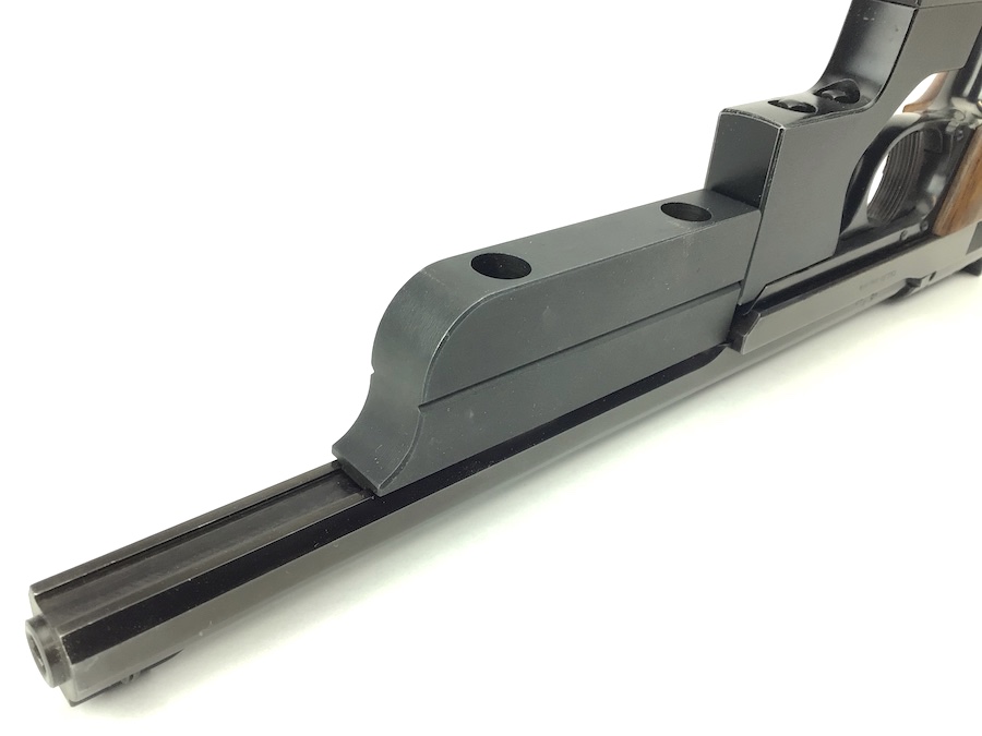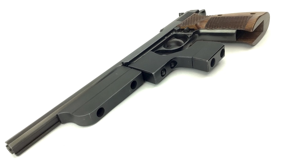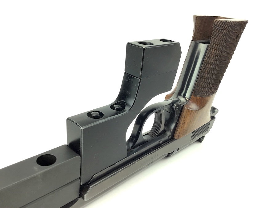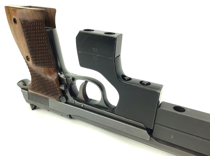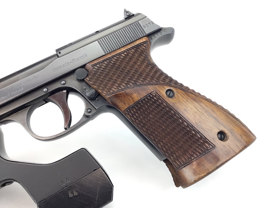 2/9/21 – Original and excellent condition 1936 Walther Olympia Fünfkampf (Pentathlon). This model has the weights and a weight key for easy removal. The original design was developed for use by the German Olympic team who used it during the 1936 Berlin Olympics. This is the “Fünfkampf” version, or “Pentathlon” of the Olympia pistol. It is chambered for the .22 Long Rifle and has a 9-1/2″ barrel. The rear sight is adjustable for windage. This example has retained about 98% of its original bluing. There is only minor wear along the barrel and the high edges. The original grips are excellent. The gun is all matching, except for the magazine. It has “Crown N” proofs. It was made in the Zella-Mehlis factory. The bore is minty.