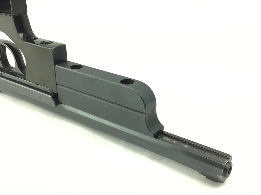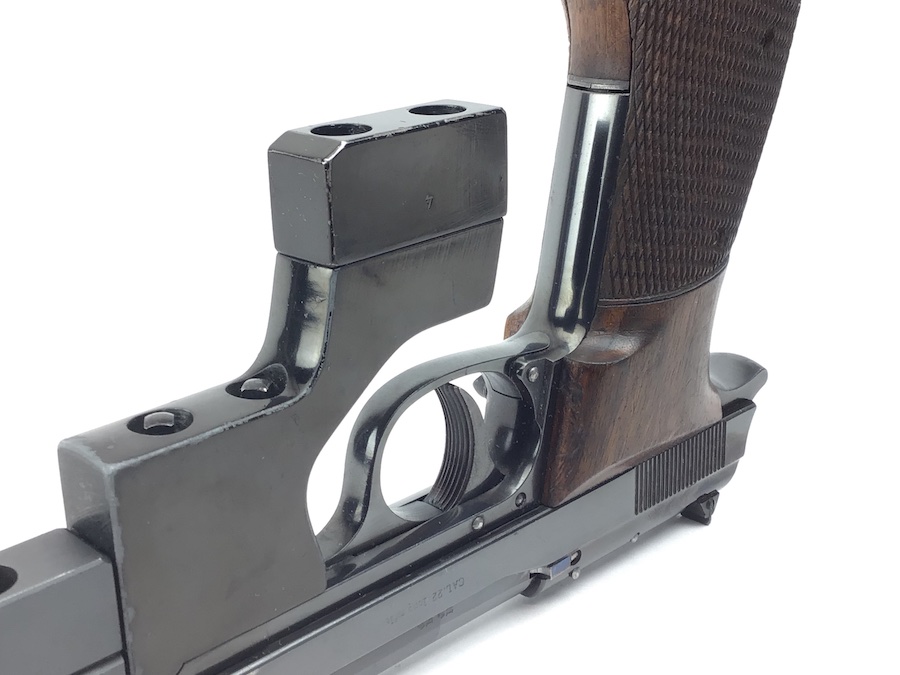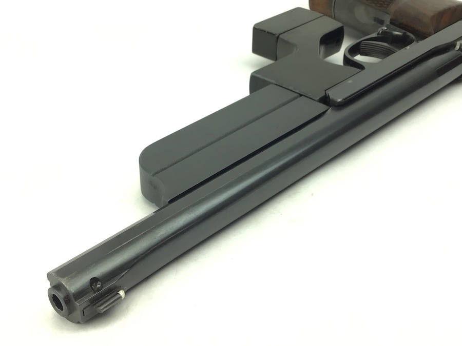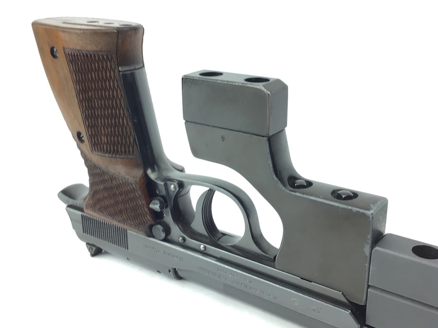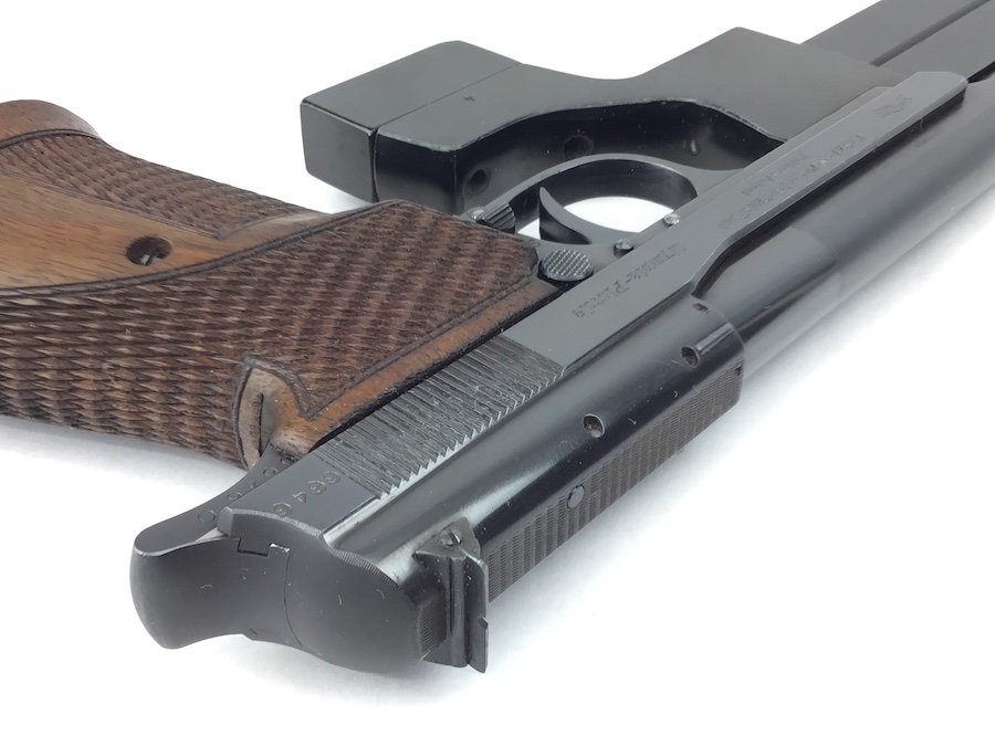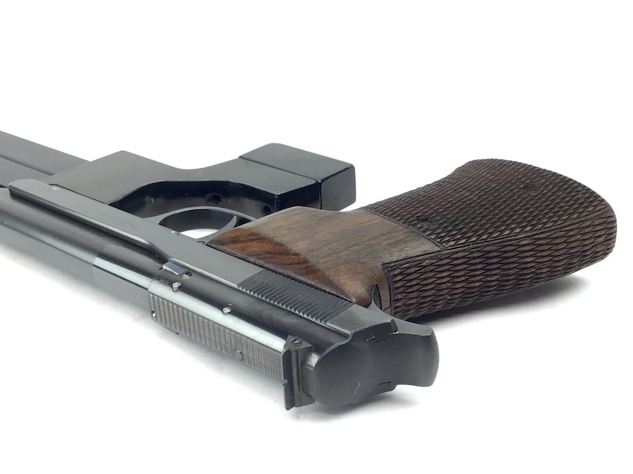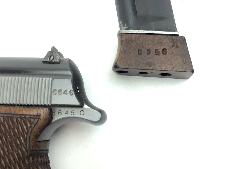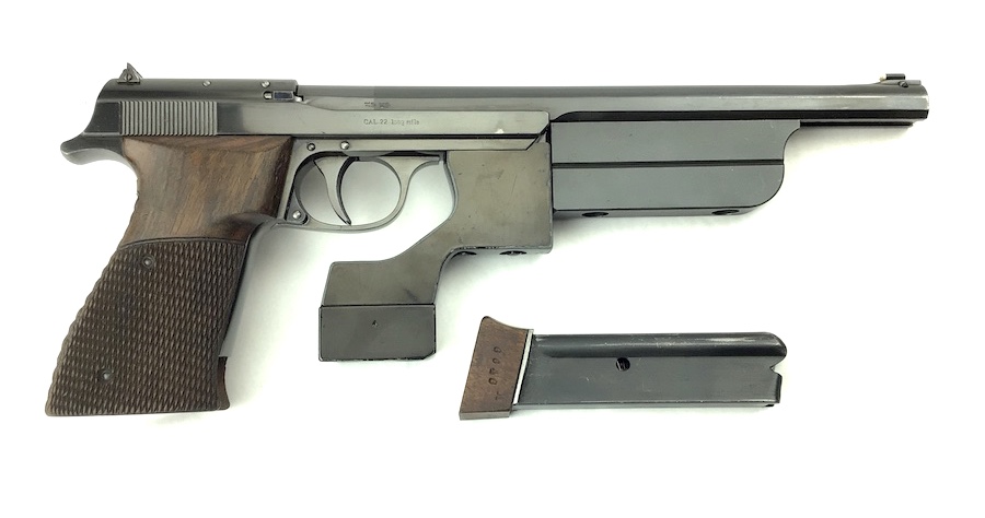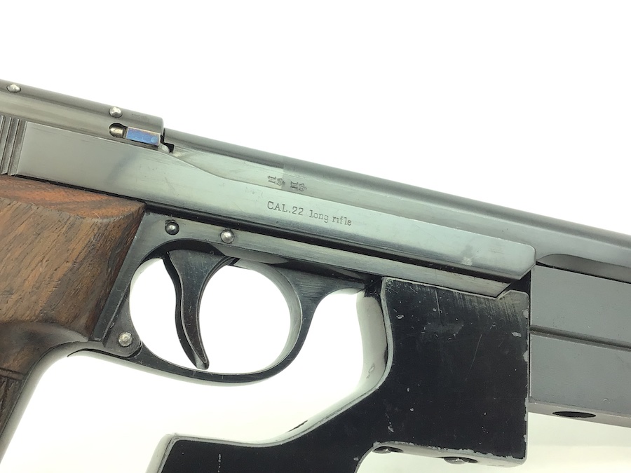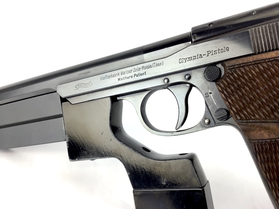 2/18/21 – Original and excellent condition 1936 Walther Olympia Fünfkampf (Pentathlon) with matching magazine. This model has the weights that increases stability for match shooting. The original design was developed for use by the German Olympic team who used it during the 1936 Berlin Olympics. This is the “Fünfkampf” version, or “Pentathlon” of the Olympia pistol. It is chambered for the .22 Long Rifle and has a 9-1/2″ barrel. Ivory front site. The rear sight is adjustable for windage. This example has retained about 98% of its original bluing. There is only minor wear along the barrel and the high edges. The original grips are excellent. The gun is all matching, including the magazine and grips. It has “Crown N” proofs. It was made in the Zella-Mehlis factory. The bore is minty. Discreet import mark, “Allemagne” on the left side of the barrel.