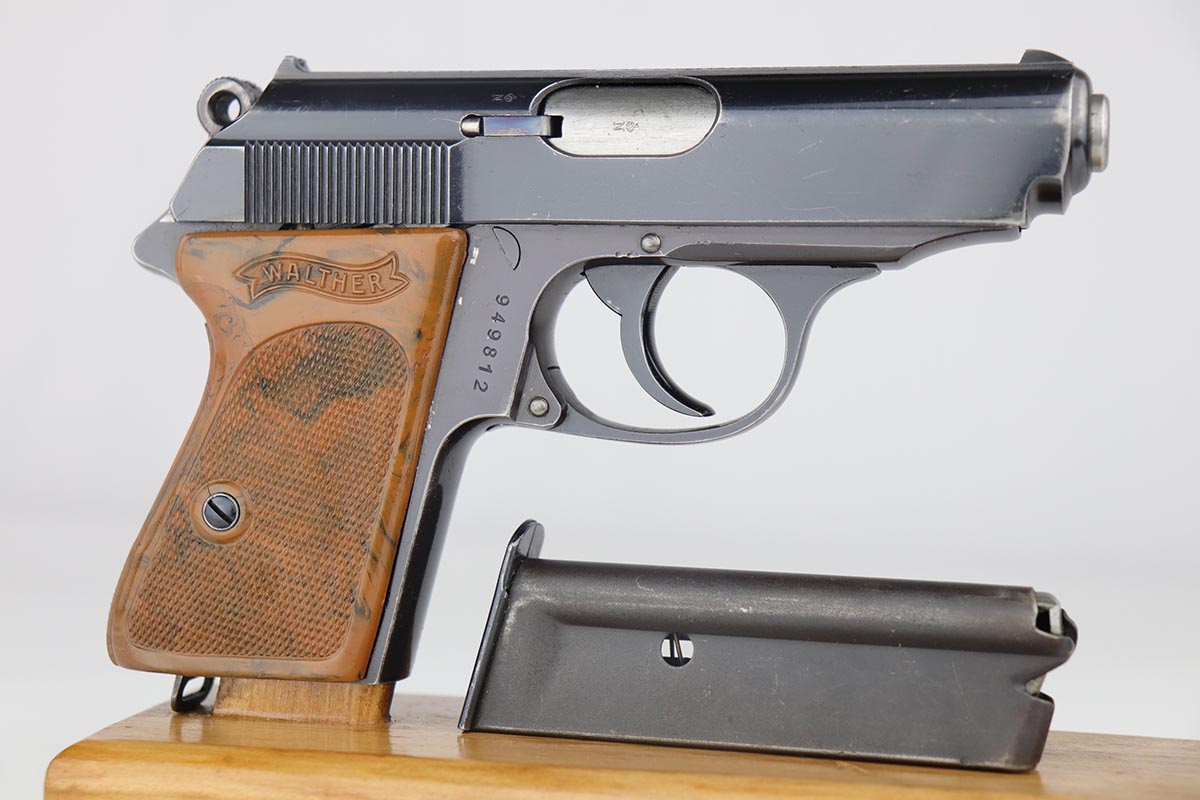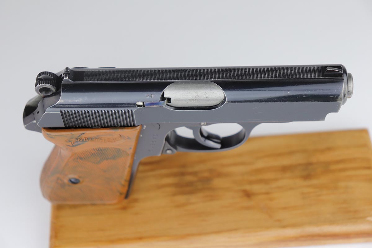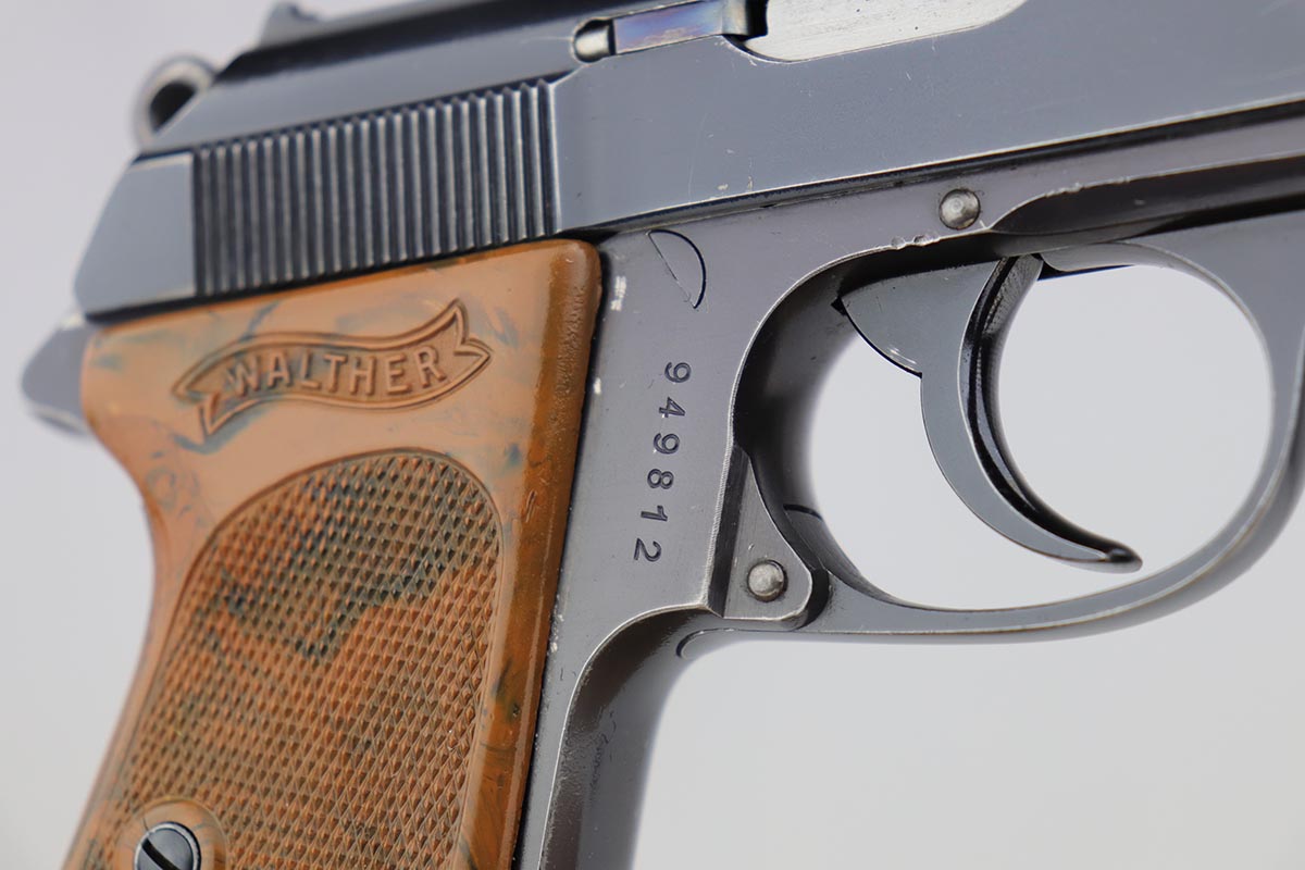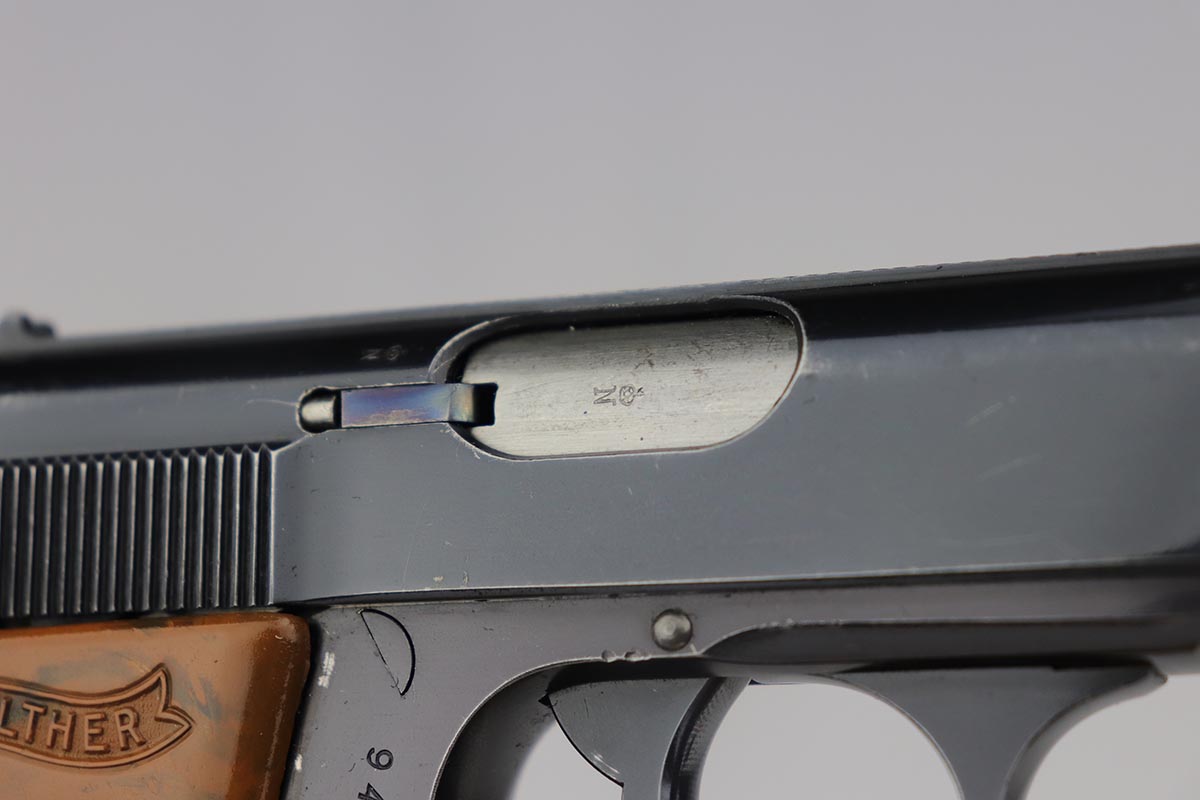 7/23/19 – This is an excellent and original Walther PPK from the early Nazi era, chambered for the scarce .22LR. The pistol retains 95-97% high-polish blue, with minor edge wear on both sides of the slide and trigger guard. There are also a couple small scratches near the safety on the slide. Mint bore and nice, original grip with only a minor surface crack on the right side. Early 90 degree safety.