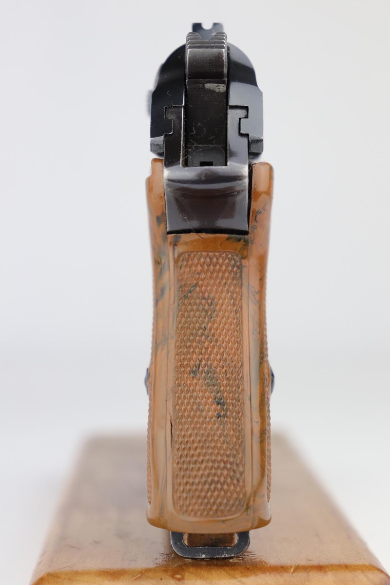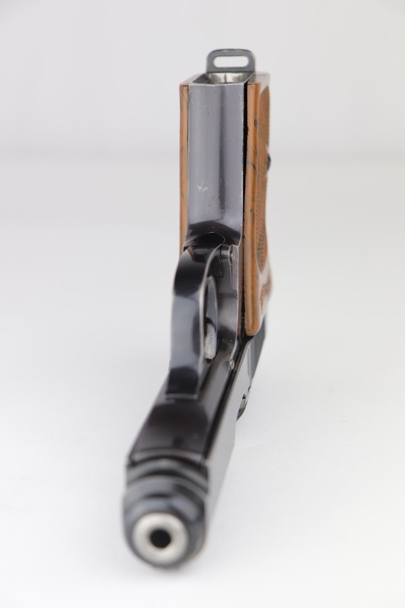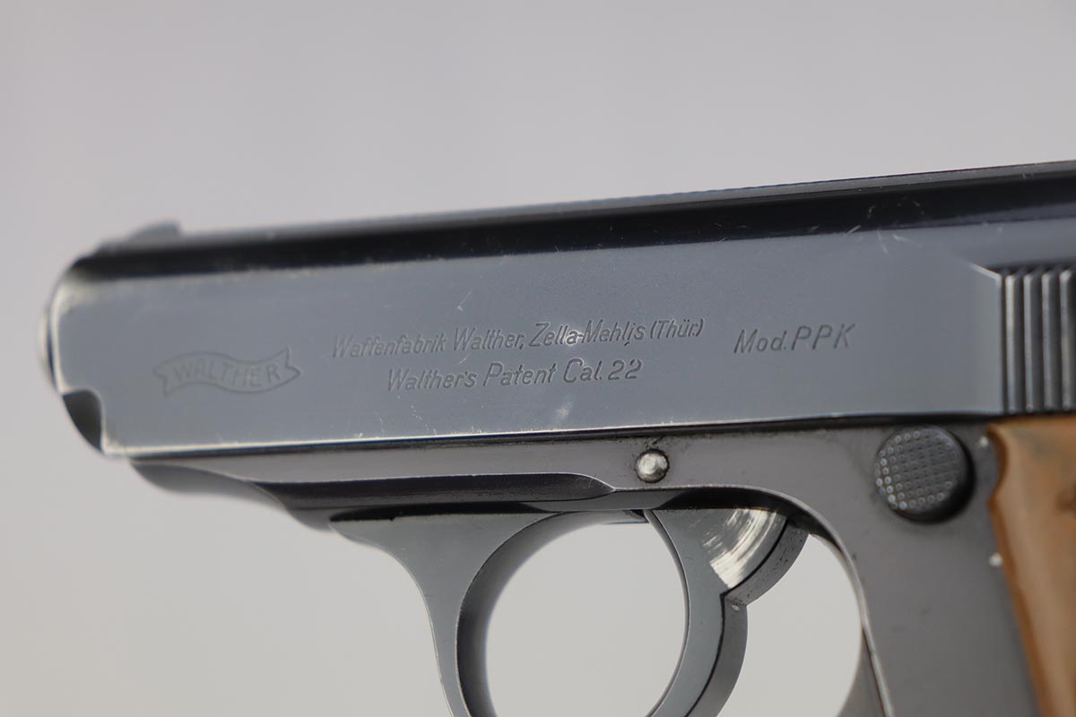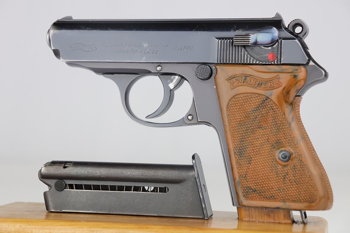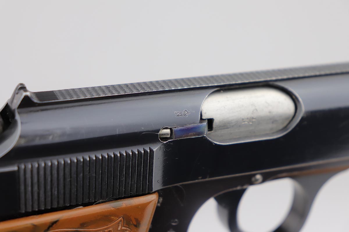 7/23/19 – This is an excellent and original Walther PPK from the early Nazi era, chambered for the scarce .22LR. The pistol retains 95-97% high-polish blue, with minor edge wear on both sides of the slide and trigger guard. There are also a couple small scratches near the safety on the slide. Mint bore and nice, original grip with only a minor surface crack on the right side. Early 90 degree safety.