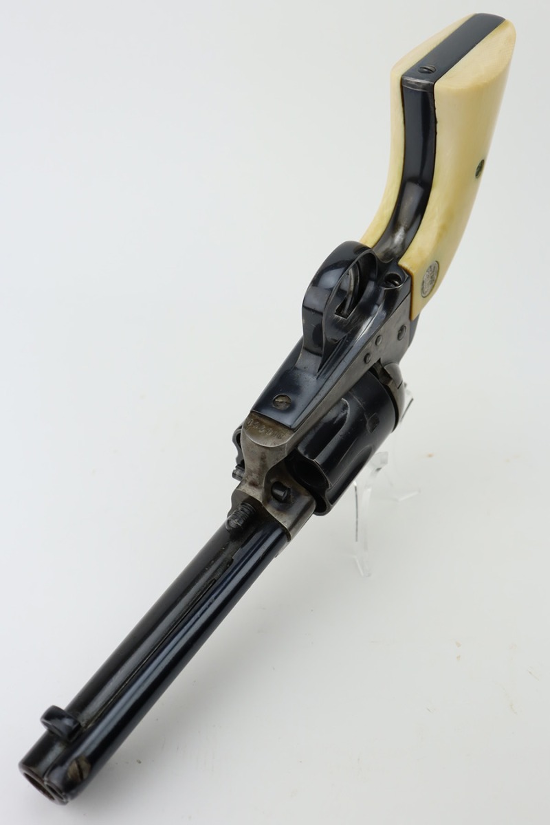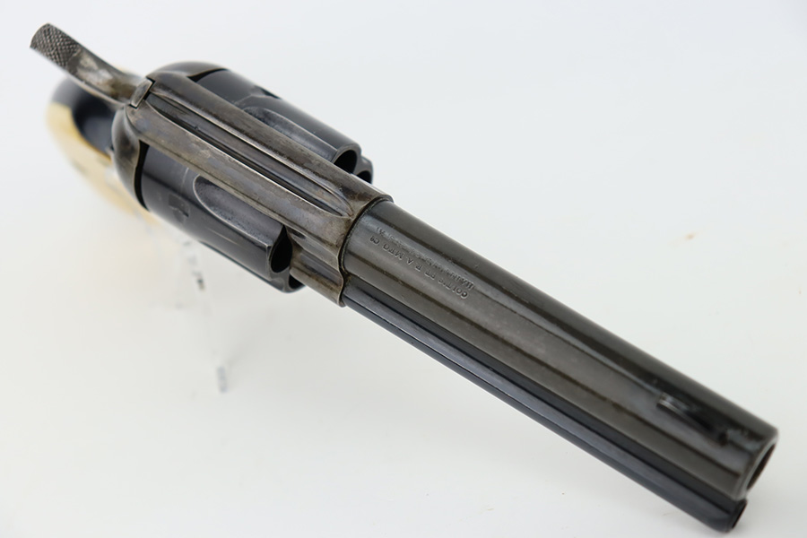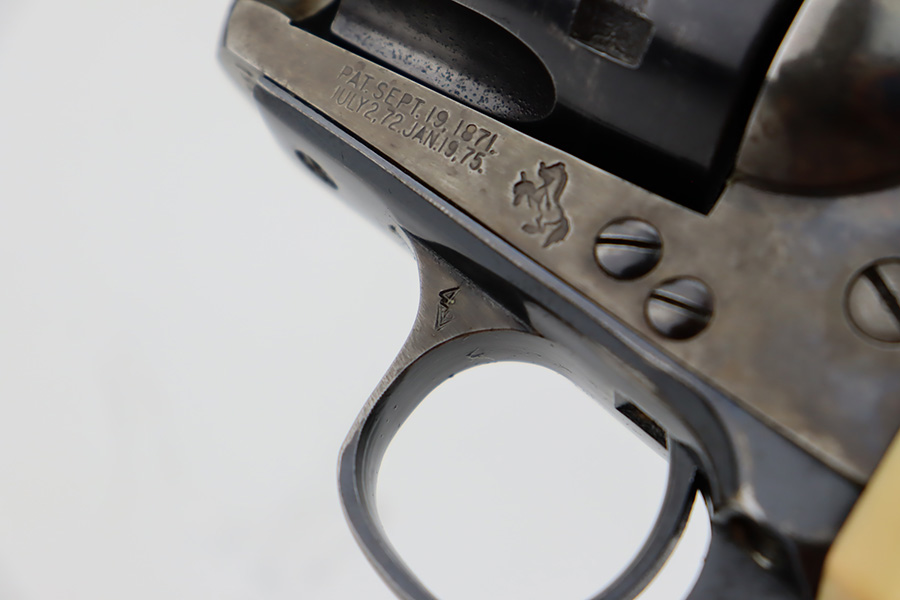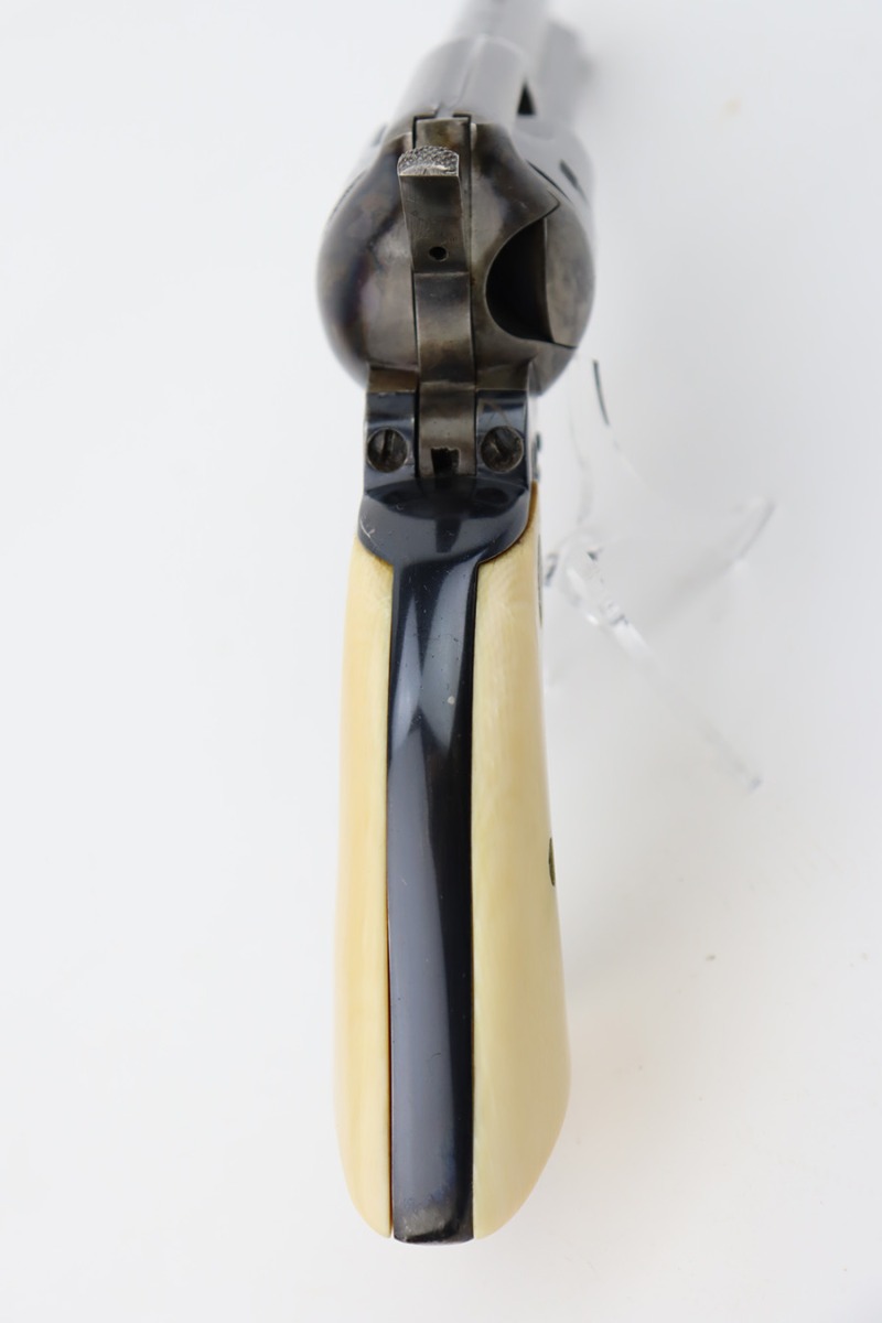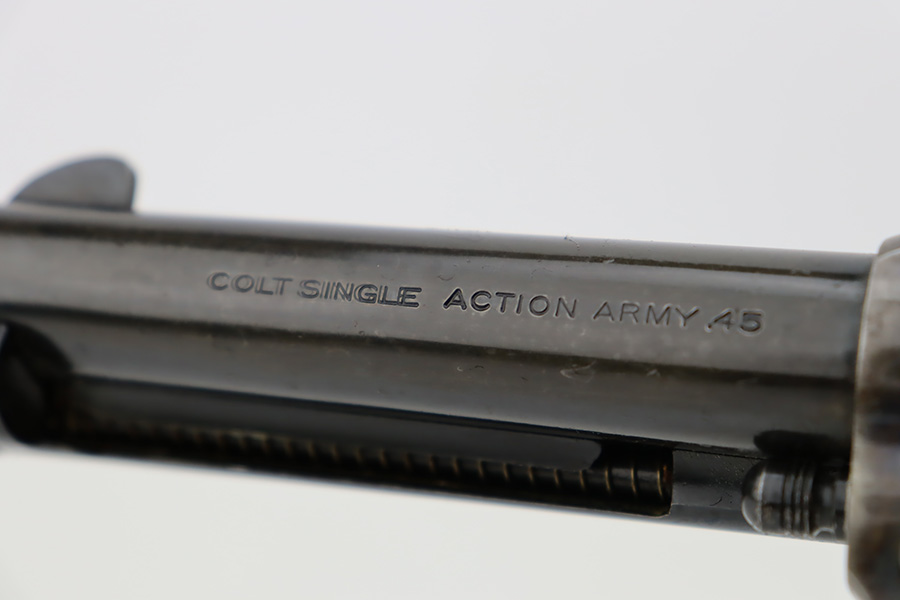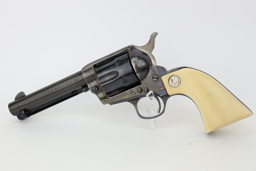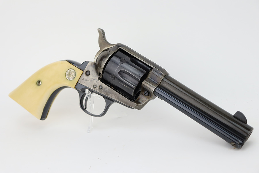 10/18/23 – This is a very nice Colt Single Action Revolver, manufactured in 1937 and chambered in .45 Caliber. 4.75″ barrel. It has retained about 80% of its original finish with areas of minor thinning and very light brown patina along the barrel and on both sides of the frame. Fitted with ivory grips. Minty bore. Fully functional, and the action is smooth.