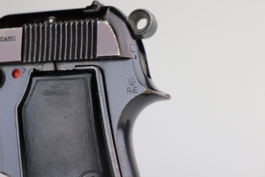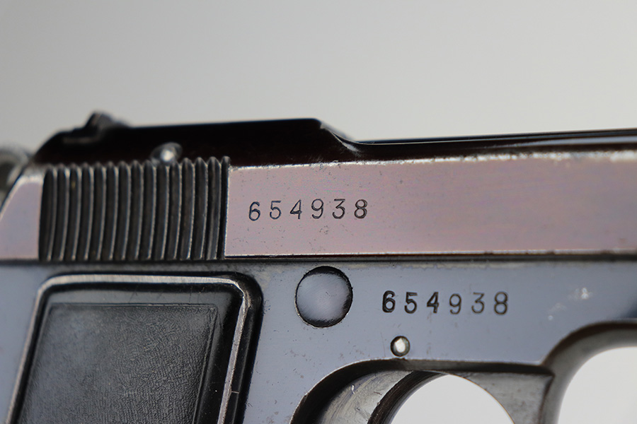 1/11/22 – This is a very nice example of a Beretta Model 1934 issued to the Royal Italian military in 1937. The gun is all matching and has the proper “Crown RE” Italian military acceptance proof on the left side of the tang. The gun has retained about 85% of its original high polish finish. The whole slide has a really nice plumb color. There light, somewhat scratchy wear and freckling on both grip straps. Minor wear on the slide, concentrated around the high edges and around the muzzle. Comes with an excellent pair of black bakelite grips and one proper magazine. The bore has decent rifling, but there is pitting in the grooves.