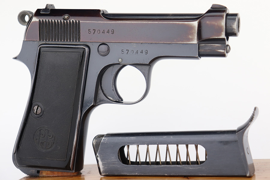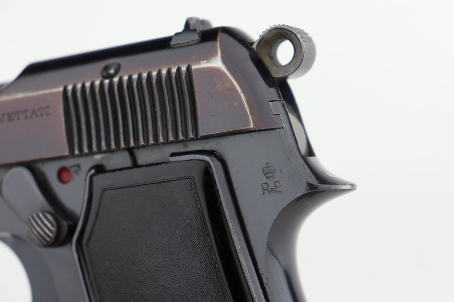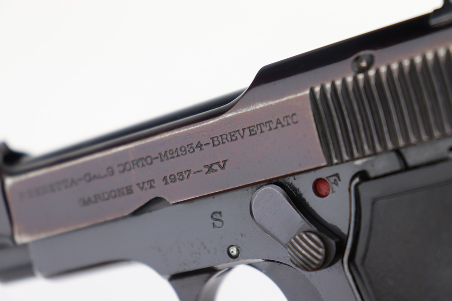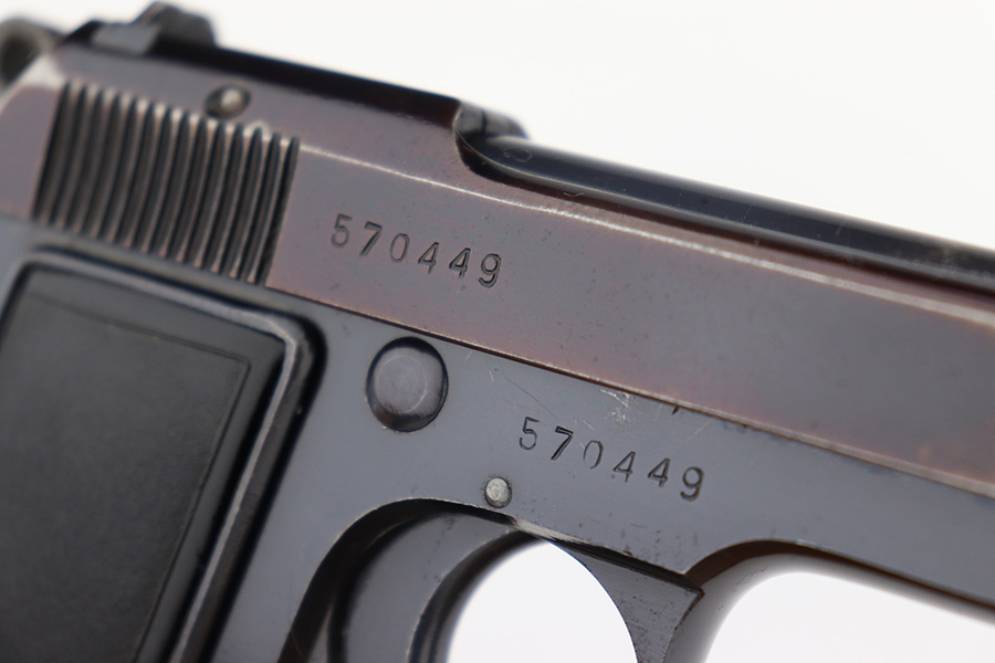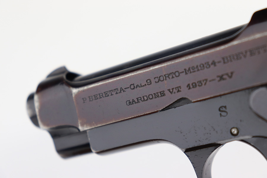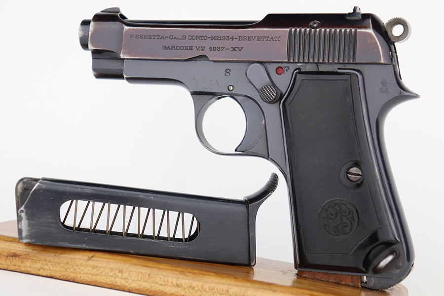 12/6/22 – This is a very nice example of a Beretta Model 1934 issued to the Italian military in 1937. It is all matching and has the proper “Crown RE” Italian military proofs on the left side of the frame. It has retained about 93% of its original high polish finish. The slide has a really nice plum color. There is just minor wear around the muzzle and on the high edges of the slide. Fitted with excellent period-correct black bakelite grips and comes with one proper magazine. The rifling in the bore is a bit worn with minor pitting throughout.