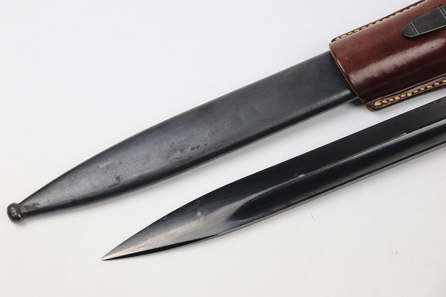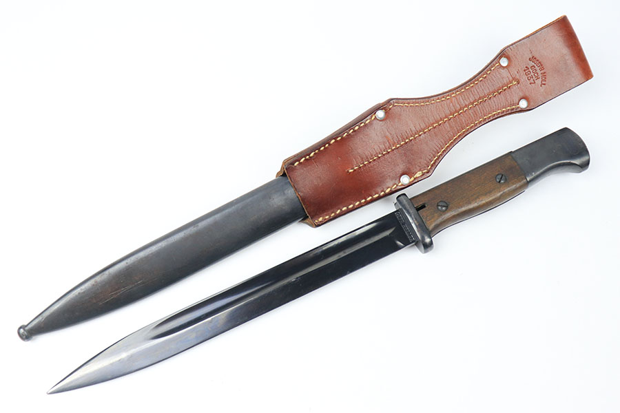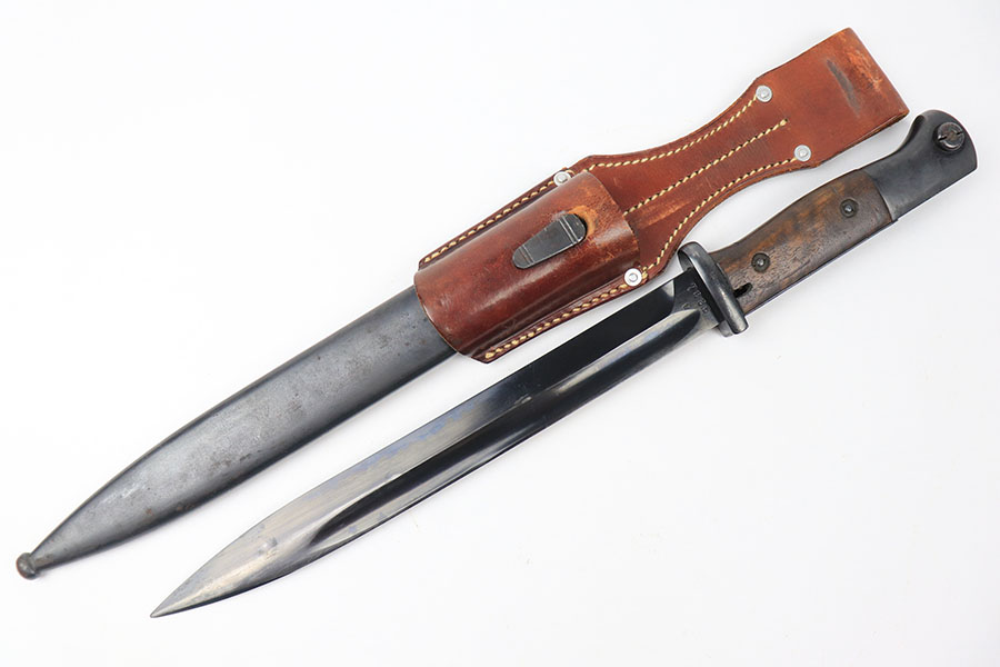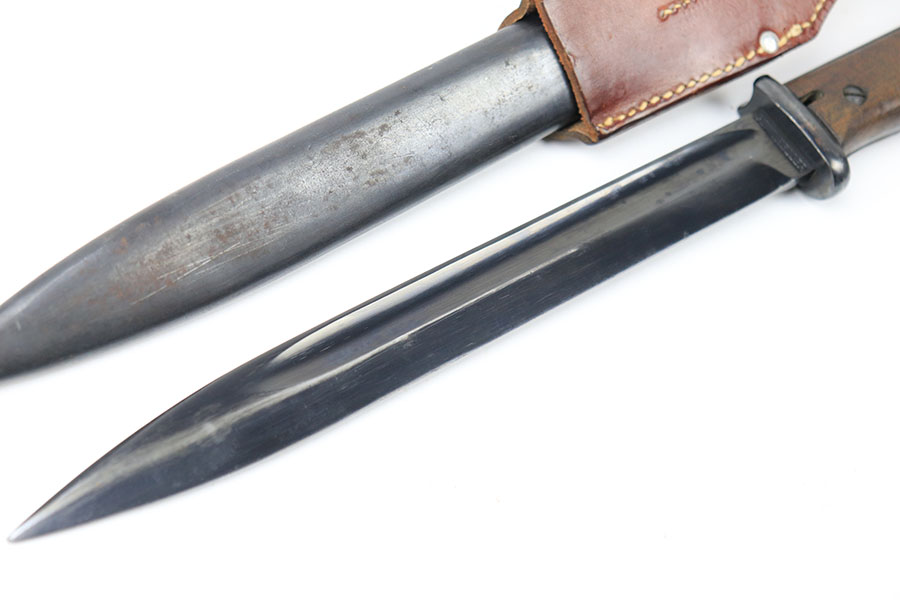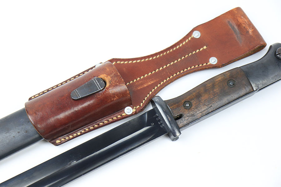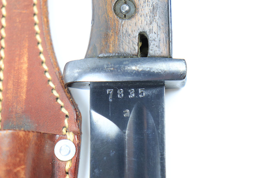 8/20/21 – This is an original 1937 dated K98 bayonet with a matching serial numbered scabbard. The bayonet has an excellent, clean blade that’s never been sharpened. The blade has some mild finish loss but no rust or pitting. The wood handle is in great condition as well. There’s some mild patina on the metal areas of the handle. Comes with a minty leather frog and a scabbard that’s free of dents. Some mild patina throughout the scabbard.