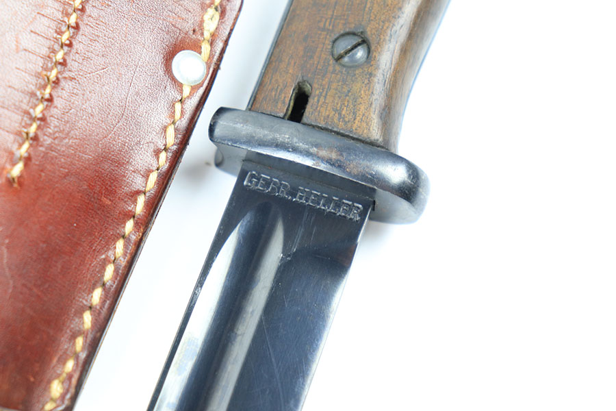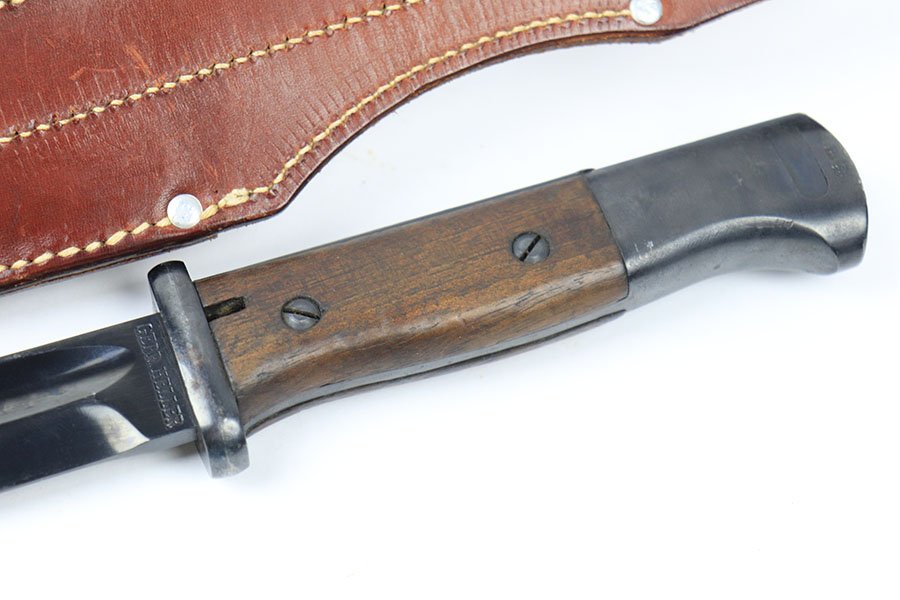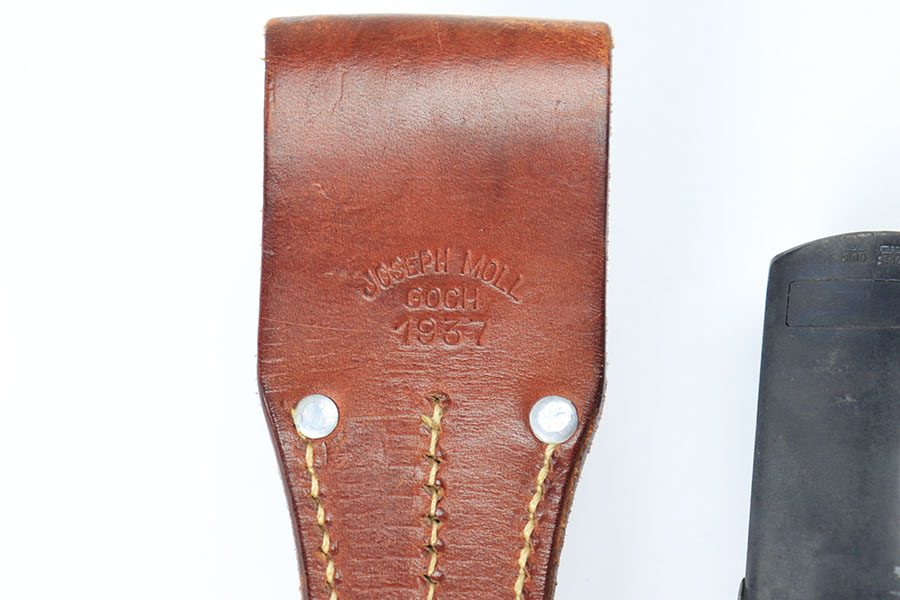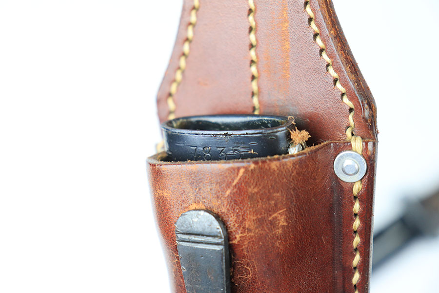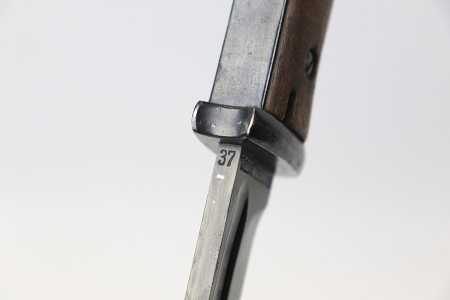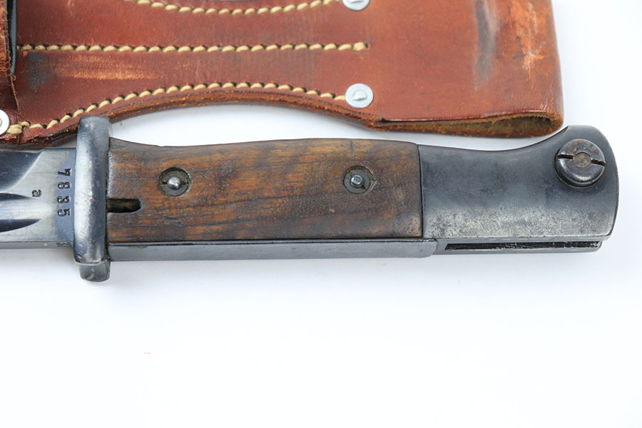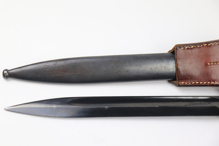 8/20/21 – This is an original 1937 dated K98 bayonet with a matching serial numbered scabbard. The bayonet has an excellent, clean blade that’s never been sharpened. The blade has some mild finish loss but no rust or pitting. The wood handle is in great condition as well. There’s some mild patina on the metal areas of the handle. Comes with a minty leather frog and a scabbard that’s free of dents. Some mild patina throughout the scabbard.