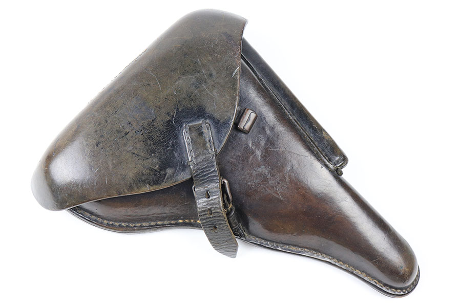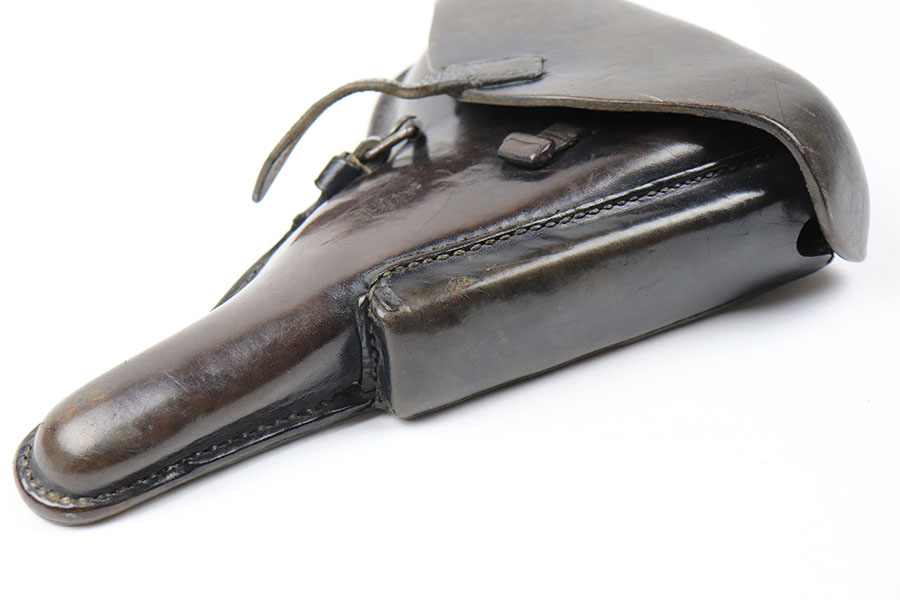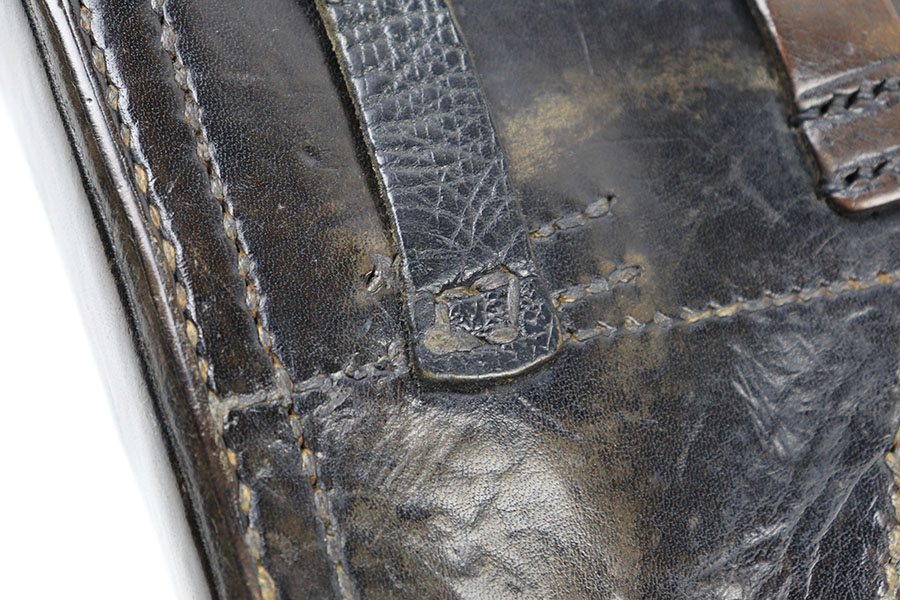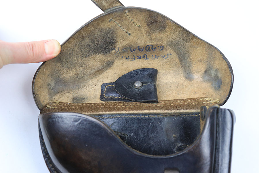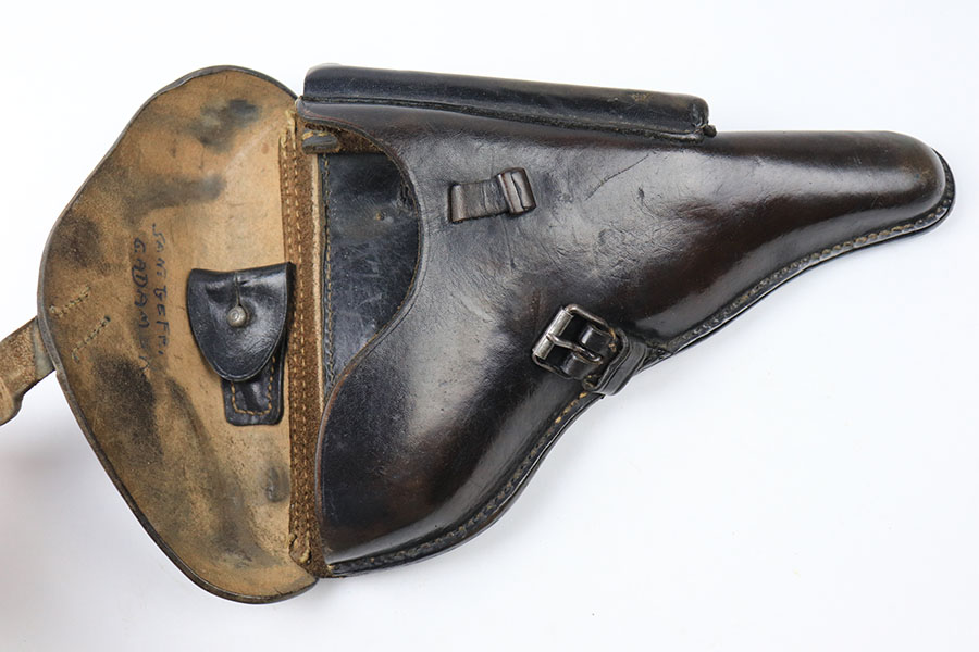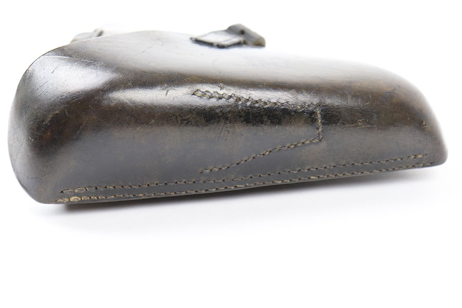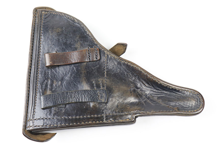 9/3/21 – This is an original 1937 dated Luger holster from WW2. The holster is maker stamped, dated, and waffen proof stamped on the back leather. The left belt loop is replaced, and appears to be a period-repair. the lower back leather has three scratches into the leather, but they don’t go completely through the leather. The upper right corner of the back leather has a name “Franz” impressed into the leather. Another name is written inside the leather. The stitching is completely in tact. Normal leather pliability.