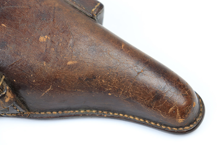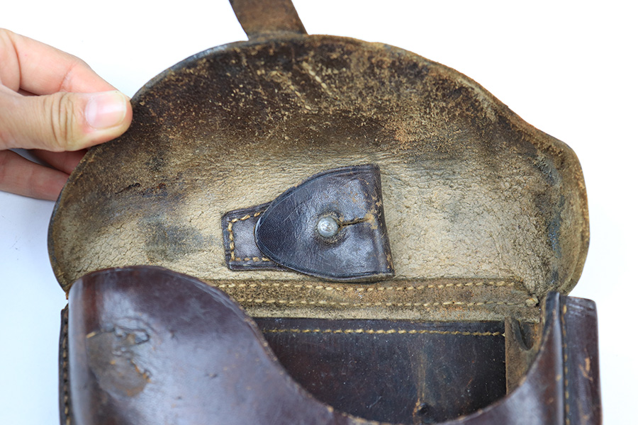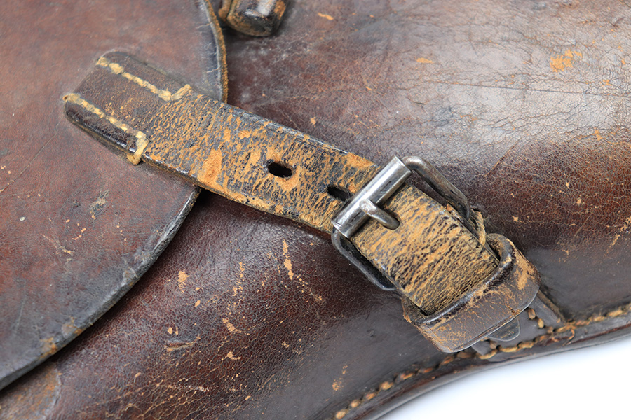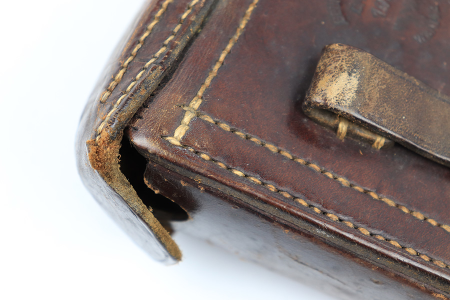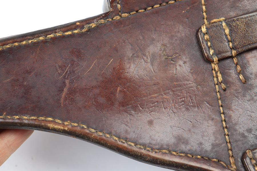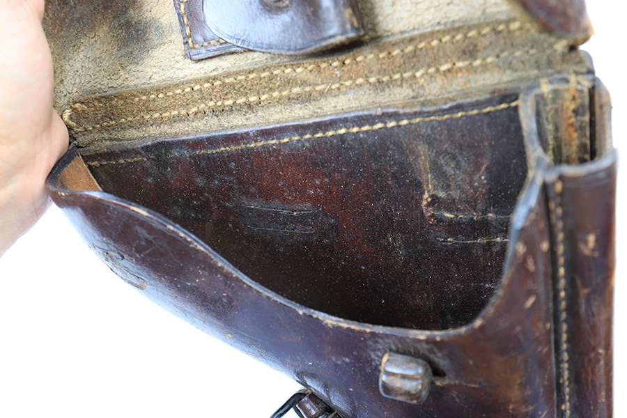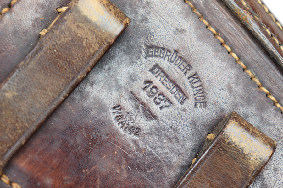 6/29/22 – This is an original 1937 dated Luger holster from WW2. The holster is maker stamped, dated, and waffen proofed on the back leather. The leather is in good overall condition with some surface wrinkling and mild cracking on the front leather and closure strap. The back leather has some names lightly scratched into the leather as shown. The top leather has a few loose stitches, but overall the stitching is in great condition and all original. Fairly clean interior leather.
