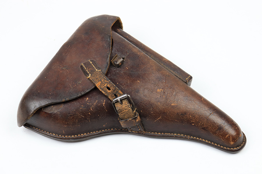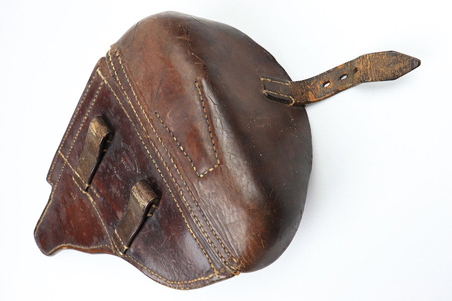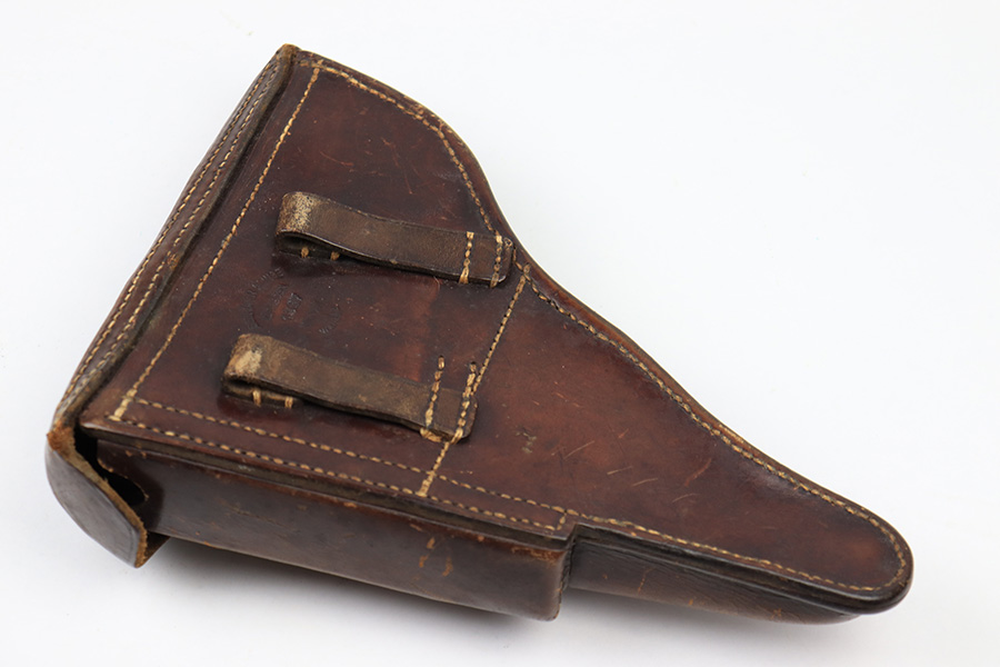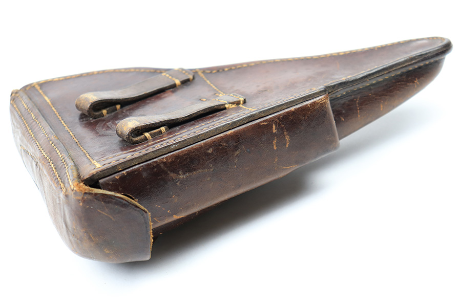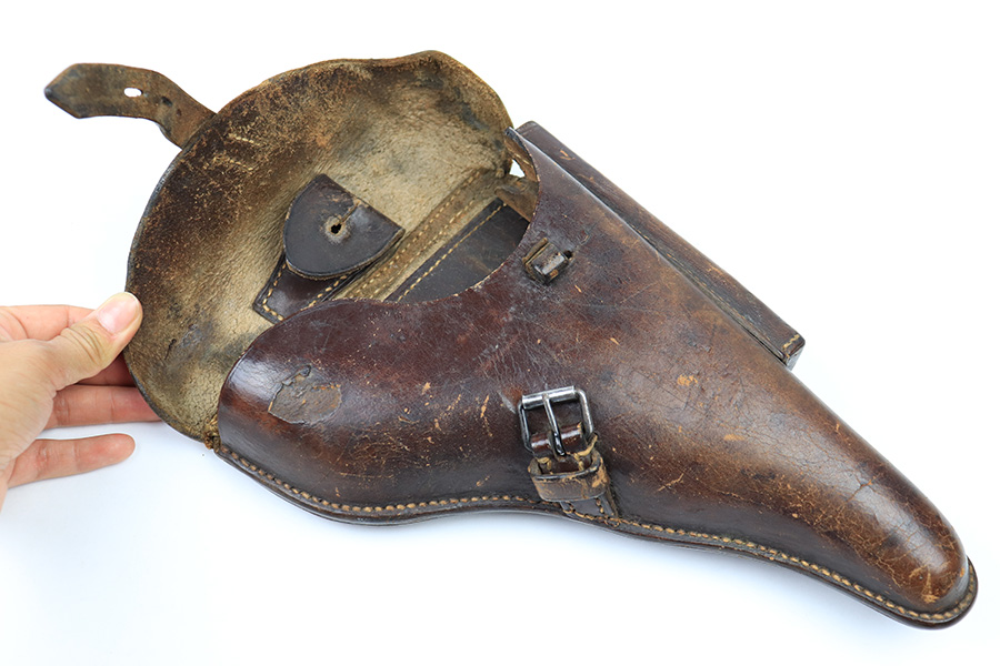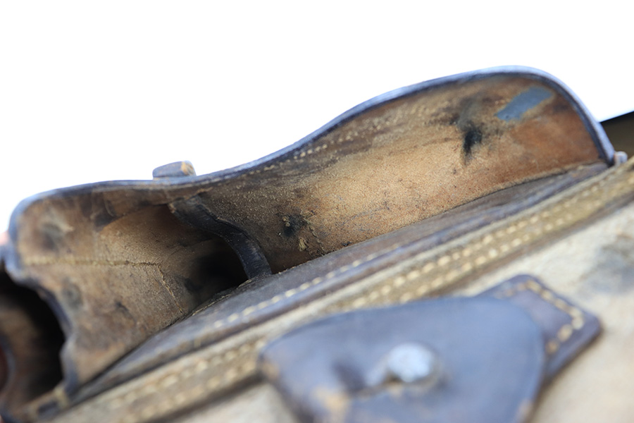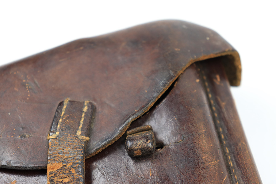 6/29/22 – This is an original 1937 dated Luger holster from WW2. The holster is maker stamped, dated, and waffen proofed on the back leather. The leather is in good overall condition with some surface wrinkling and mild cracking on the front leather and closure strap. The back leather has some names lightly scratched into the leather as shown. The top leather has a few loose stitches, but overall the stitching is in great condition and all original. Fairly clean interior leather.