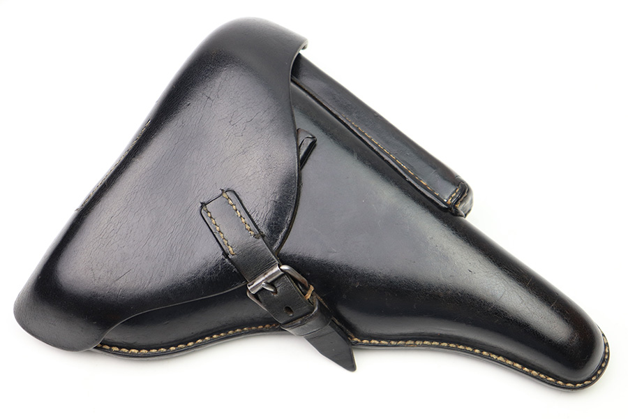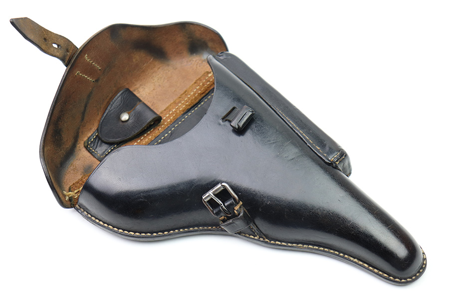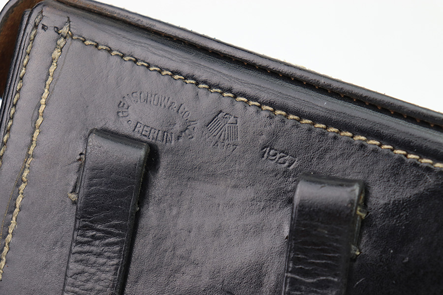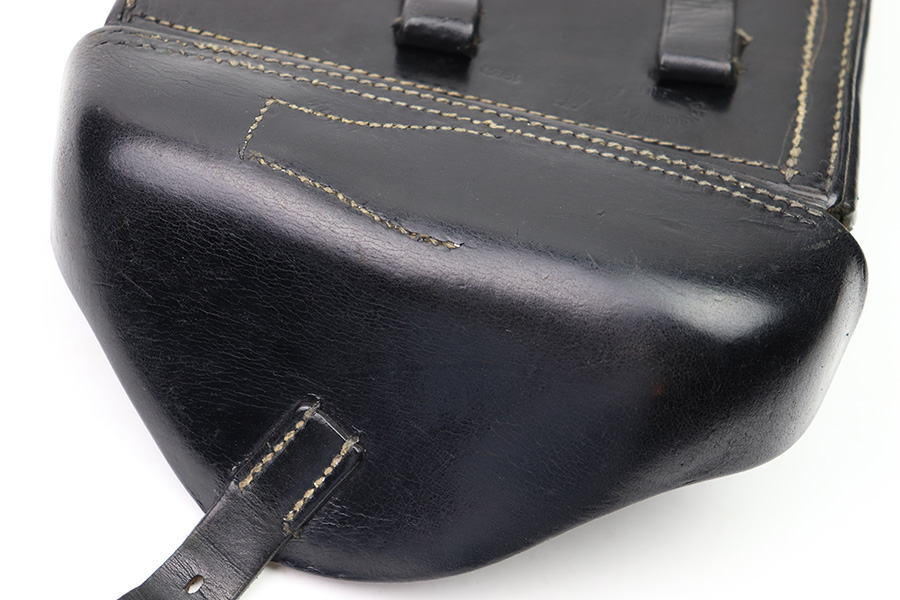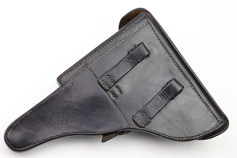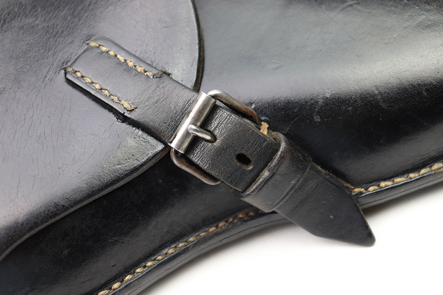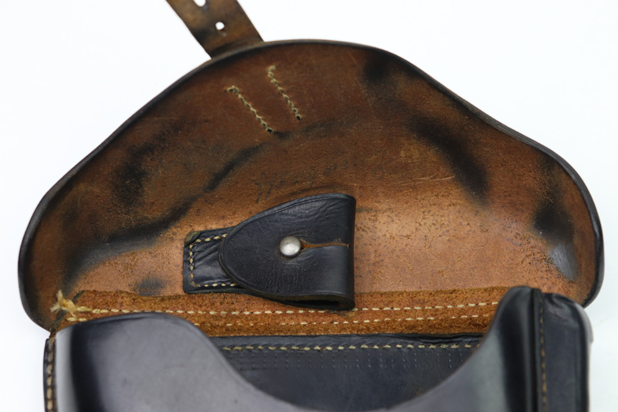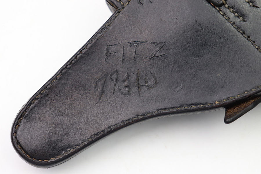 8/25/22 – This is an original 1937 dated Luger holster from WW2. We’d rate this holster as “excellent”, except the back leather has a name and serial number scratched into the leather, “FITZ 79140”. The rest of the leather is very clean with mild pliability and beautiful black finish. The stitching is all original and intact. Clean interior leather as well. Maker stamped, dated, and waffen proofed on the back leather as shown.