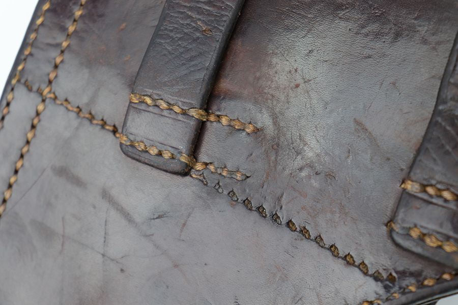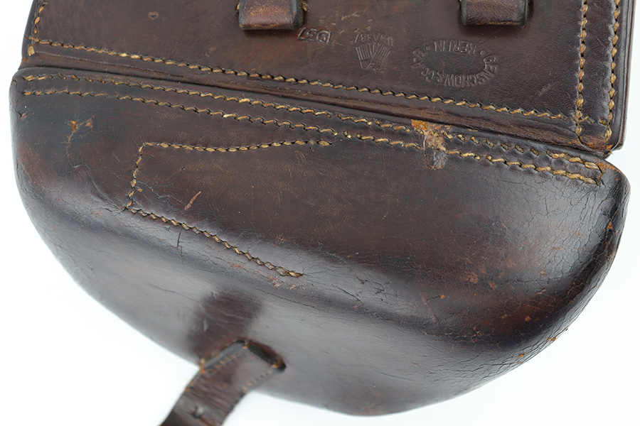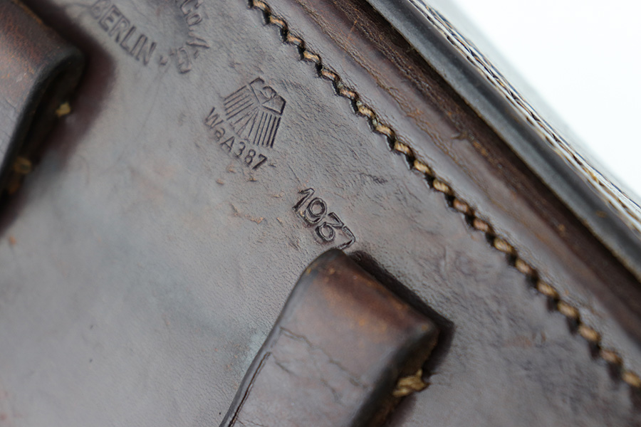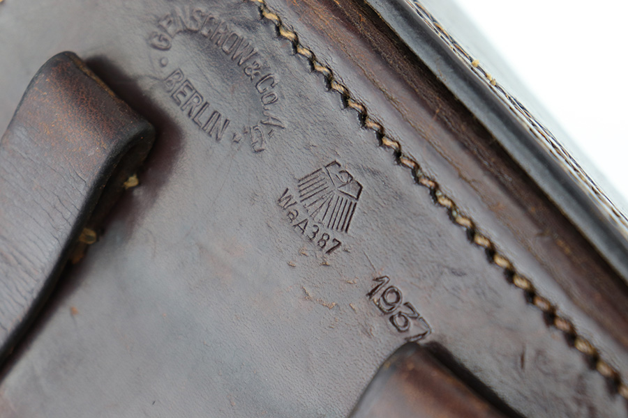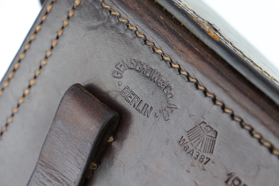 5/23/23 – This is an original 1937 dated Luger holster from WW2. The holster is a very nice, straightforward example with crisp markings and no major issues. The back leather is maker stamped, dated, and waffen military proof stamped. The droop winged eagle proof indicates this was produced in early 1937. The dark brown leather has some light surface wrinkling and minor cracking throughout the front leather and closure strap. The interior leather has normal signs of use and aging. All original stitching is tight throughout.