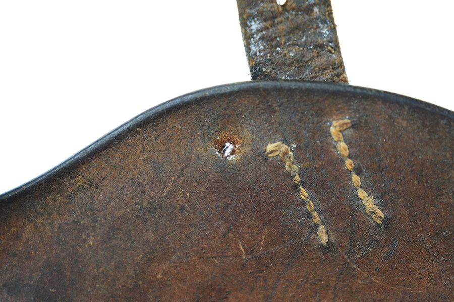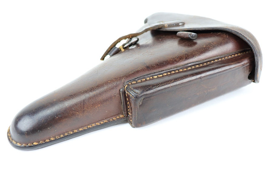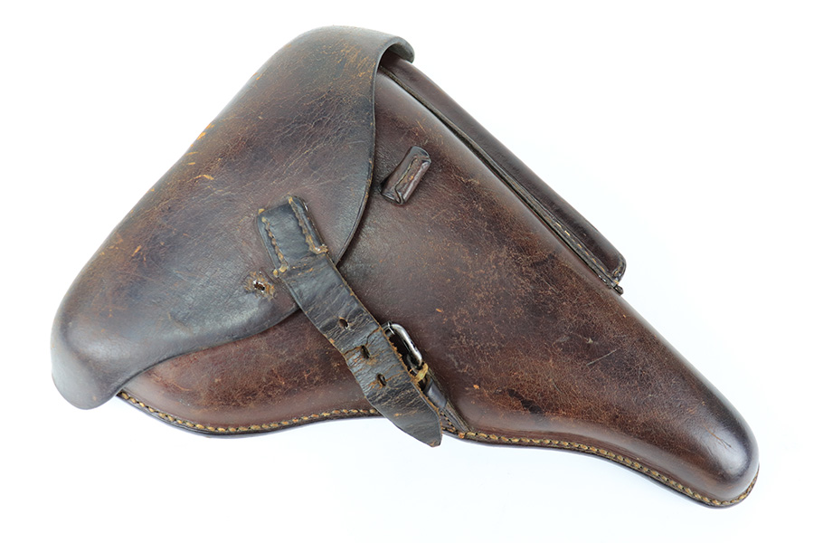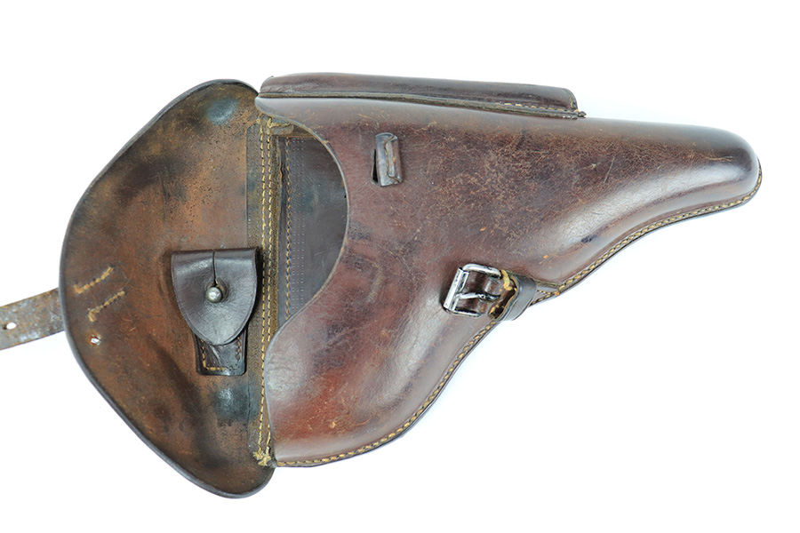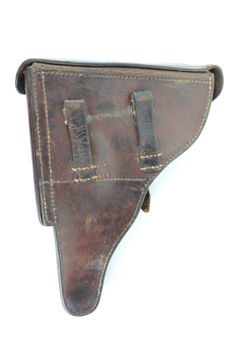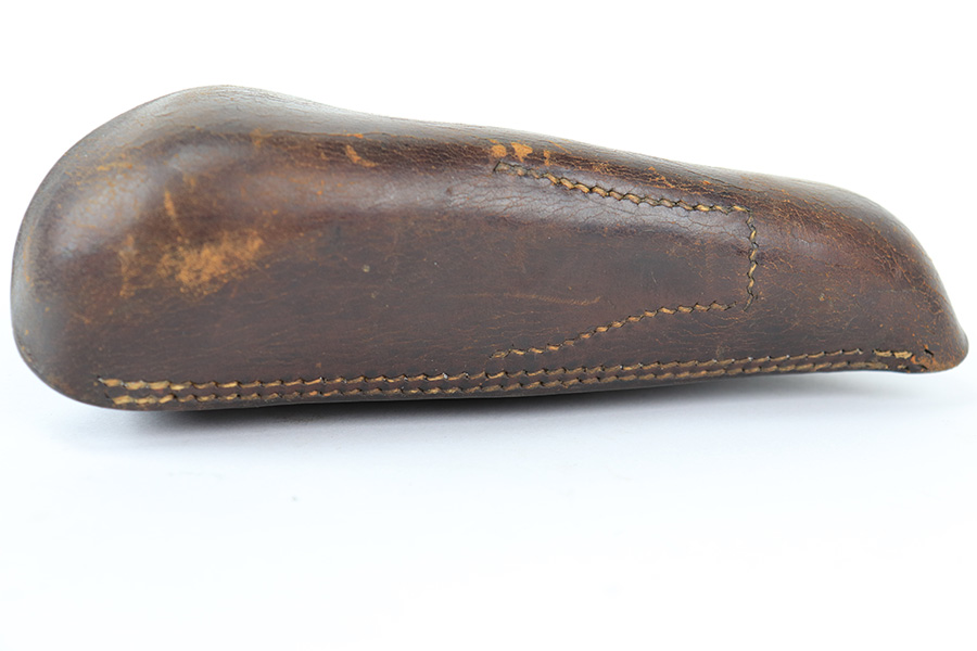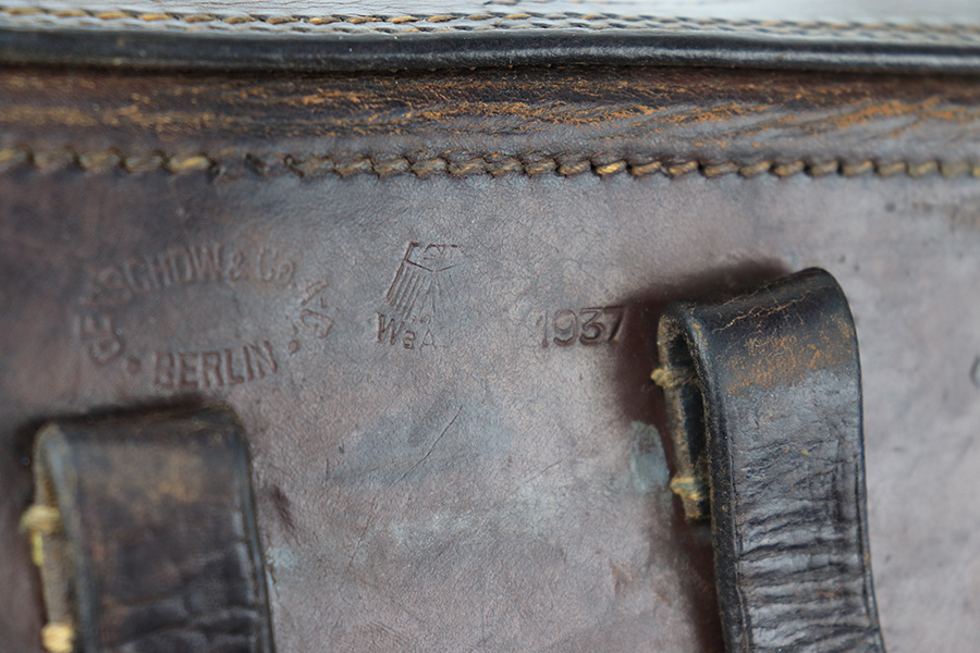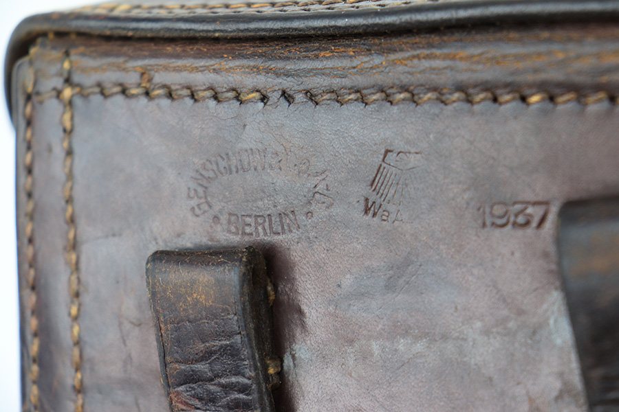 3/21/22 – This is an original 1937 dated Luger holster. The holster is stamped on the back leather with a maker stamp, waffen proof, and date stamp. We refer to this holster as a “1st variation” 1937 holster because the waffen proof is a droop winged eagle, and not stick winged. 1937 was the year the Germans switched to the stick winged variation proof stamp, so this holster was most likely made in the beginning of 1937. The leather is in good overall condition despite a small hole on the front lid, near the closure strap. Otherwise the leather has typical pliability and mild surface wear throughout. No stitching issues.