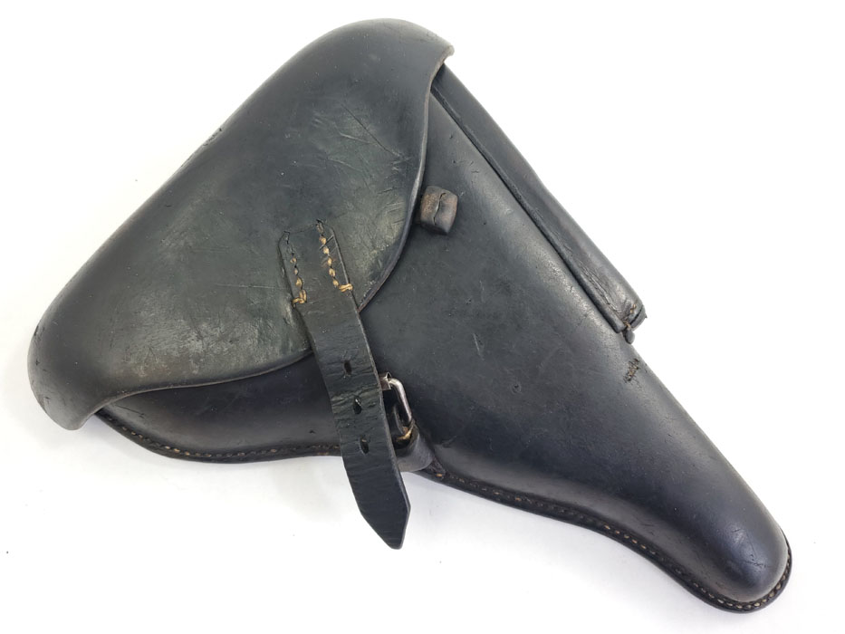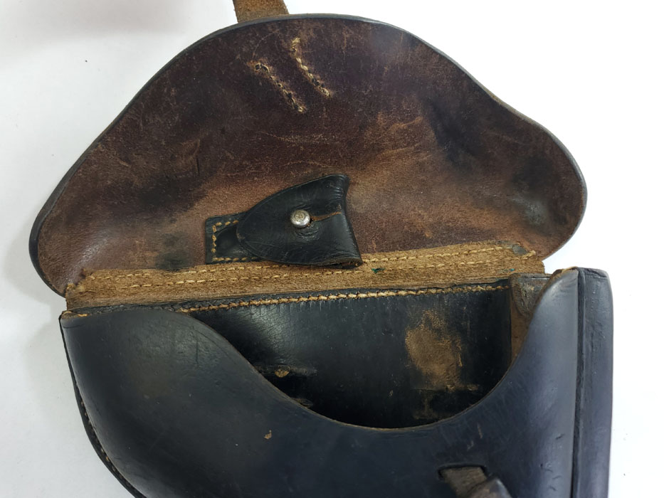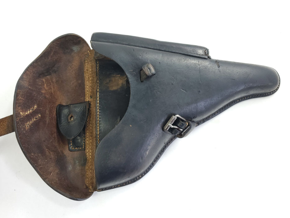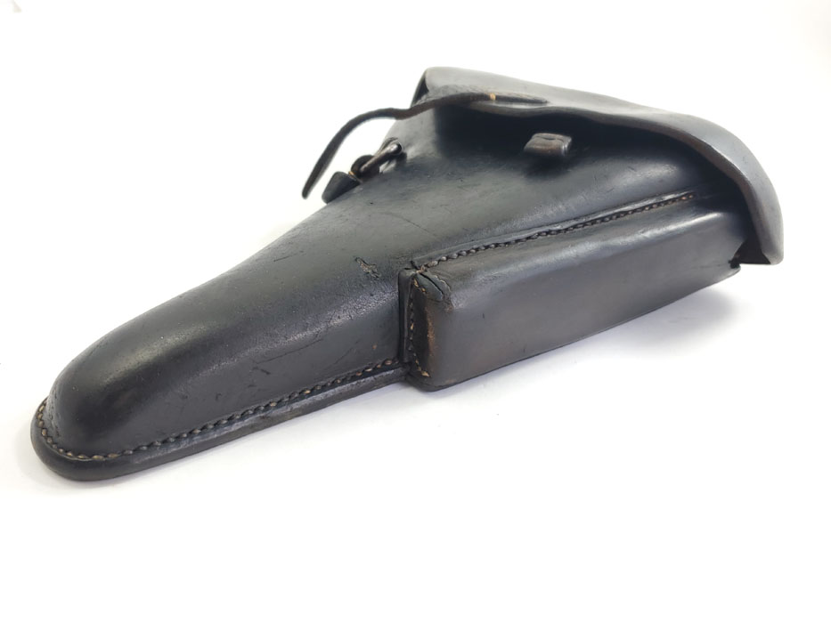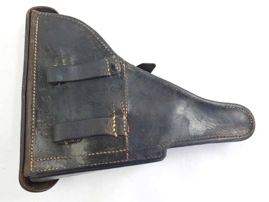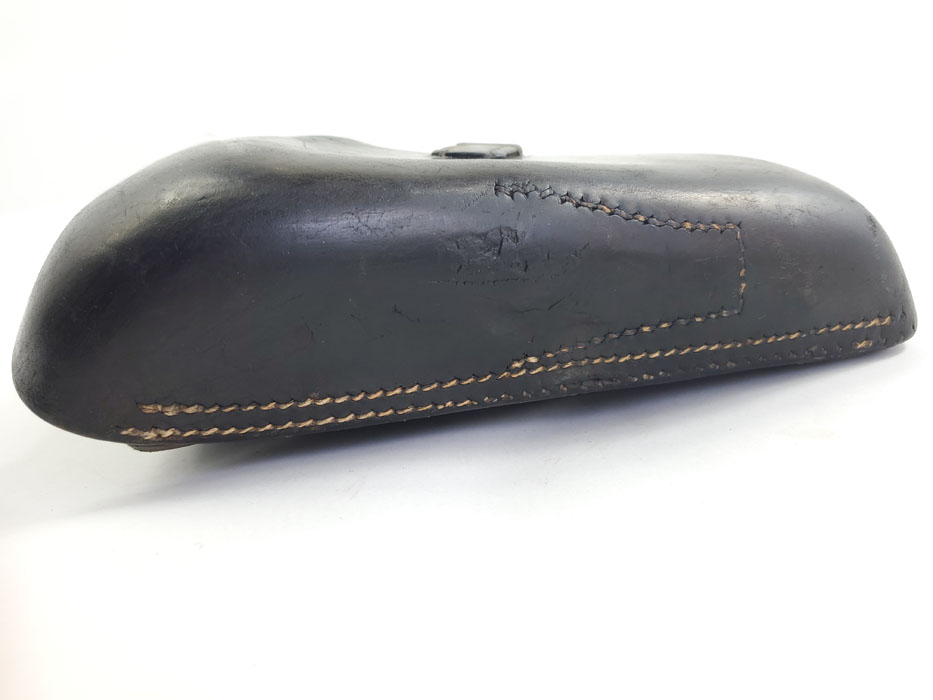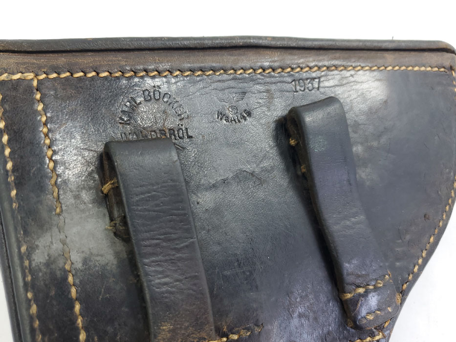 5/29/20 – This is an original 1937 dated Luger holster from WW2. The holster is stamped with a crisp maker marking, date, and waffen proof stamp on the back leather. The leather is in great overall condition with some normal surface scuffs and light wrinkling in a few small areas. All in tact with normal pliability. Stitching is all original and in tact as well. Fairly clean interior shows signs of use.