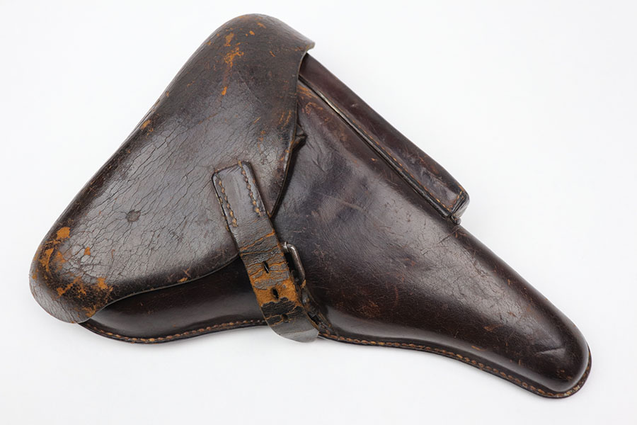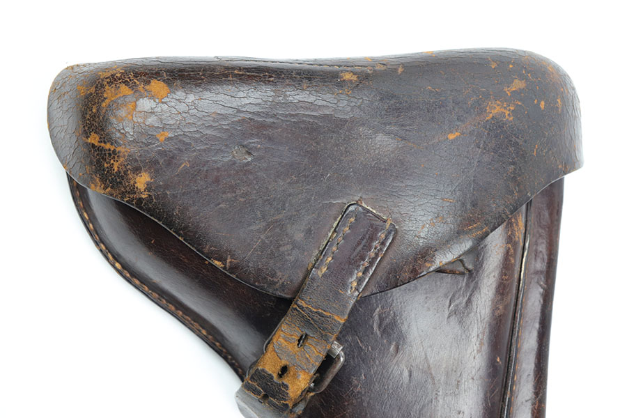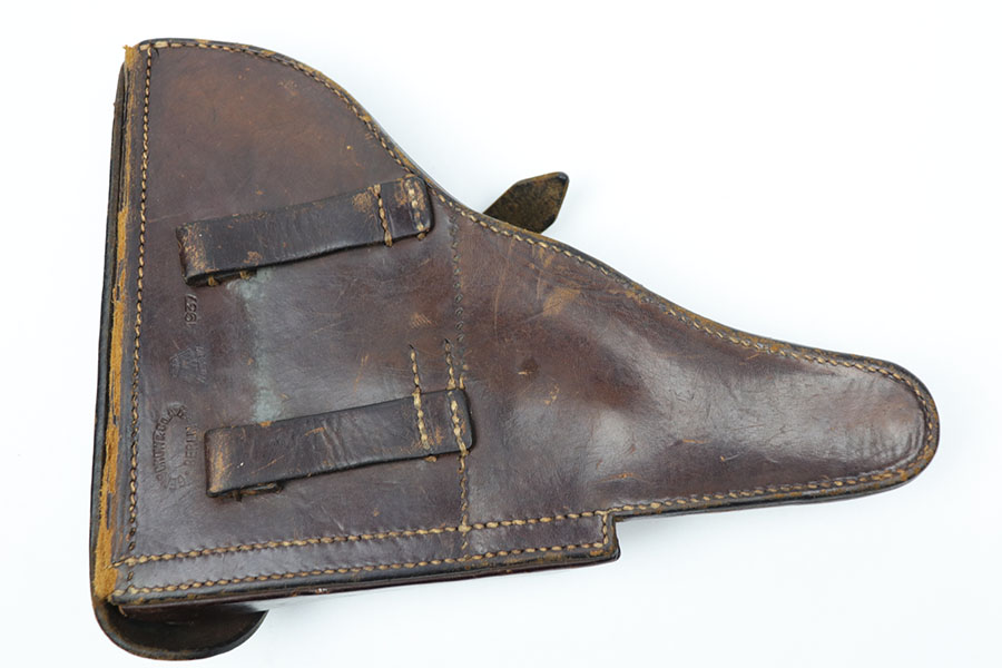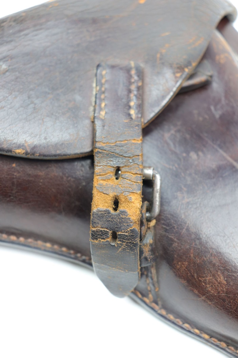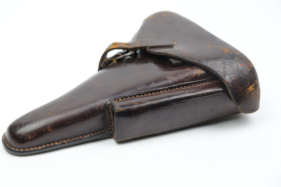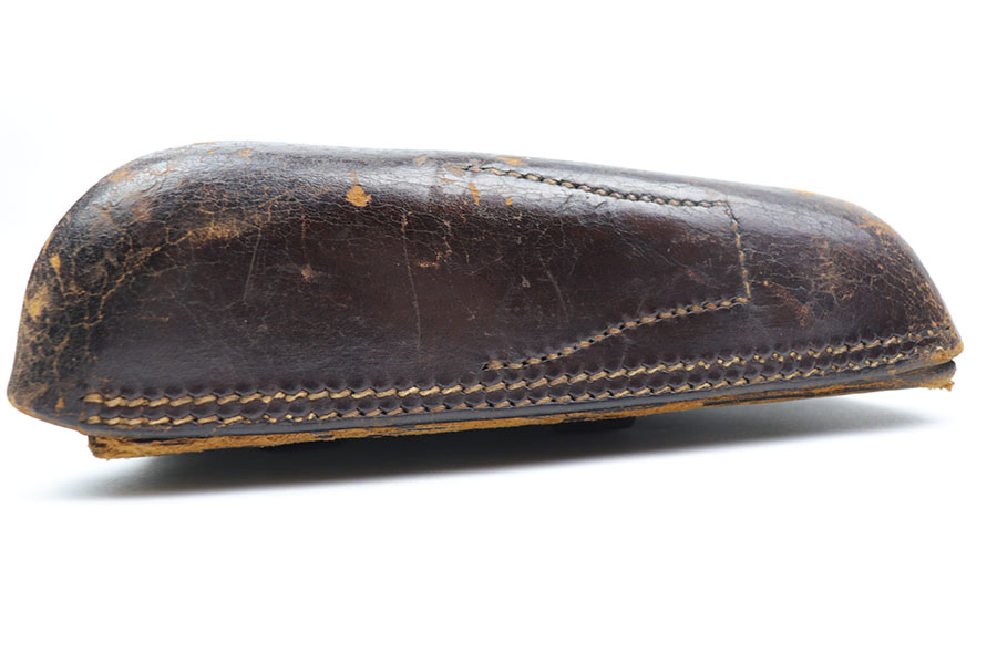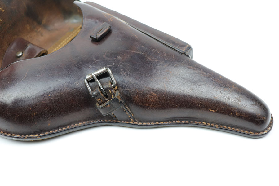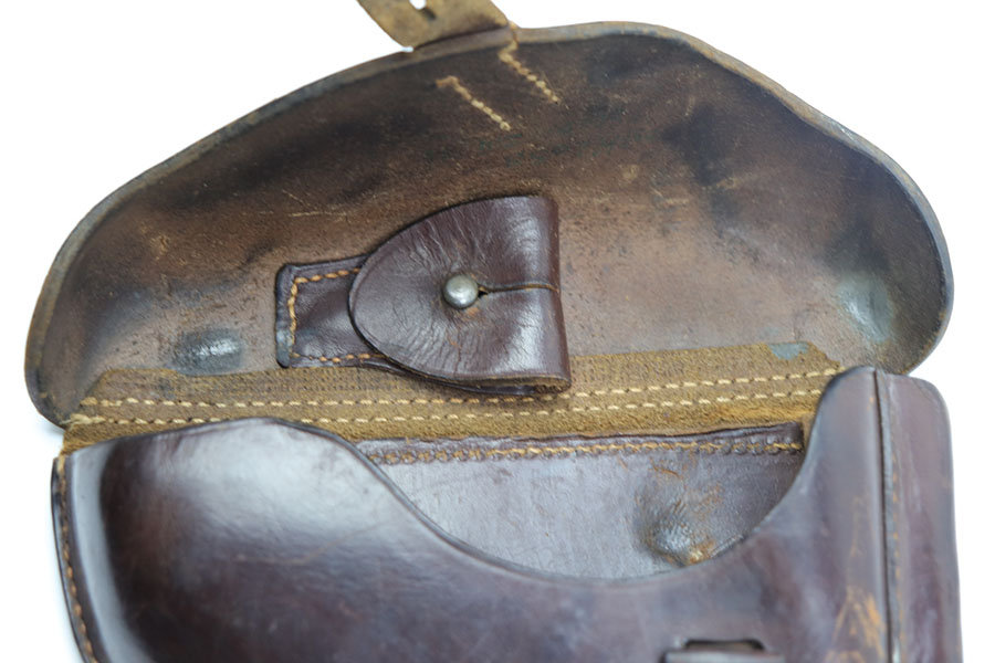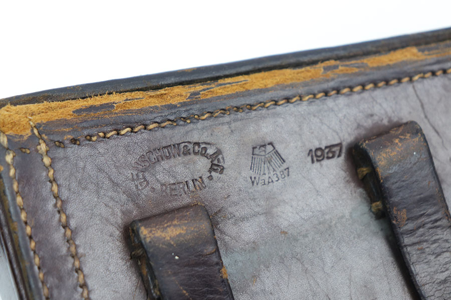 11/2/20 – This is an original 1937 dated Luger holster from WW2. The back leather is maker stamped, dated, and waffen proofed. The brown leather has some surface scuffing and wrinkling on both the closure strap and lid. The closure strap has some surface wear but is completely in tact and the leather is fairly strong (not at risk of falling apart). The interior leather is fairly clean. Some leather weakness around the hinge area on the back leather, but this is not falling apart. Stitching is all original and in tact.