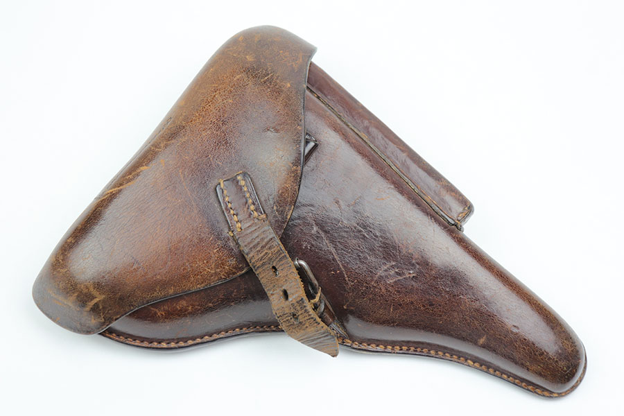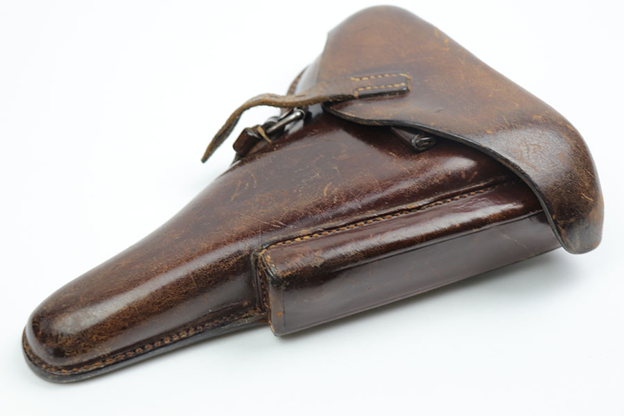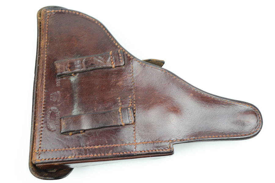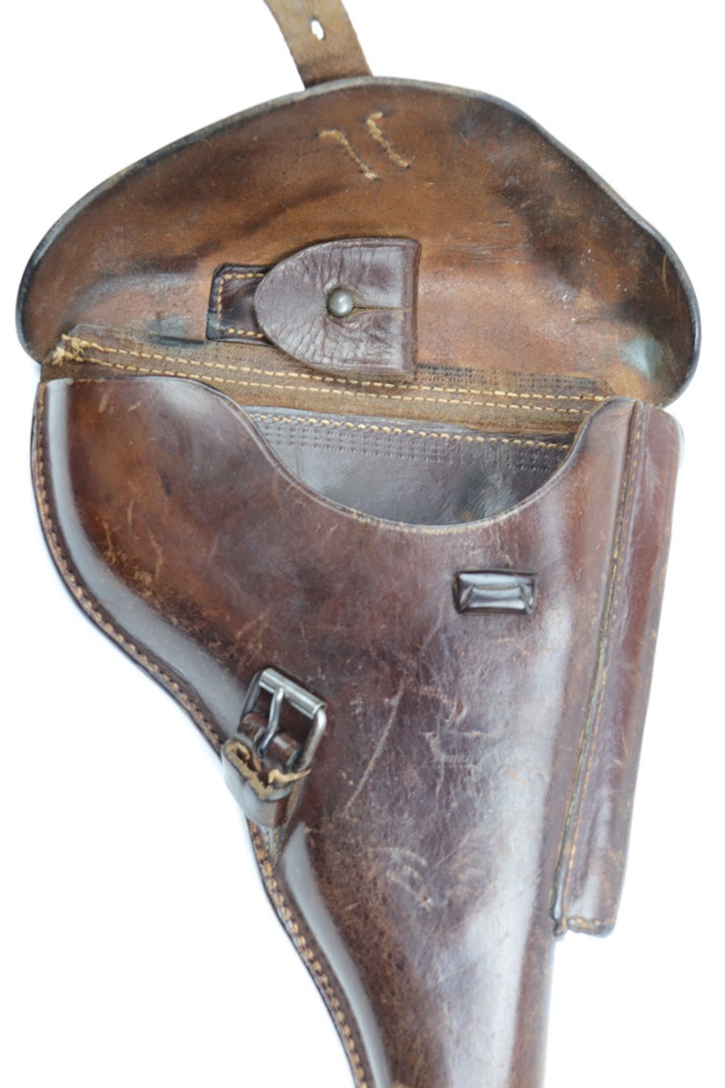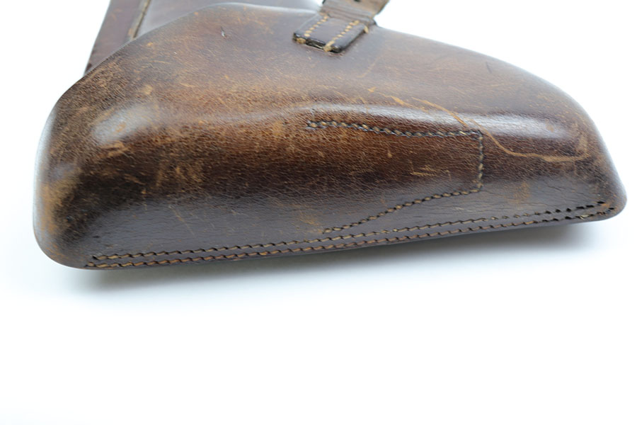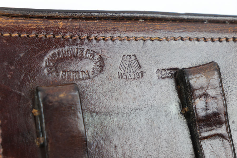 12/30/20 – This is an original 1937 Luger holster. The back of the holster is 1937 dated with a strong maker stamp and droop winged eagle waffen proof stamp. The droop eagle indicates this holster was made in the beginning of 1937 before the proofs changed. The leather is in great condition with some light surface wear but no deep cracks or issues. Typical use wear. The stitching is all tight and original.