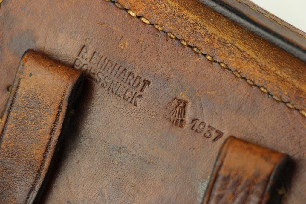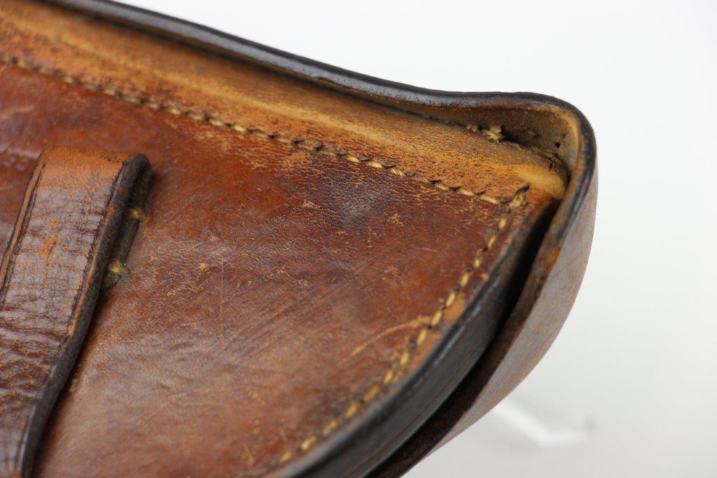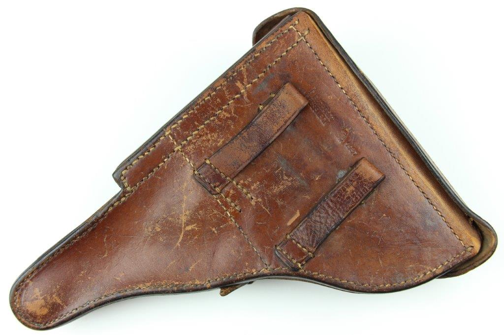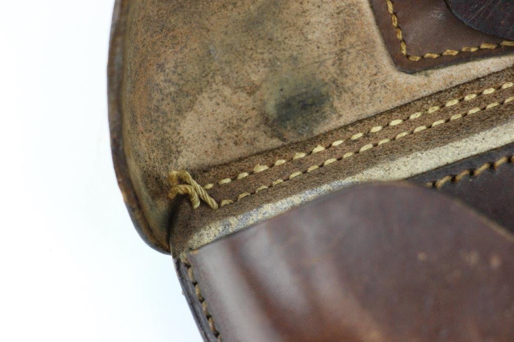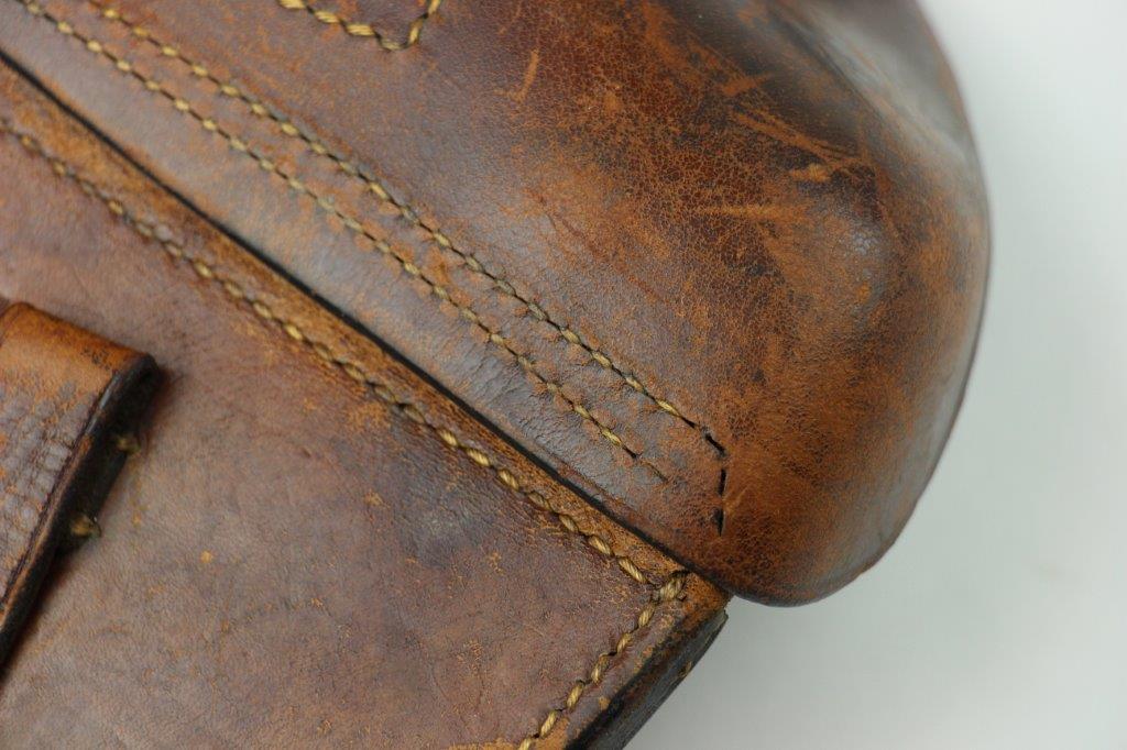 5/20/24 – This is an original 1937 dated Luger holster from WW2. The holster is “transitional” due to the earlier style droop winged eagle proof stamp (this was changed to straight-winged eagle proofs in 1937). The holster exterior has surface scuffs and scratches throughout but this is generally mild and all surface wear. The leather has normal pliability and a fairly clean interior. The stitching is all tight and original throughout. Stamped on the back leather with a maker stamp, date, and waffen proof.