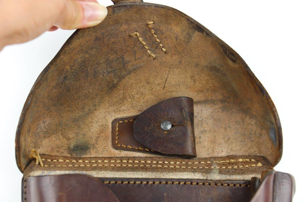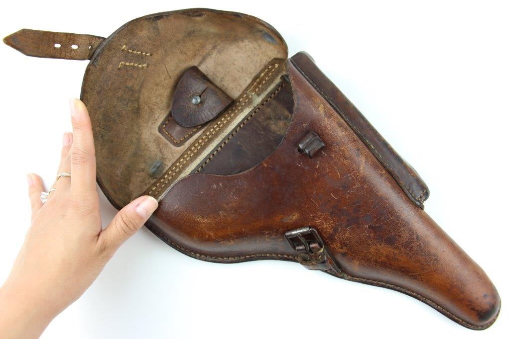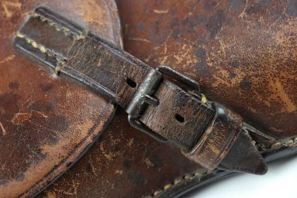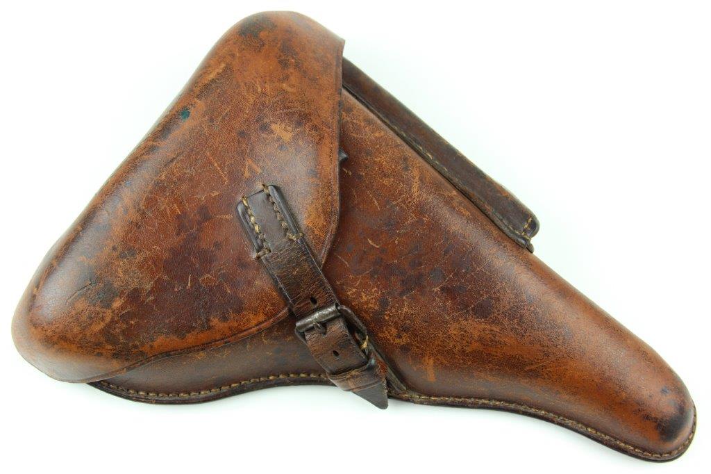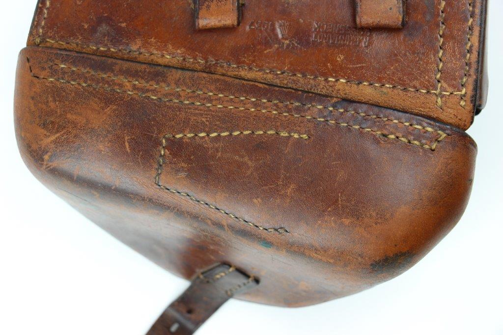 5/20/24 – This is an original 1937 dated Luger holster from WW2. The holster is “transitional” due to the earlier style droop winged eagle proof stamp (this was changed to straight-winged eagle proofs in 1937). The holster exterior has surface scuffs and scratches throughout but this is generally mild and all surface wear. The leather has normal pliability and a fairly clean interior. The stitching is all tight and original throughout. Stamped on the back leather with a maker stamp, date, and waffen proof.