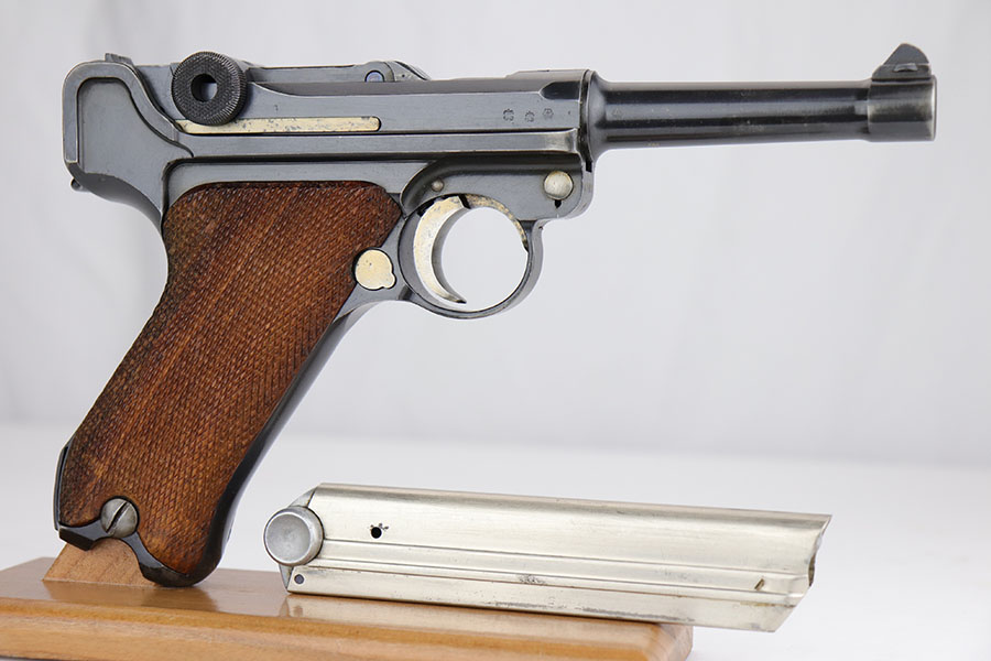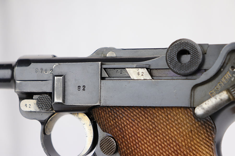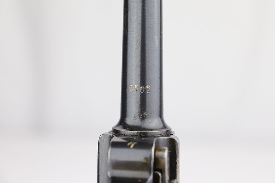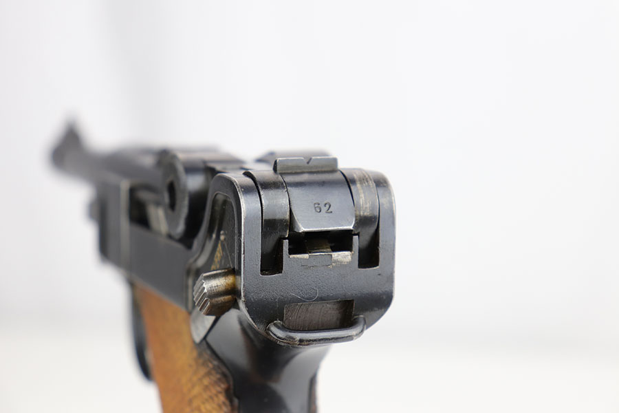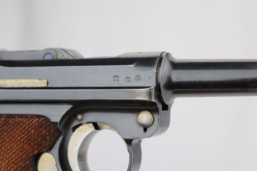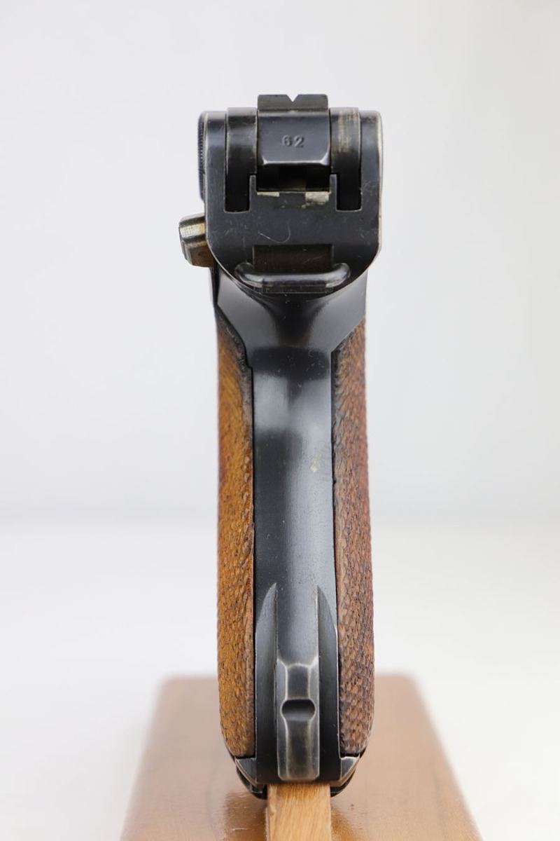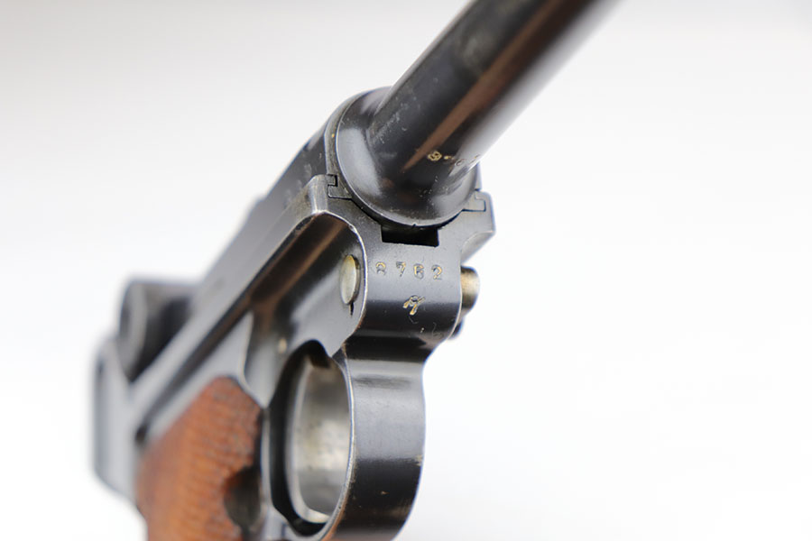 3/26/20 – This is an original Mauser P.08 made in 1937 for use during WW2. The pistol is known as a “1st variation” due to the straw parts, which were all blued later during 1937 production. The straw finish is mostly worn off on this pistol however, yet this is a common flaw. The pistol overall rates at about 94-96% condition. There is some minor patina and finish loss on the straps as well as side plate, edges of the frame, and muzzle. The bore is in great condition as well with strong rifling, but there is some minor patina. All correct and original, including matching numbered grips!