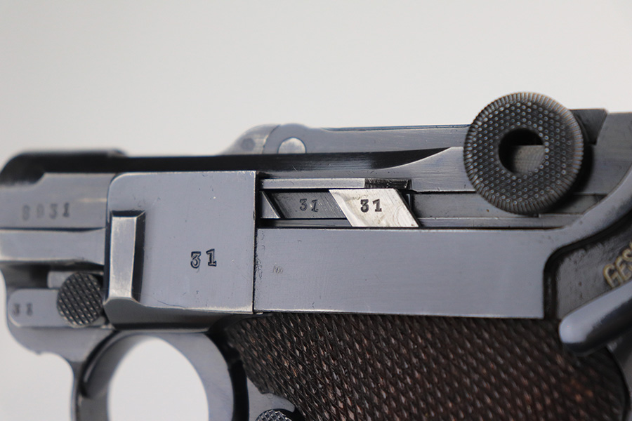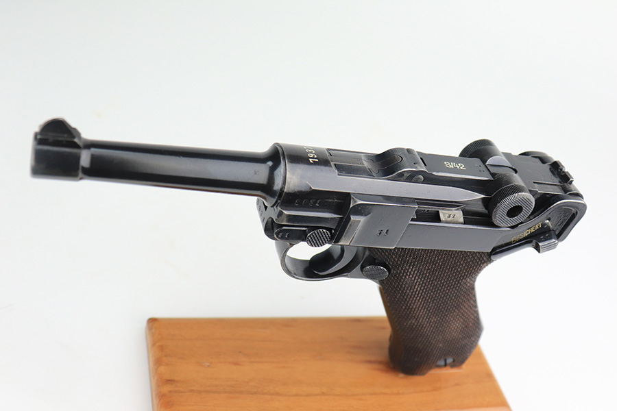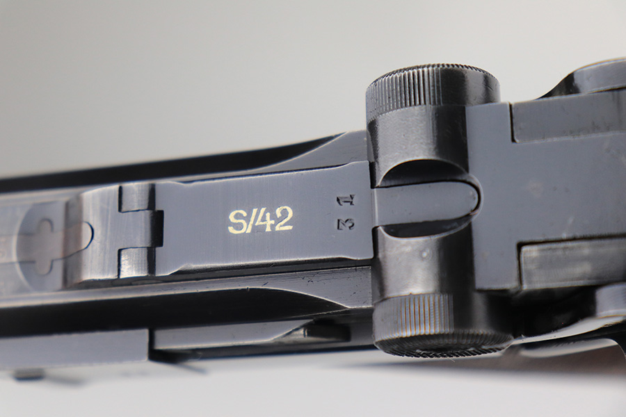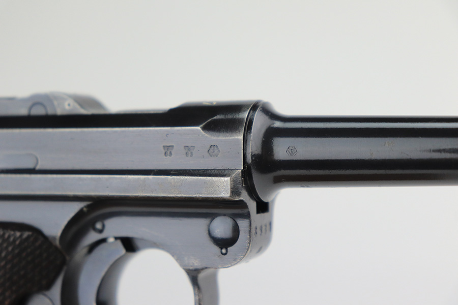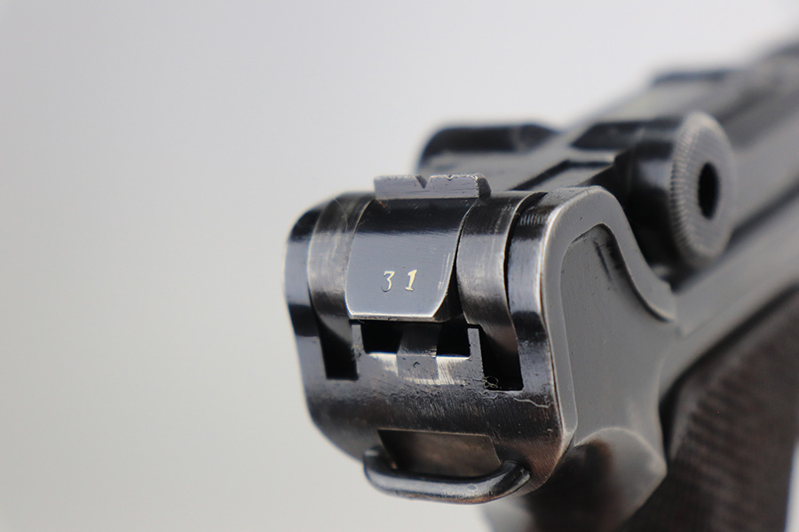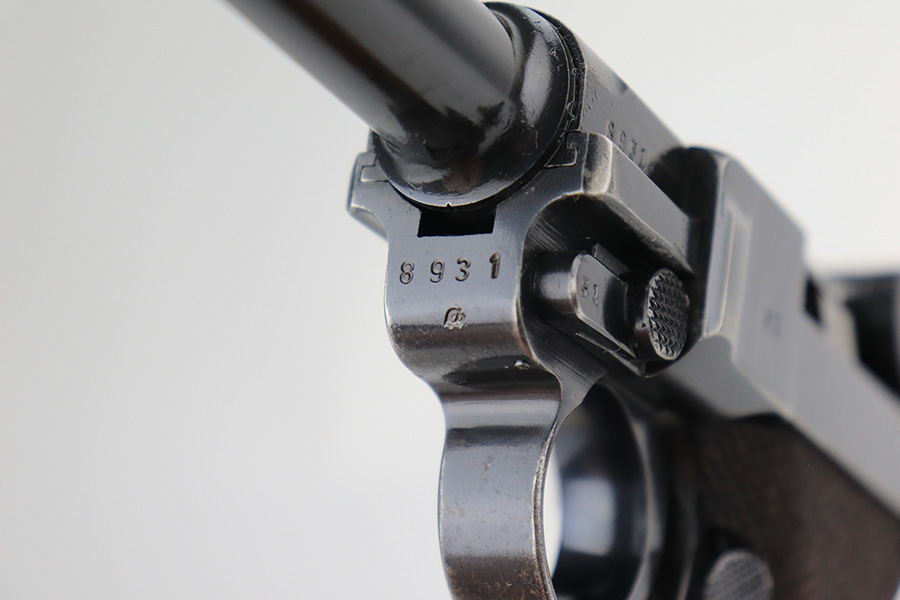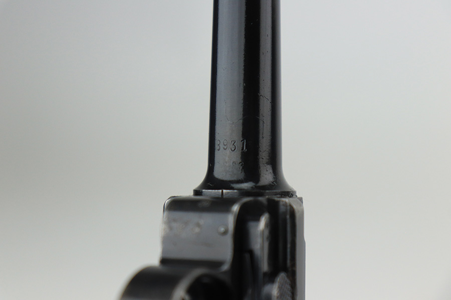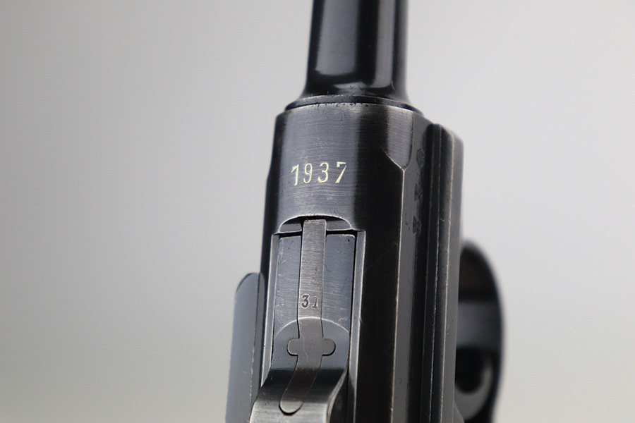 12/10/21 – This is an all matching and original Nazi Mauser Luger from 1937. It’s a second variation example with blued small parts. Matching numbers include the original grips and magazine, though the magazine was re-numbered to match. The blue rates at 85-90% wear on the muzzle and right side rail, as well as some thinning on the straps. The grips are in good shape but the right panel does have a couple dings in it, and also has a small crack internally that does not go all the way through and doesn’t show externally. The bore has pronounced rifling but some frost and freckling throughout.