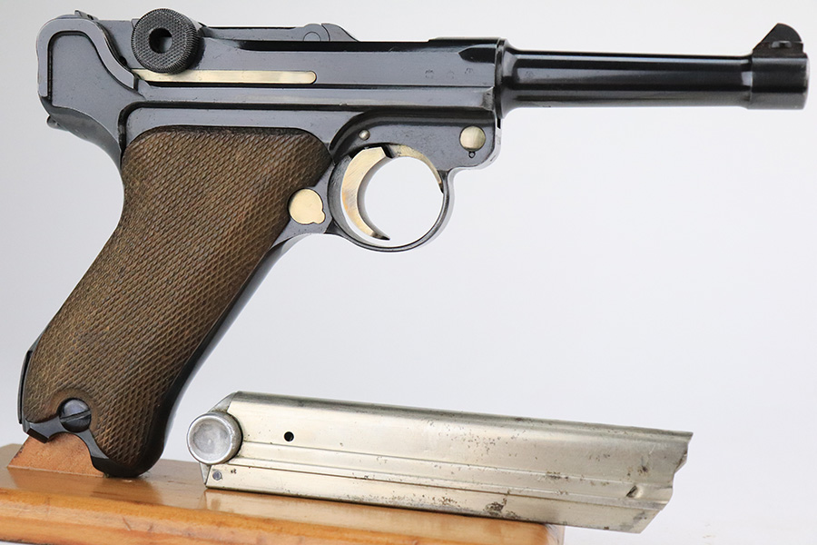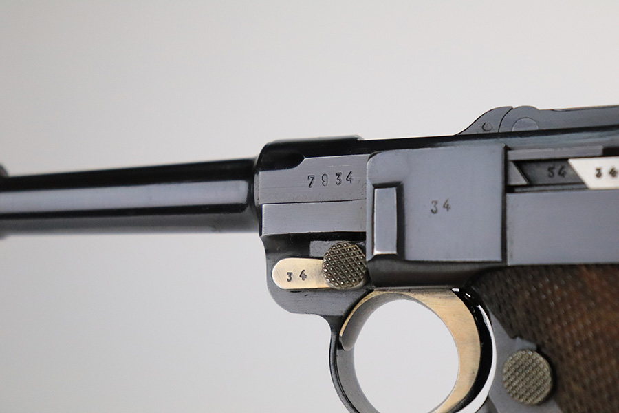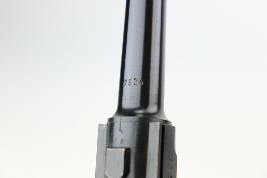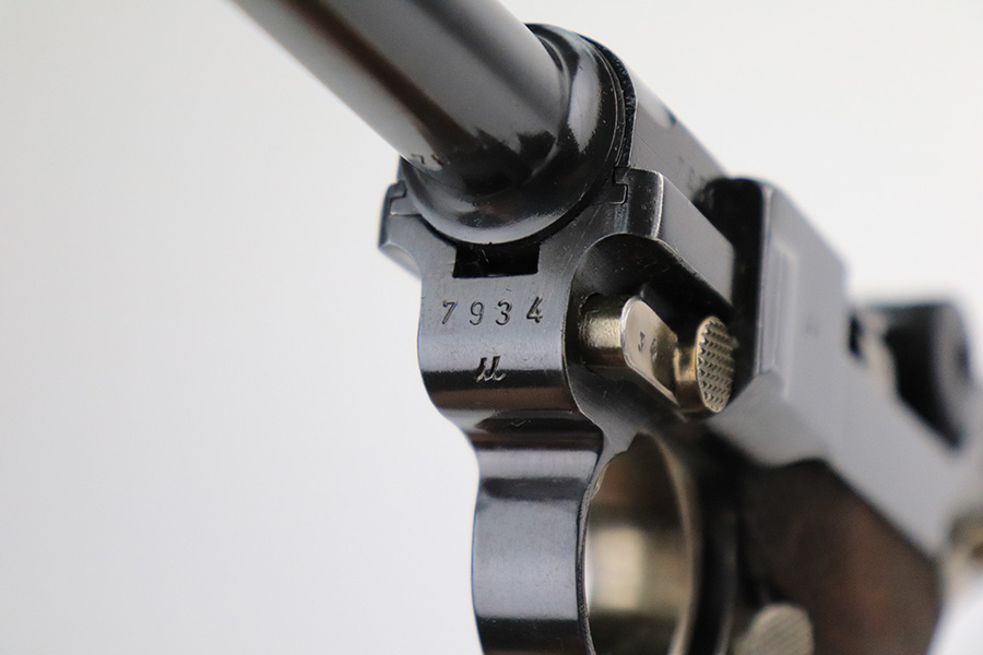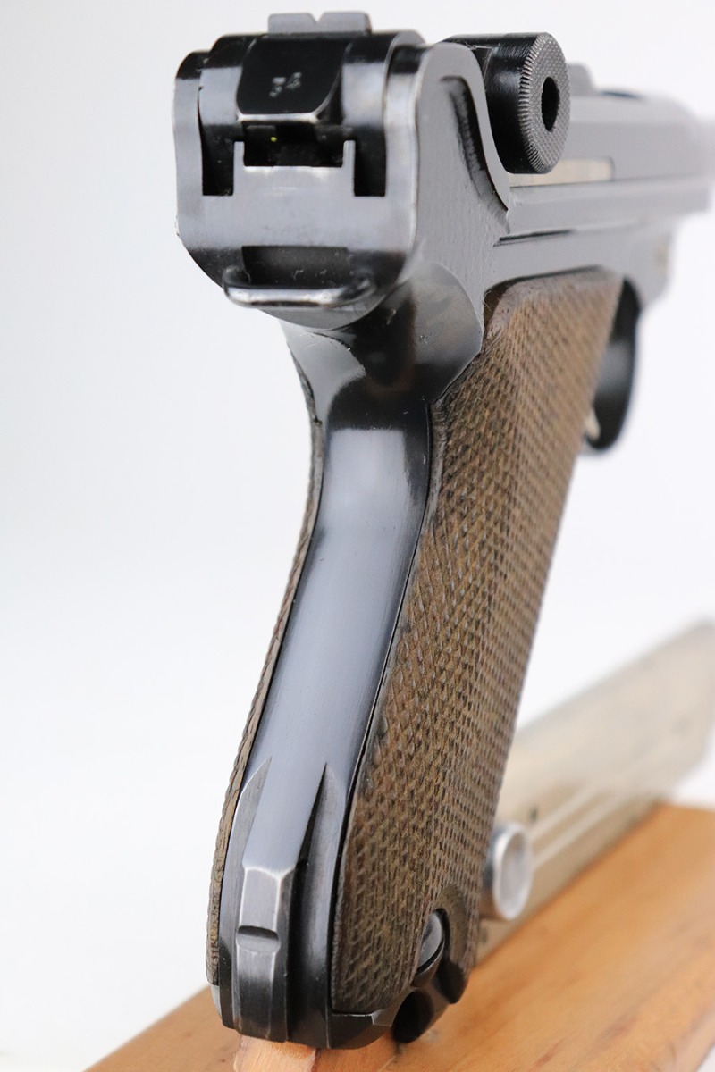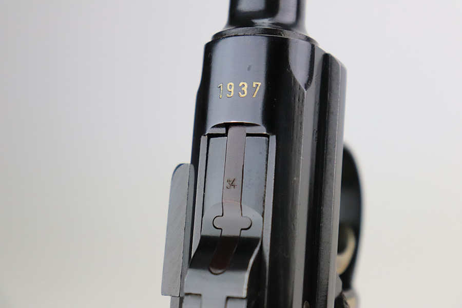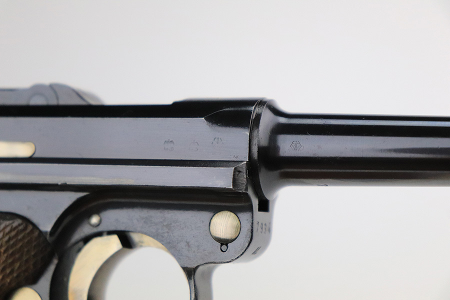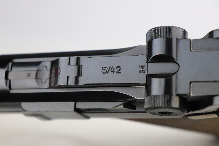 7/13/22 – This is an excellent example of Mauser Luger issued to the Nazi military in 1937. It is all matching, has the proper “S/42” Mauser factory code on the toggle, and has the proper “Eagle 63” military acceptance proofs. The entire gun has been professionally restored and re-blued, so the gun has a really nice overall fit and finish. Almost no distinguishable finish loss. Excellent straw coloring on the small parts. Comes with matching-numbered wood grips and a matching magazine, although the magazine was force-matched. The bore has strong rifling with some frosting in the grooves.