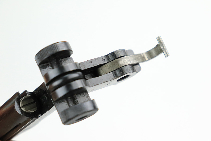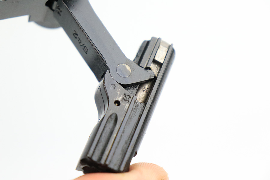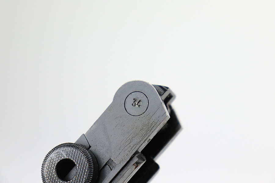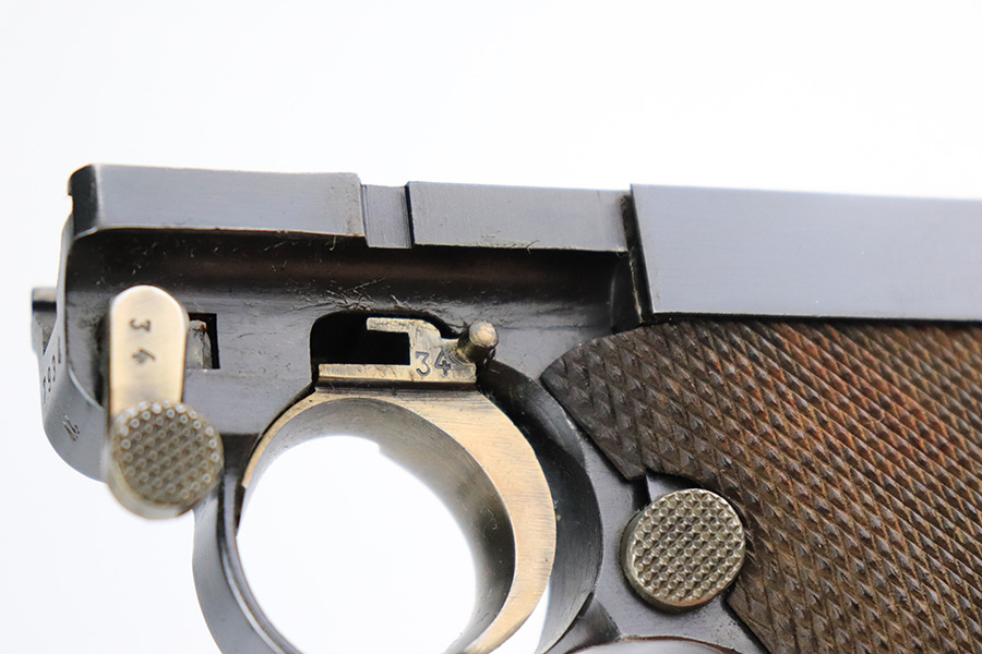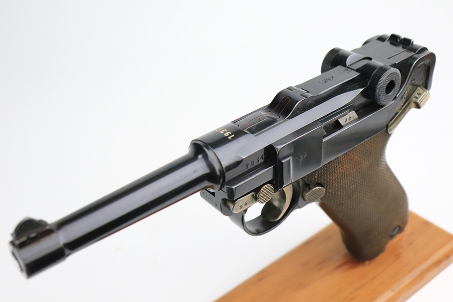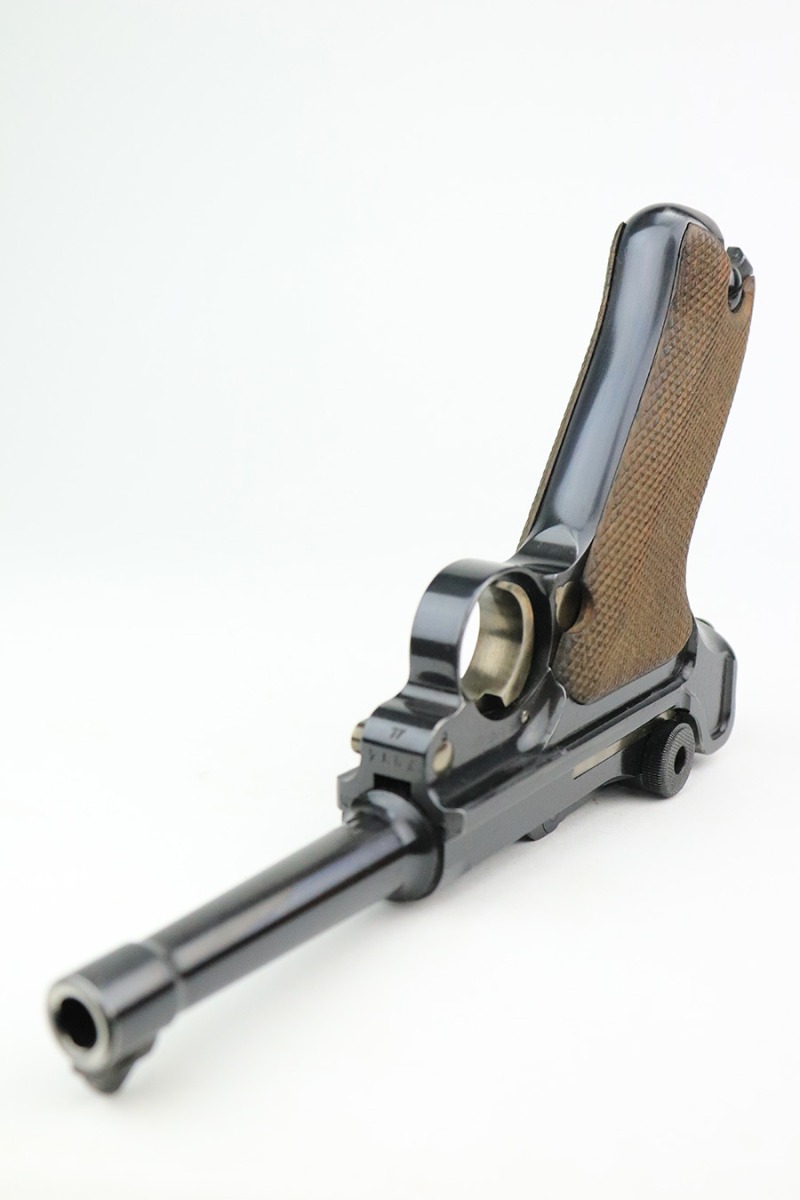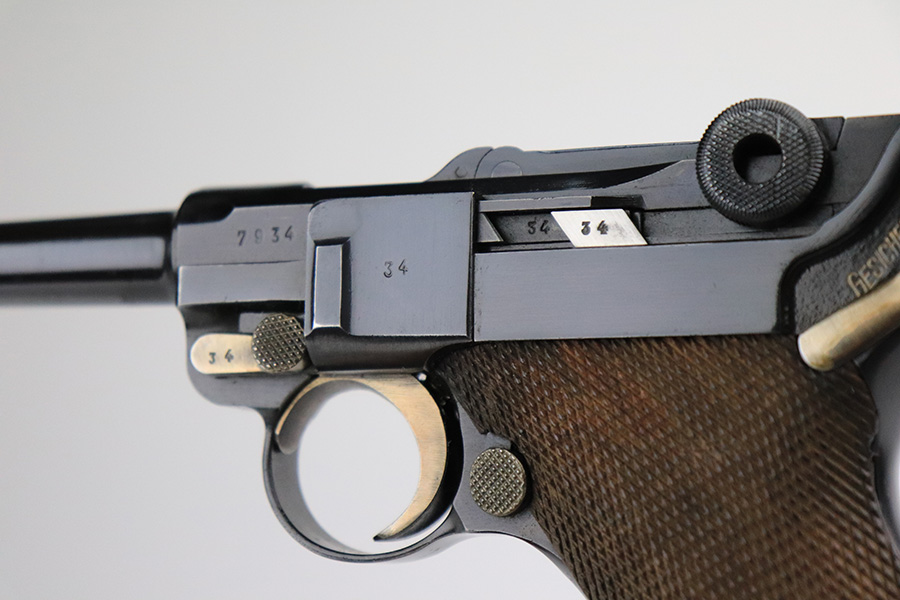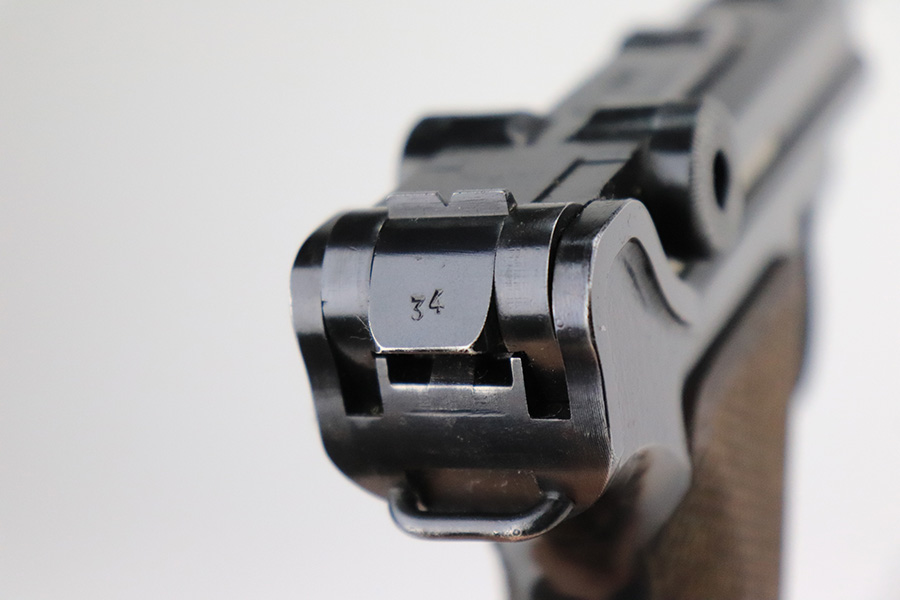 7/13/22 – This is an excellent example of Mauser Luger issued to the Nazi military in 1937. It is all matching, has the proper “S/42” Mauser factory code on the toggle, and has the proper “Eagle 63” military acceptance proofs. The entire gun has been professionally restored and re-blued, so the gun has a really nice overall fit and finish. Almost no distinguishable finish loss. Excellent straw coloring on the small parts. Comes with matching-numbered wood grips and a matching magazine, although the magazine was force-matched. The bore has strong rifling with some frosting in the grooves.