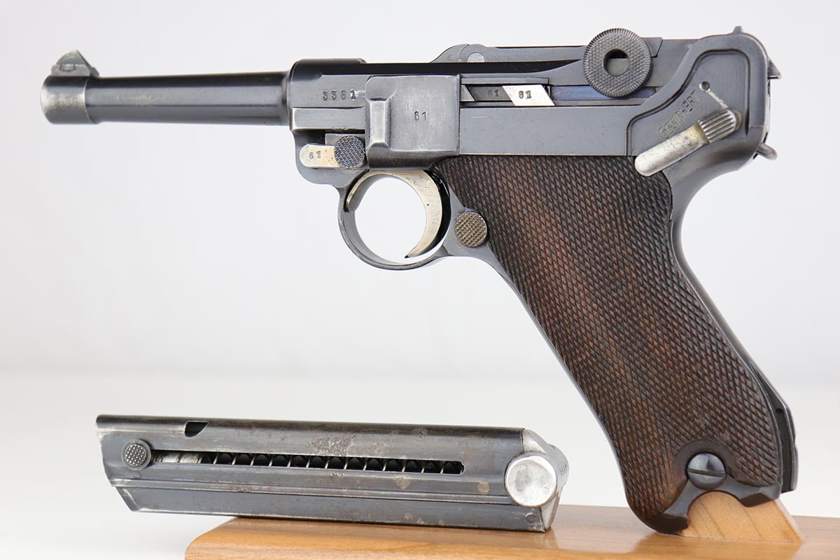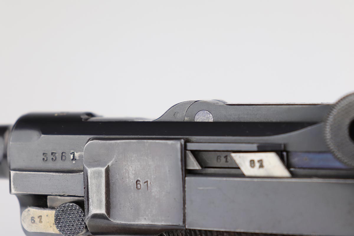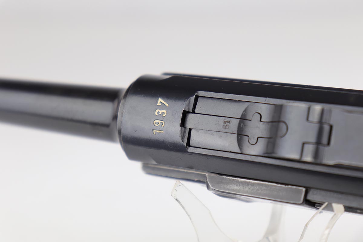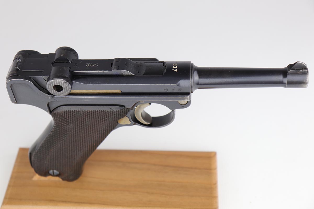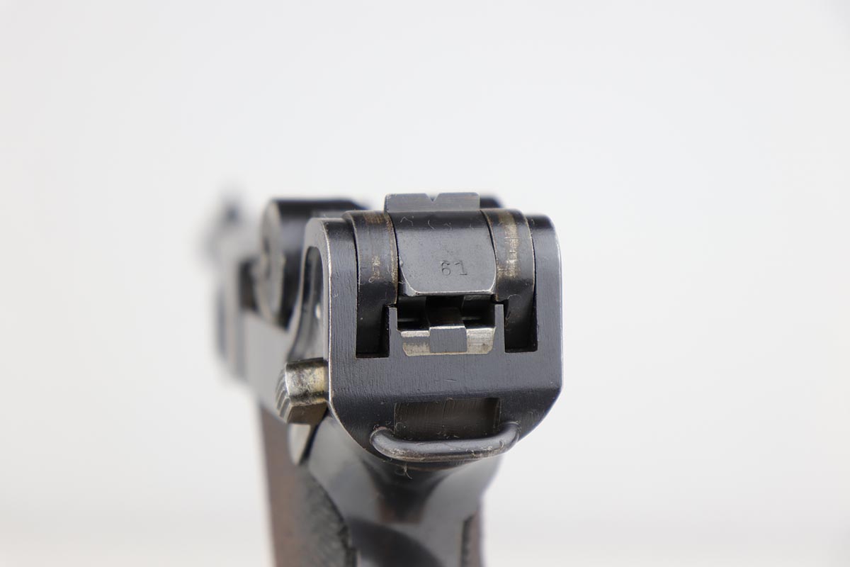 5/31/19 – This is an all matching and original Mauser Luger from 1937. It is a first variation example with strawed small parts. The original blue rates at 93-94% with the majority of finish loss on the straps. The sideplate has been numbered to match and then refinished. Price has been lowered in consideration of this issue. The sideplate bluing color is just slightly darker than the rest of the gun. Small parts retain about 70% original straw. Original, matching numbered grips show some age and handling wear but no major cracks or chips. Period correct but mismatched magazine. Bore has decent rifling but some minor frosting throughout.