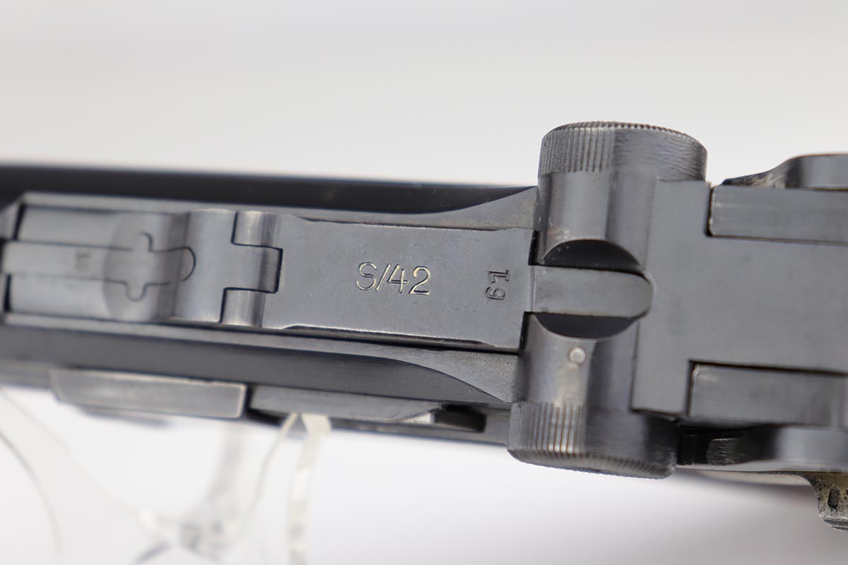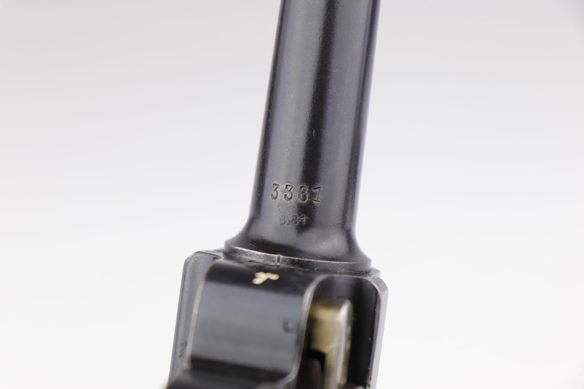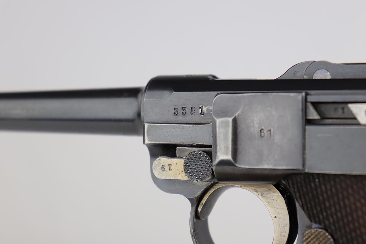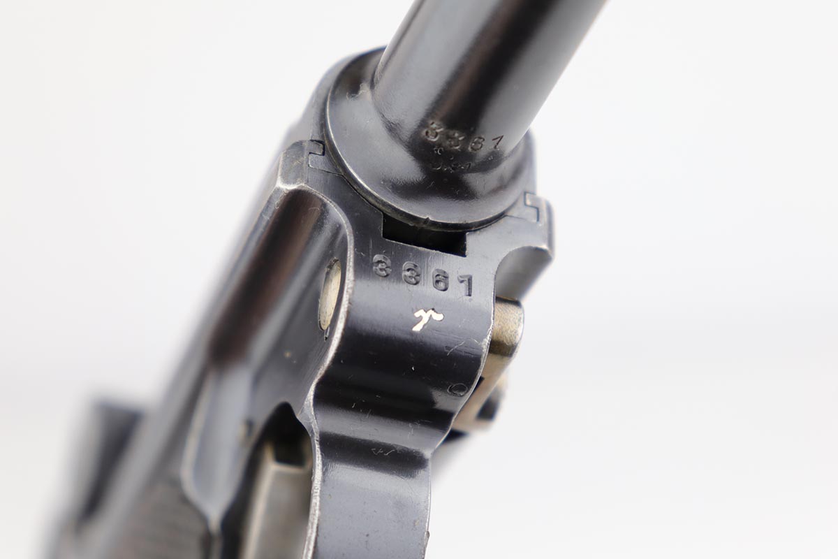 5/31/19 – This is an all matching and original Mauser Luger from 1937. It is a first variation example with strawed small parts. The original blue rates at 93-94% with the majority of finish loss on the straps. The sideplate has been numbered to match and then refinished. Price has been lowered in consideration of this issue. The sideplate bluing color is just slightly darker than the rest of the gun. Small parts retain about 70% original straw. Original, matching numbered grips show some age and handling wear but no major cracks or chips. Period correct but mismatched magazine. Bore has decent rifling but some minor frosting throughout.