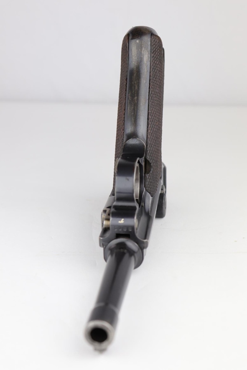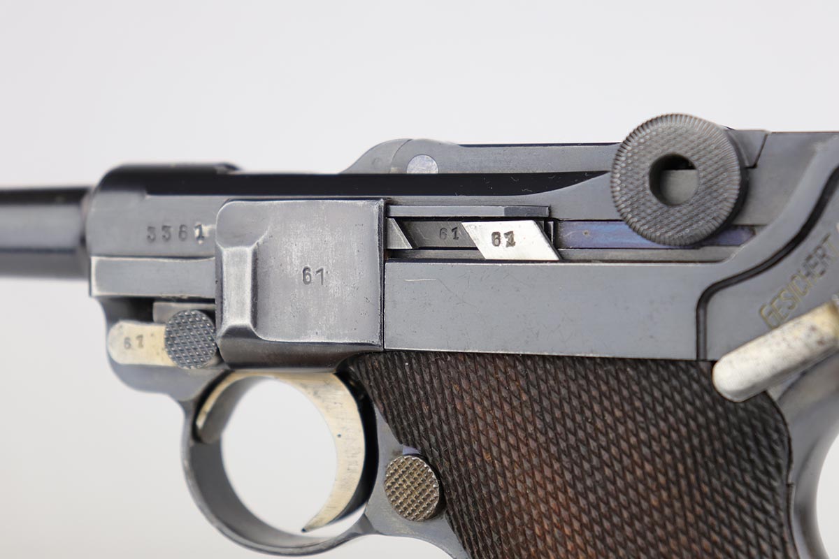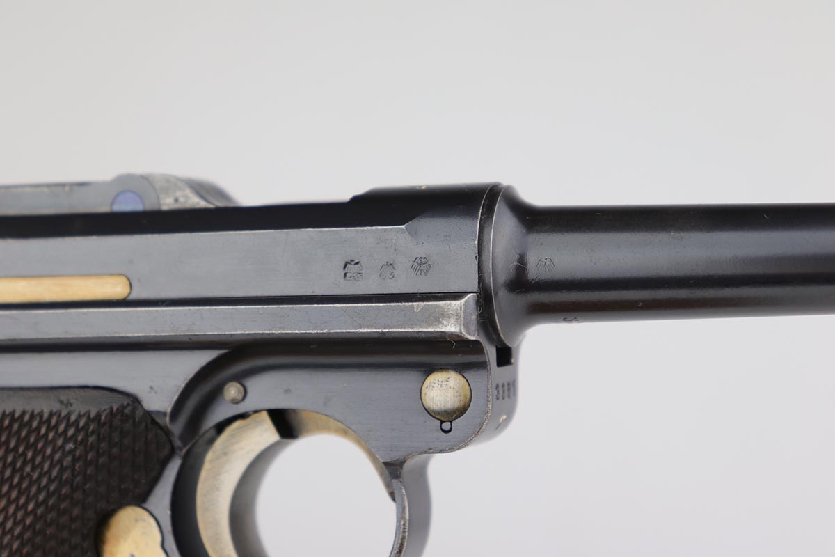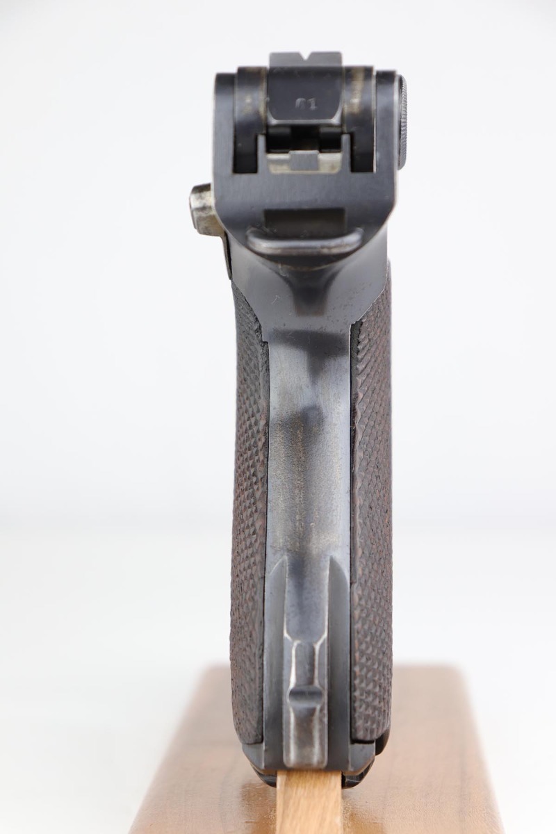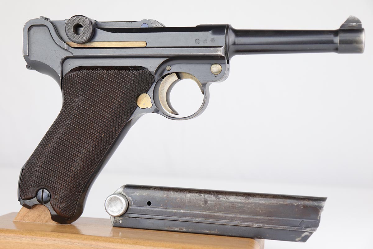 5/31/19 – This is an all matching and original Mauser Luger from 1937. It is a first variation example with strawed small parts. The original blue rates at 93-94% with the majority of finish loss on the straps. The sideplate has been numbered to match and then refinished. Price has been lowered in consideration of this issue. The sideplate bluing color is just slightly darker than the rest of the gun. Small parts retain about 70% original straw. Original, matching numbered grips show some age and handling wear but no major cracks or chips. Period correct but mismatched magazine. Bore has decent rifling but some minor frosting throughout.