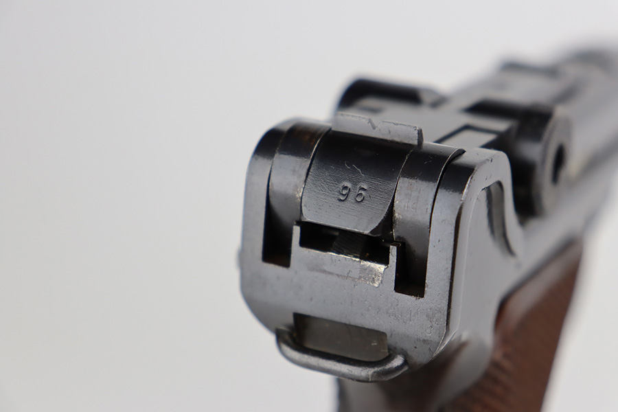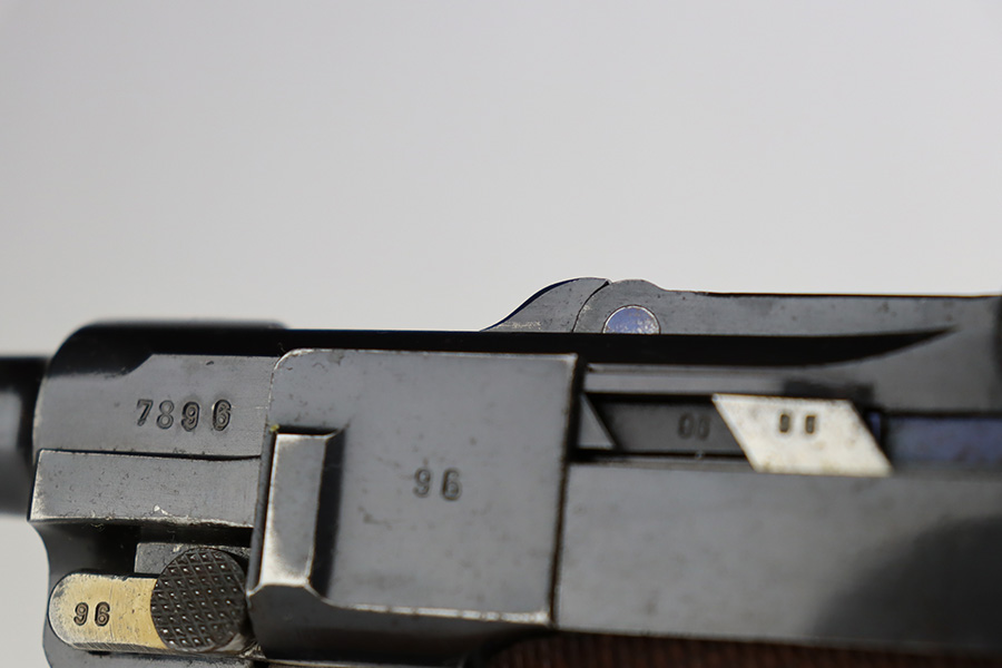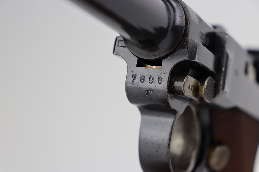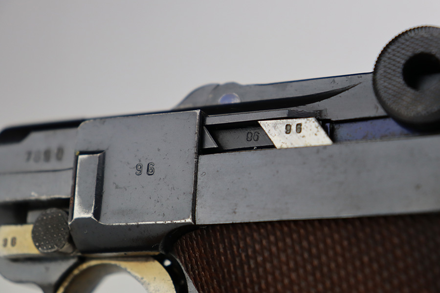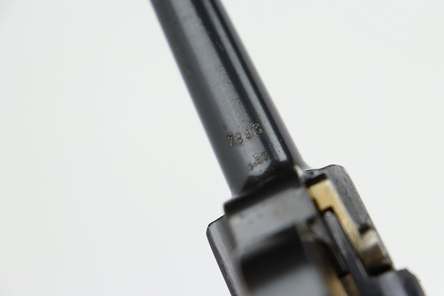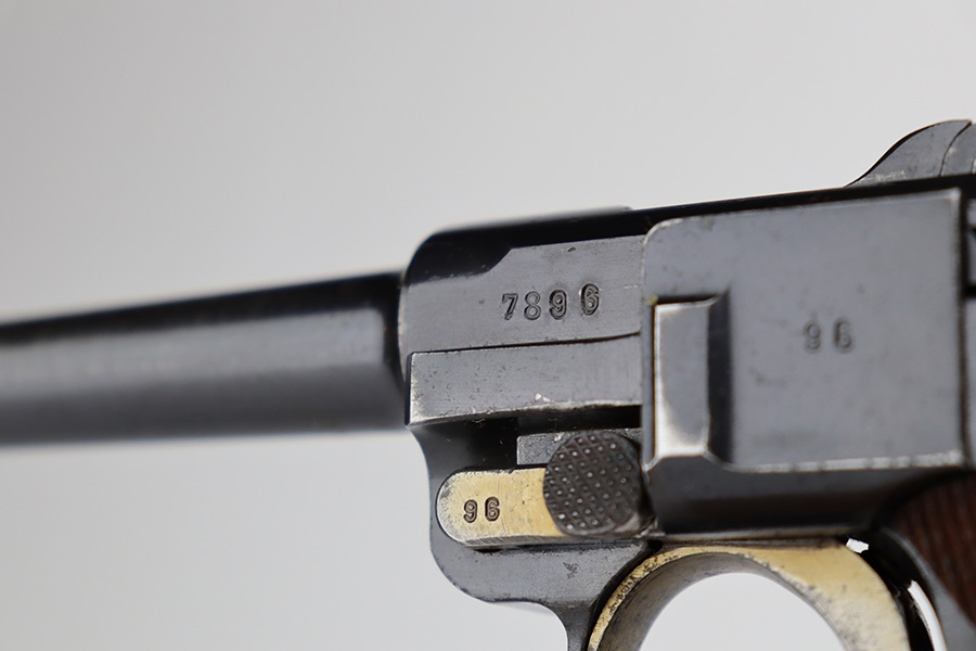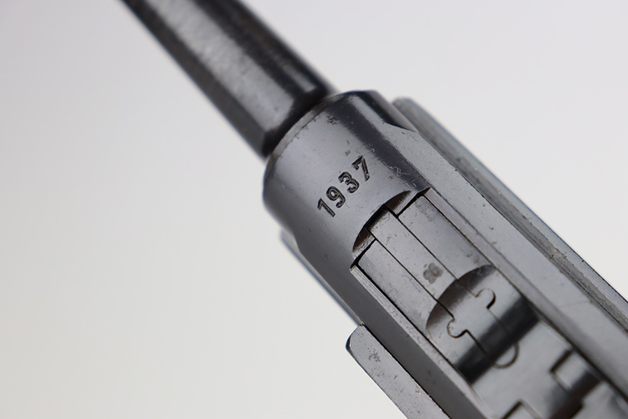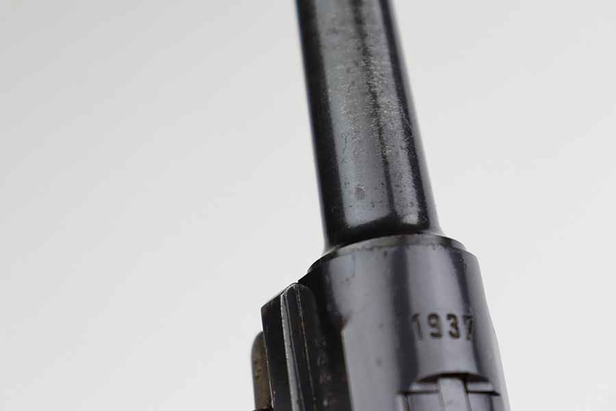 7/25/23 – This is an all matching and original first variation Mauser Luger from 1937. Matching numbered parts include the original magazine and grips. The bluing is excellent overall but most of the wear is along/around the barrel. There’s also some finish loss on the muzzle and sideplate. Minty bore and grips. The small parts have the original straw but there’s some thinning/patina on them, especially the safety and trigger.
