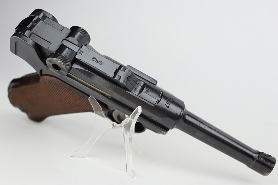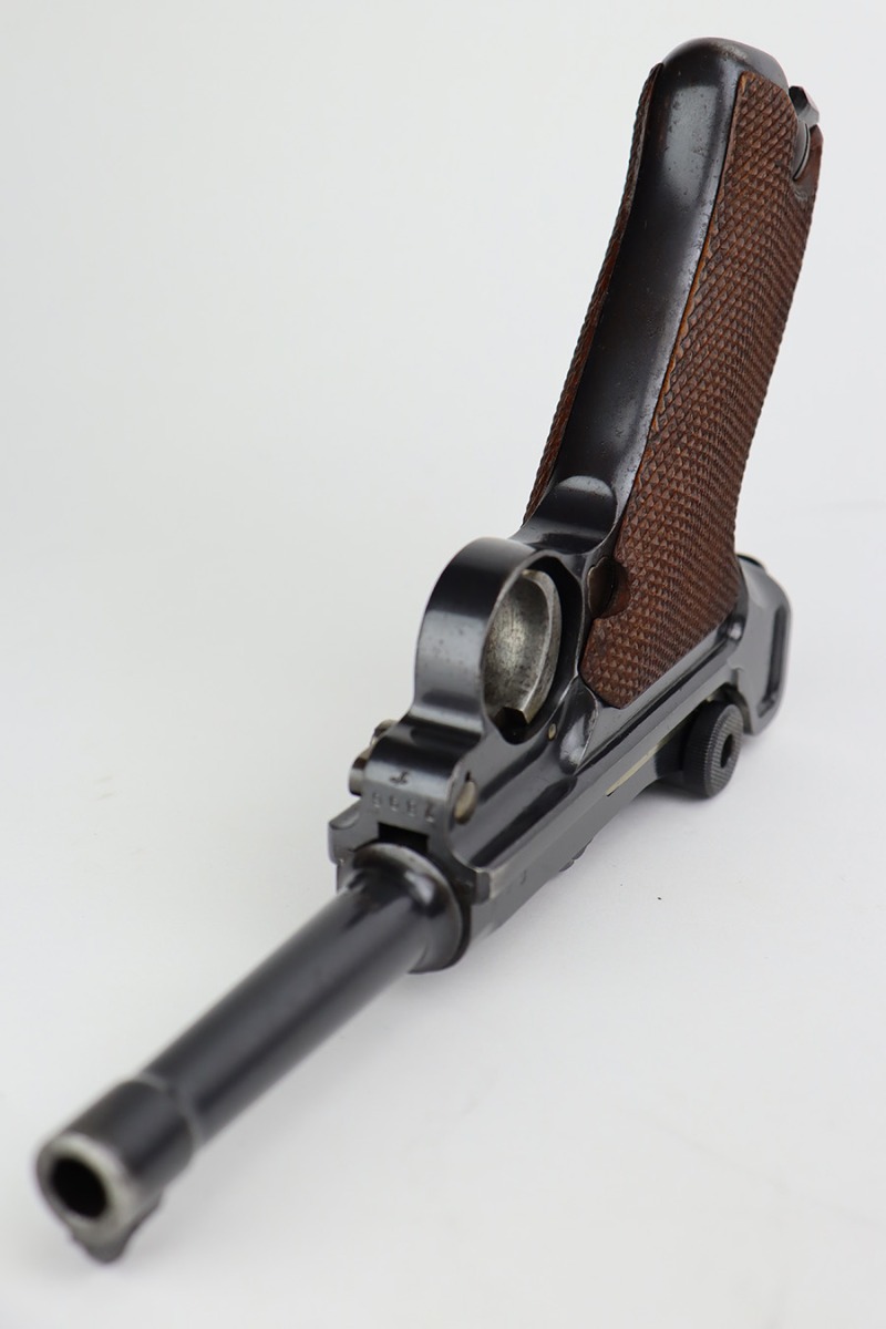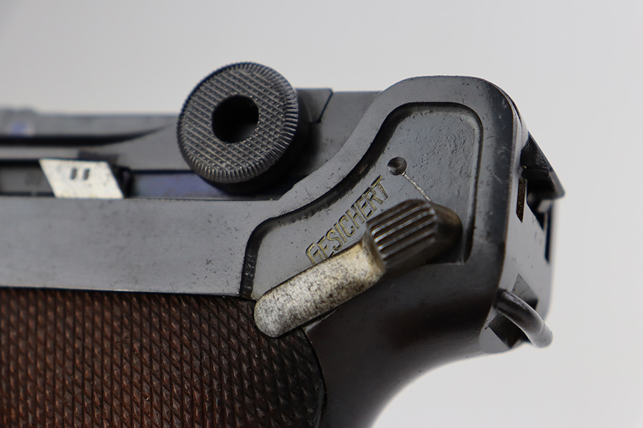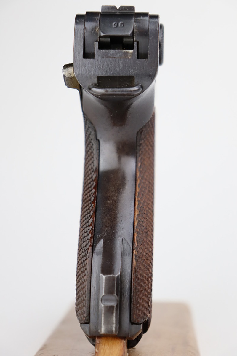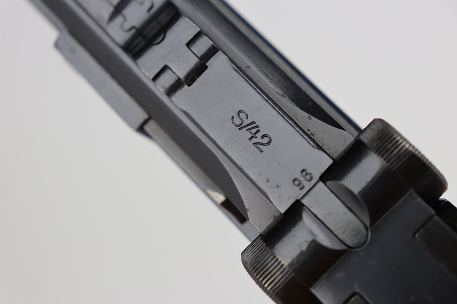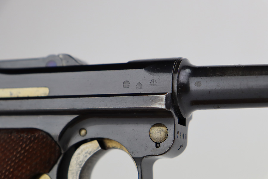 7/25/23 – This is an all matching and original first variation Mauser Luger from 1937. Matching numbered parts include the original magazine and grips. The bluing is excellent overall but most of the wear is along/around the barrel. There’s also some finish loss on the muzzle and sideplate. Minty bore and grips. The small parts have the original straw but there’s some thinning/patina on them, especially the safety and trigger.