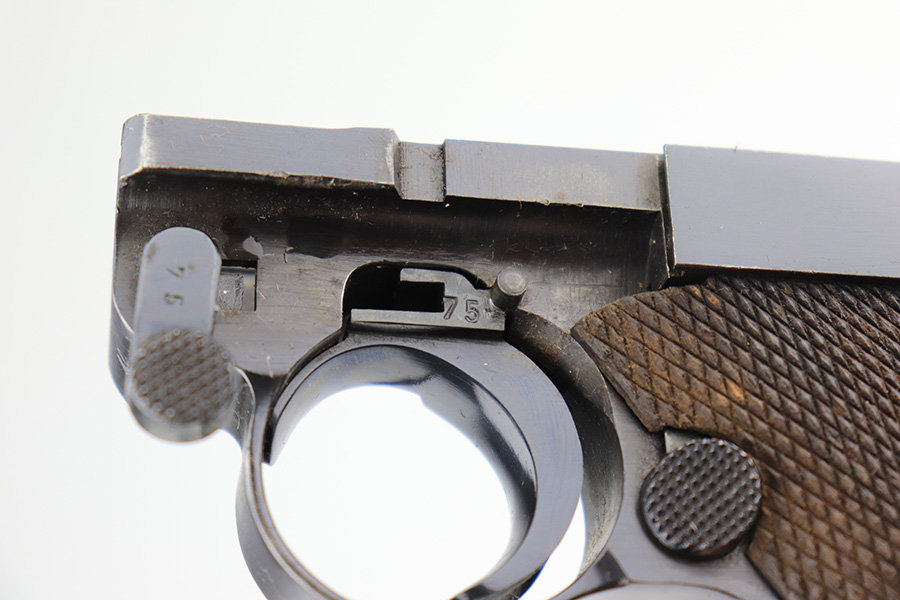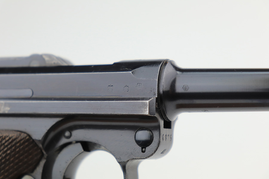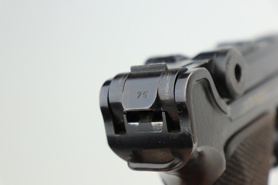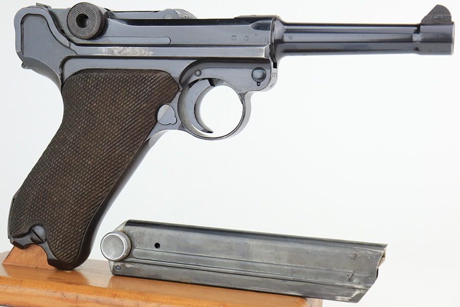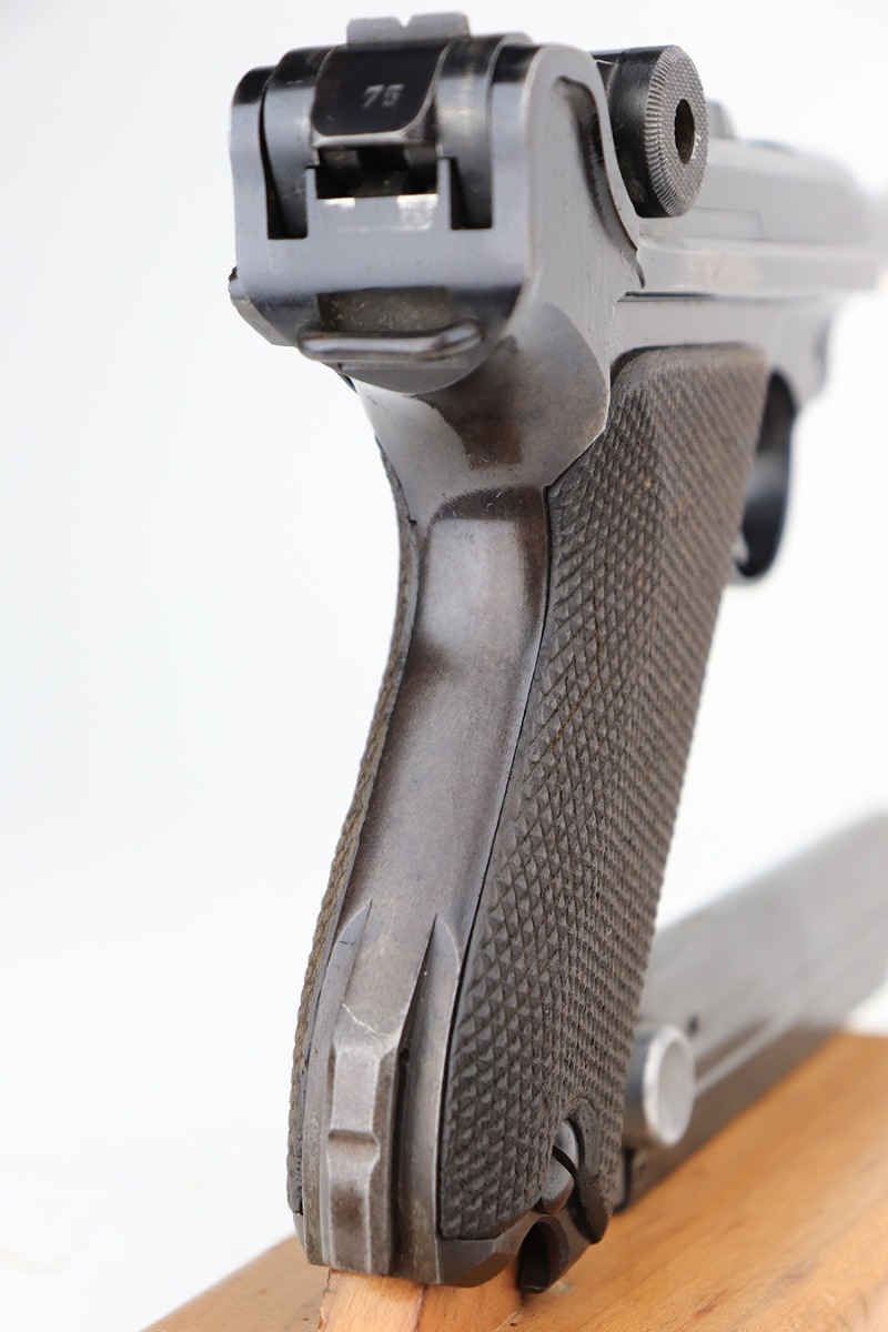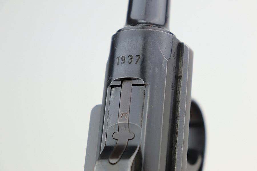 4/18/22 – This is a nice, honest example of a Mauser Luger from 1937 with the original, matching magazine and grips. The bluing rates at about 93-95% with minor bluing loss on the sideplate, muzzle and right side rail. There’s also a small area of wear on the bottom of the front strap, and minor patina on the straps in general. Excellent grips with sharp checkering and no cracks. Strong, shiny bore. Magazine is factory numbered and matching to the pistol, as are the grips. All matching except for an un-numbered rear toggle pin.