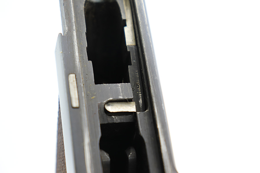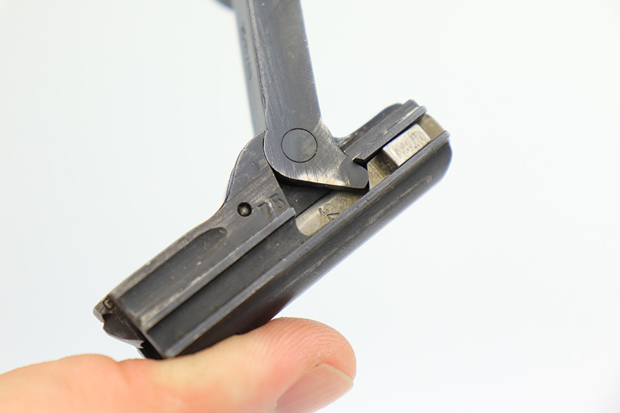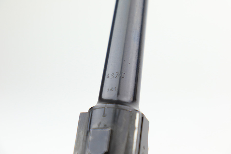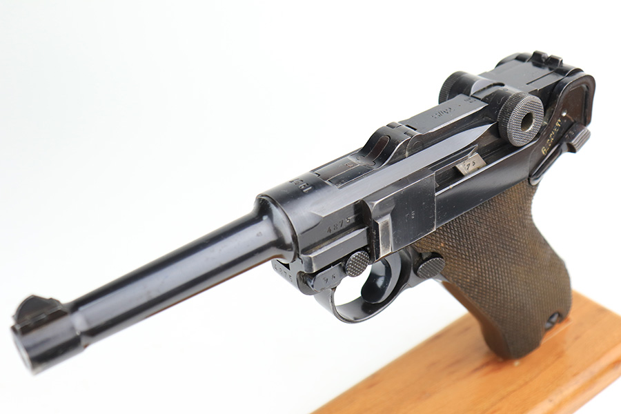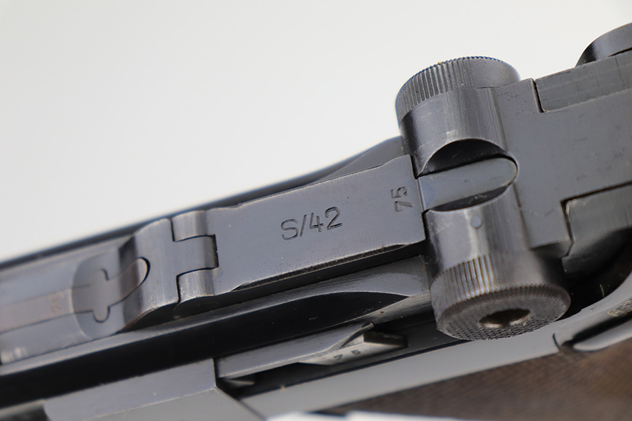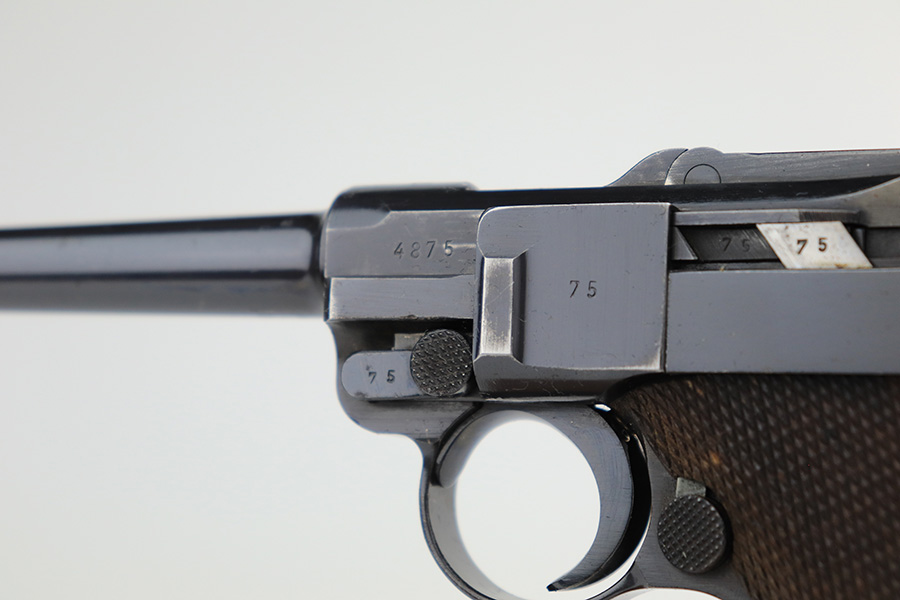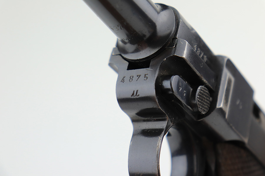 4/18/22 – This is a nice, honest example of a Mauser Luger from 1937 with the original, matching magazine and grips. The bluing rates at about 93-95% with minor bluing loss on the sideplate, muzzle and right side rail. There’s also a small area of wear on the bottom of the front strap, and minor patina on the straps in general. Excellent grips with sharp checkering and no cracks. Strong, shiny bore. Magazine is factory numbered and matching to the pistol, as are the grips. All matching except for an un-numbered rear toggle pin.