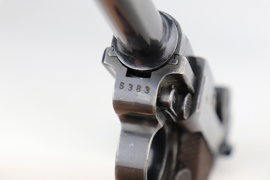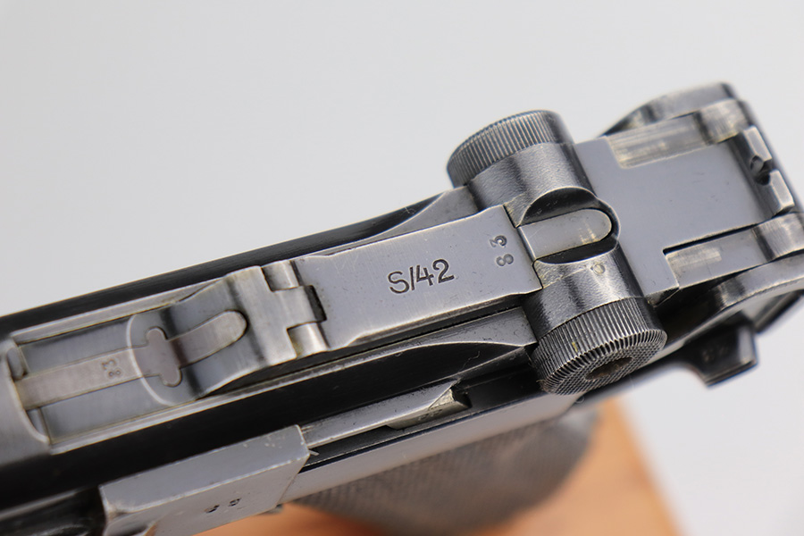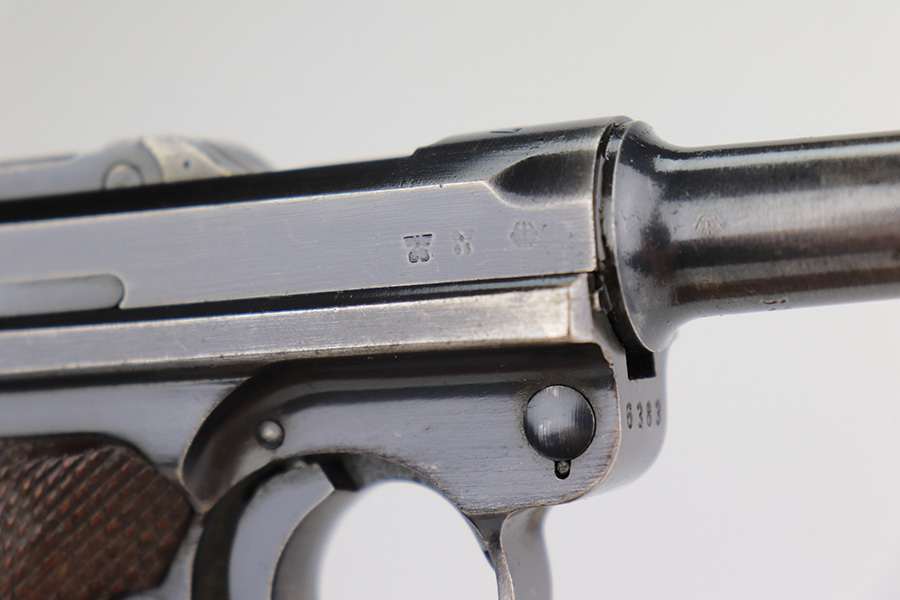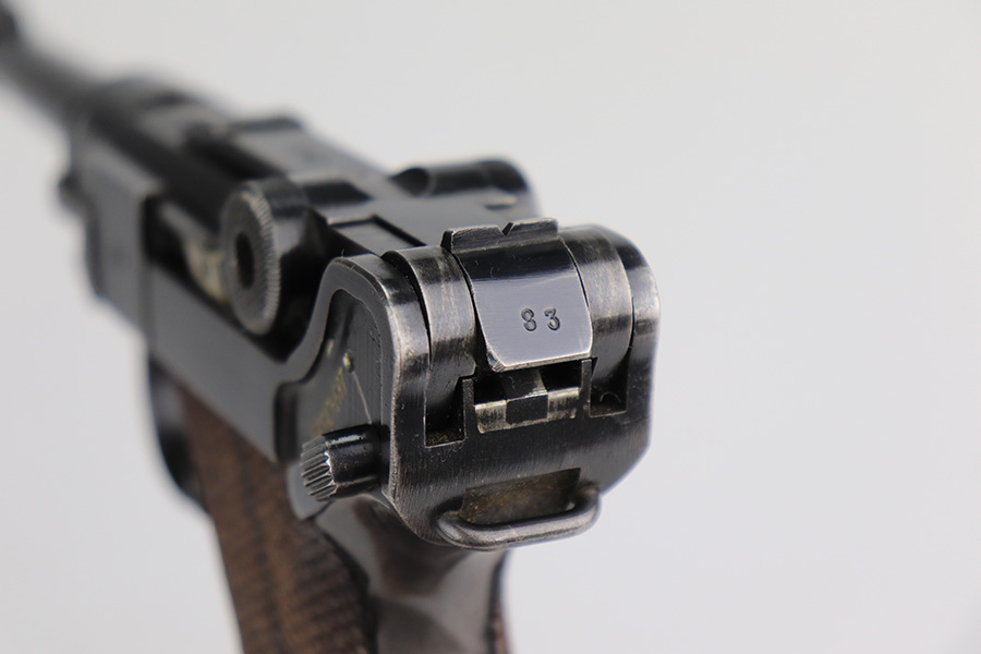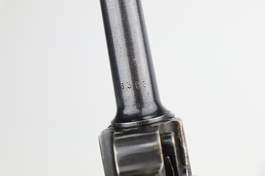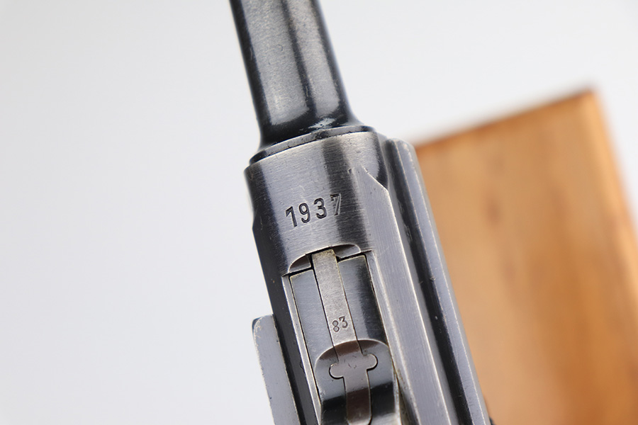 1/11/23 – This is a nice example of a Mauser Luger issued to the Nazi military in 1937. It is all matching and has the proper “Eagle 63” military acceptance proofs. This one is transitional, because it has blued small parts – 1937 is the year they transitioned from strawed to blued small parts. It also comes with one original matching-numbered magazine. The gun itself has retained roughly 85% of its original finish. The majority of the finish loss is on the grip straps and along the barrel. But there is also wear on the side plate, on the side rails, and around the muzzle. Fitted with a nice set of wood grips – the right panel is numbered and matching and has a name written in marker. The left panel is un-numbered. The bore has strong rifling, but there is light frosting in the grooves.