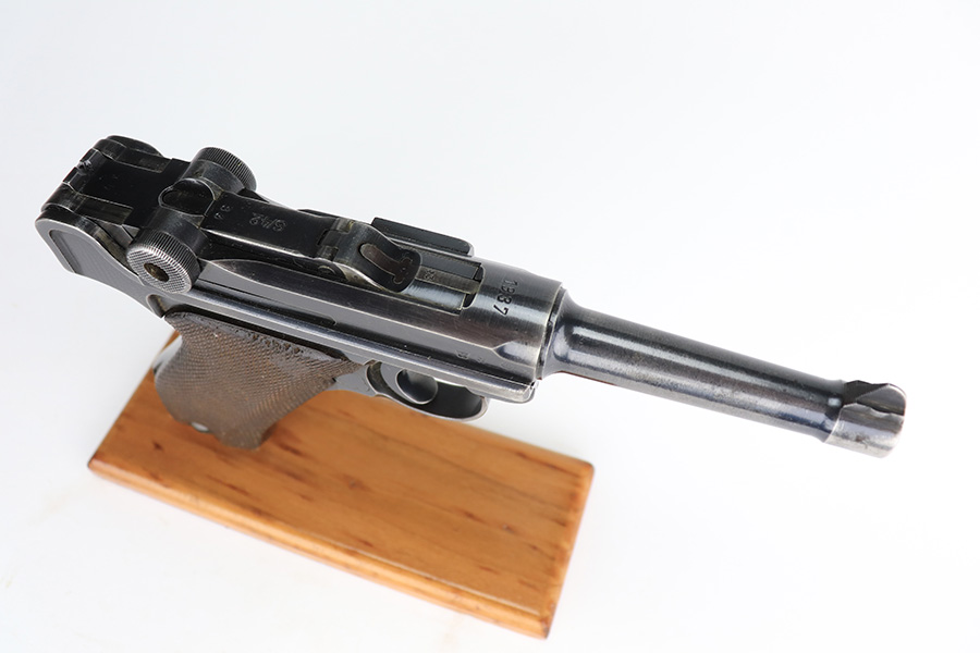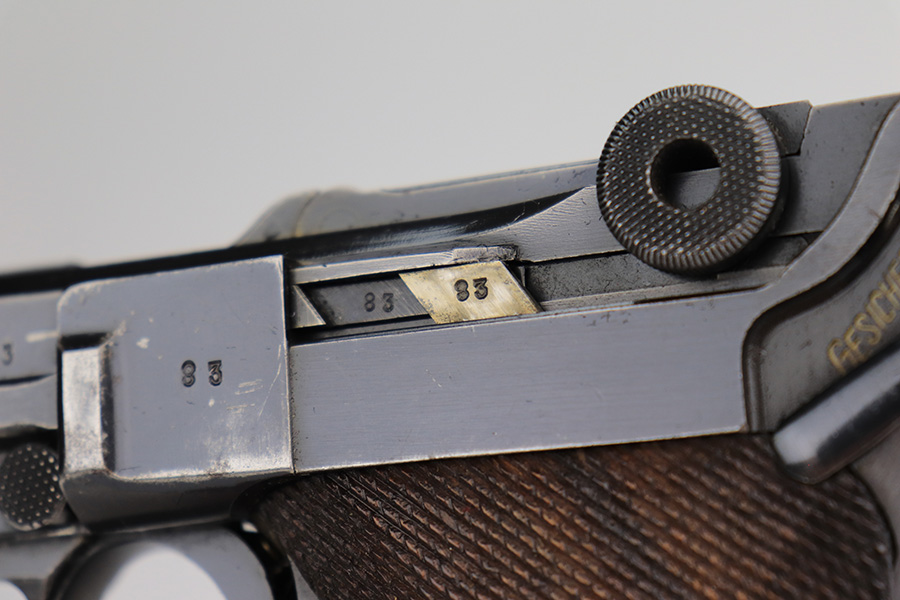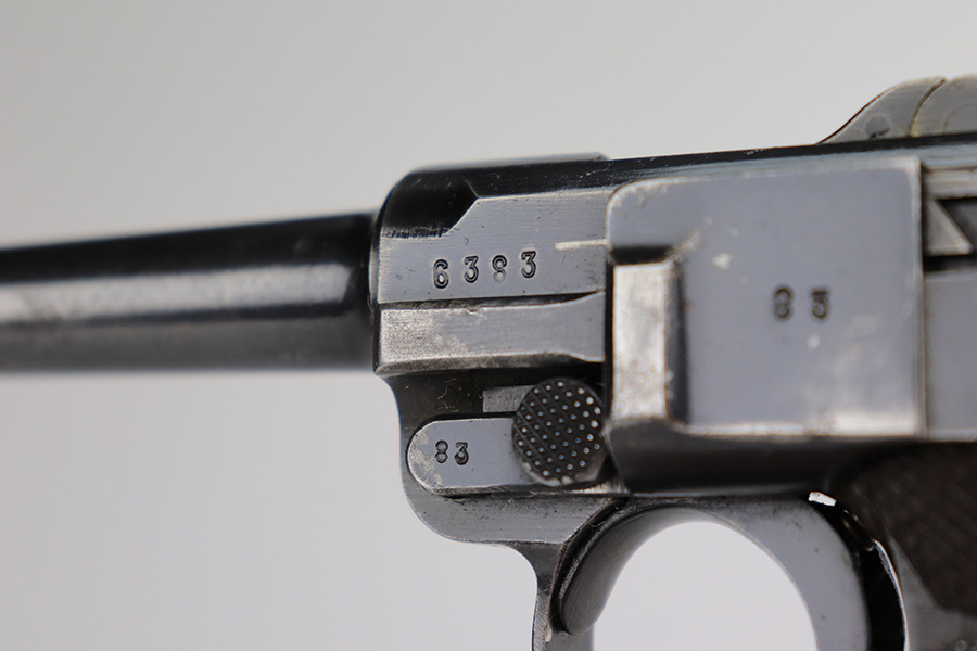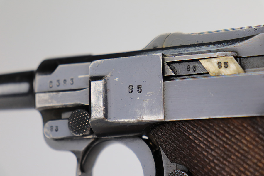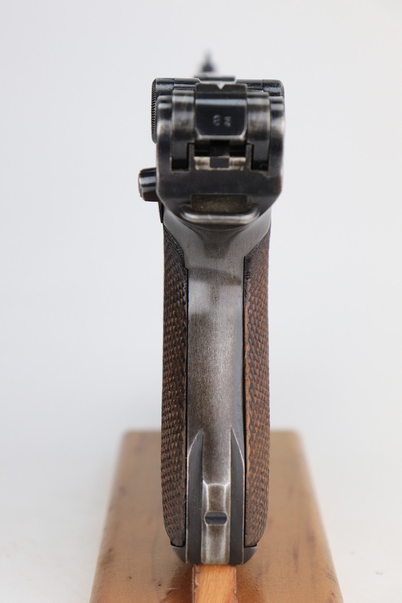 1/11/23 – This is a nice example of a Mauser Luger issued to the Nazi military in 1937. It is all matching and has the proper “Eagle 63” military acceptance proofs. This one is transitional, because it has blued small parts – 1937 is the year they transitioned from strawed to blued small parts. It also comes with one original matching-numbered magazine. The gun itself has retained roughly 85% of its original finish. The majority of the finish loss is on the grip straps and along the barrel. But there is also wear on the side plate, on the side rails, and around the muzzle. Fitted with a nice set of wood grips – the right panel is numbered and matching and has a name written in marker. The left panel is un-numbered. The bore has strong rifling, but there is light frosting in the grooves.